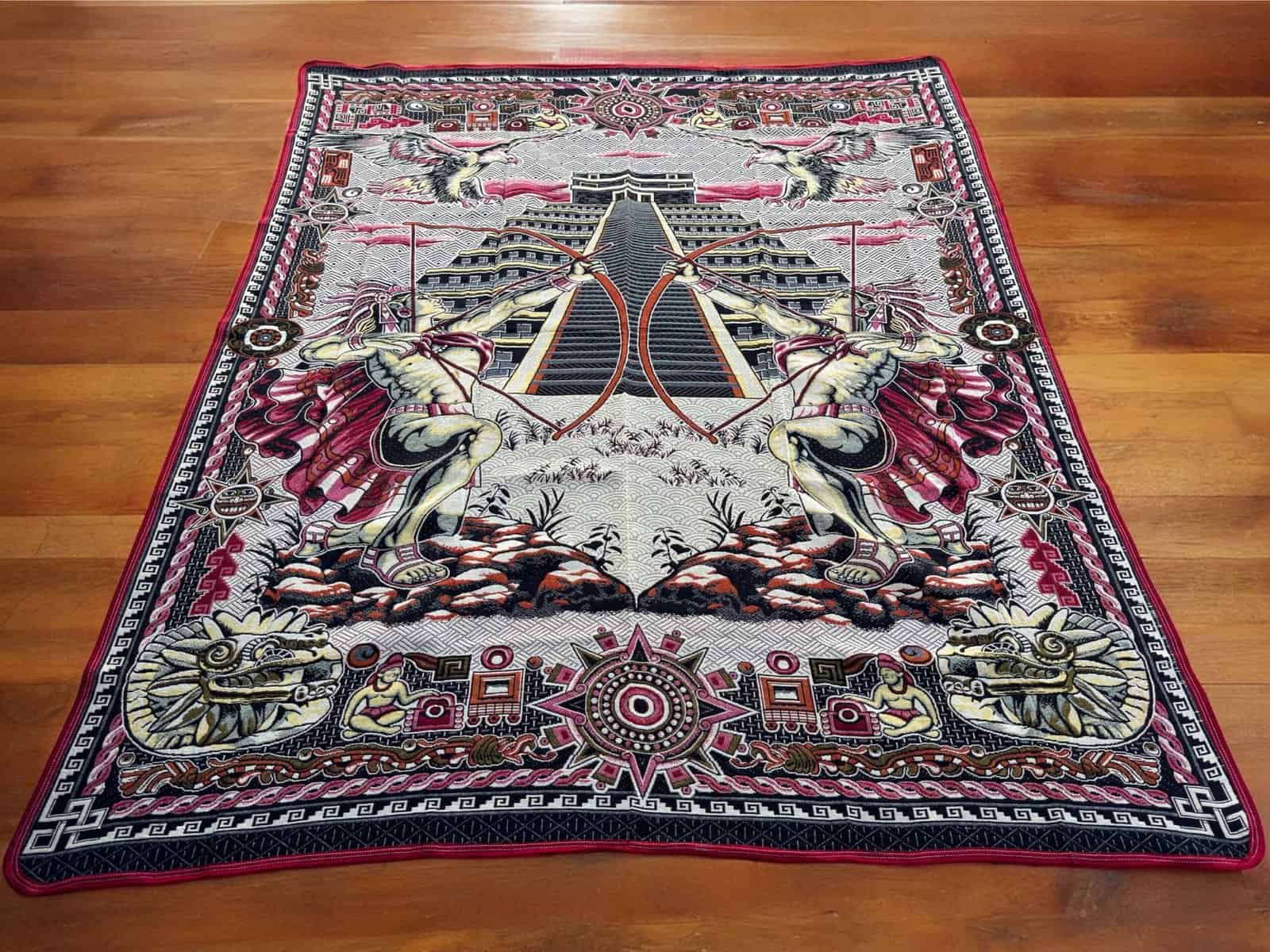 This unique blanket features a vibrant and intricate design inspired by ancient Aztec mythology and architecture. The central imagery showcases Aztec warriors in a dynamic pose, set against a backdrop of a grand pyramid structure, reminiscent of the famous temples found in Mesoamerican cultures. The warriors are depicted with detailed attire and weapons, emphasizing their importance in Aztec society as protectors and heroes.