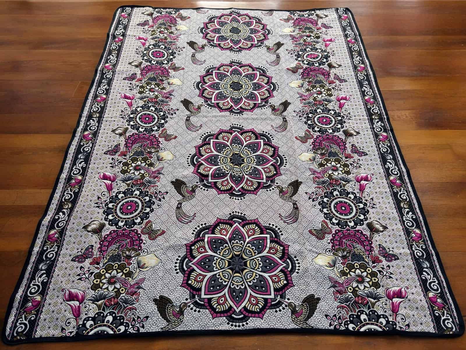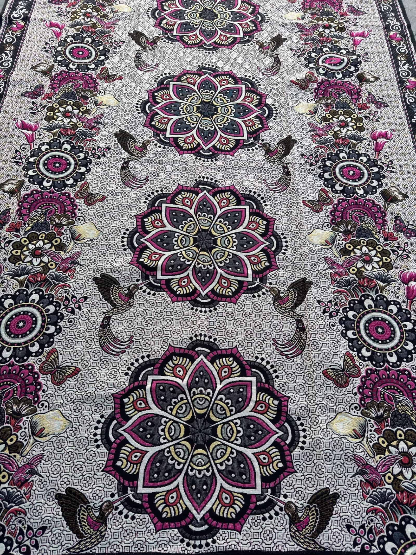 This exquisite tapestry, crafted with precision in Mexico, features a mesmerizing mandala design, a spiritual and ritual symbol in Hinduism and Buddhism that represents the universe. The central focus of the tapestry is a series of mandalas, each intricately detailed and uniquely patterned, creating a visually stunning array of symmetry and complexity. These mandalas are adorned with floral motifs and traditional geometric patterns, which echo the sacred artistry found in ancient temples.