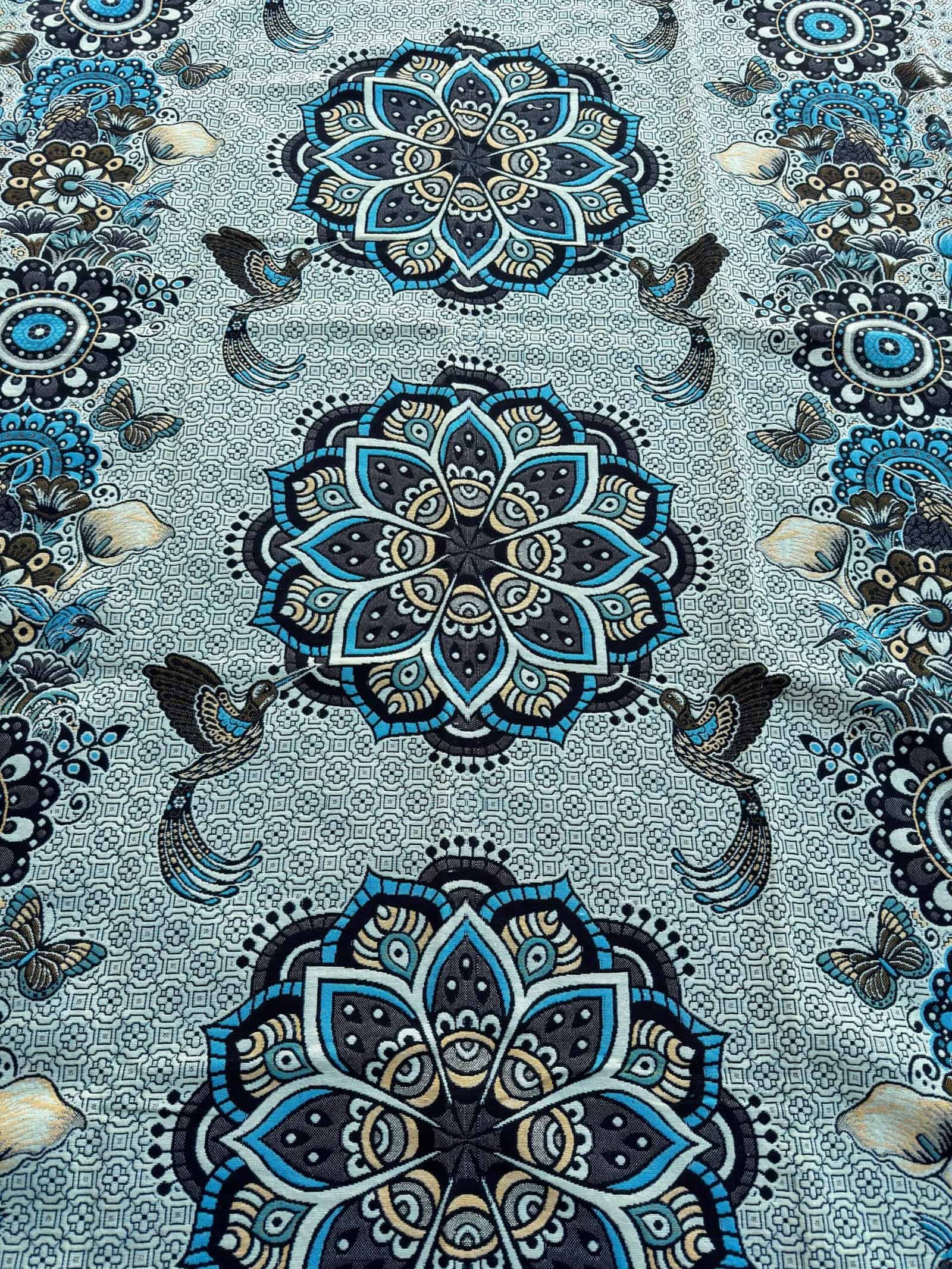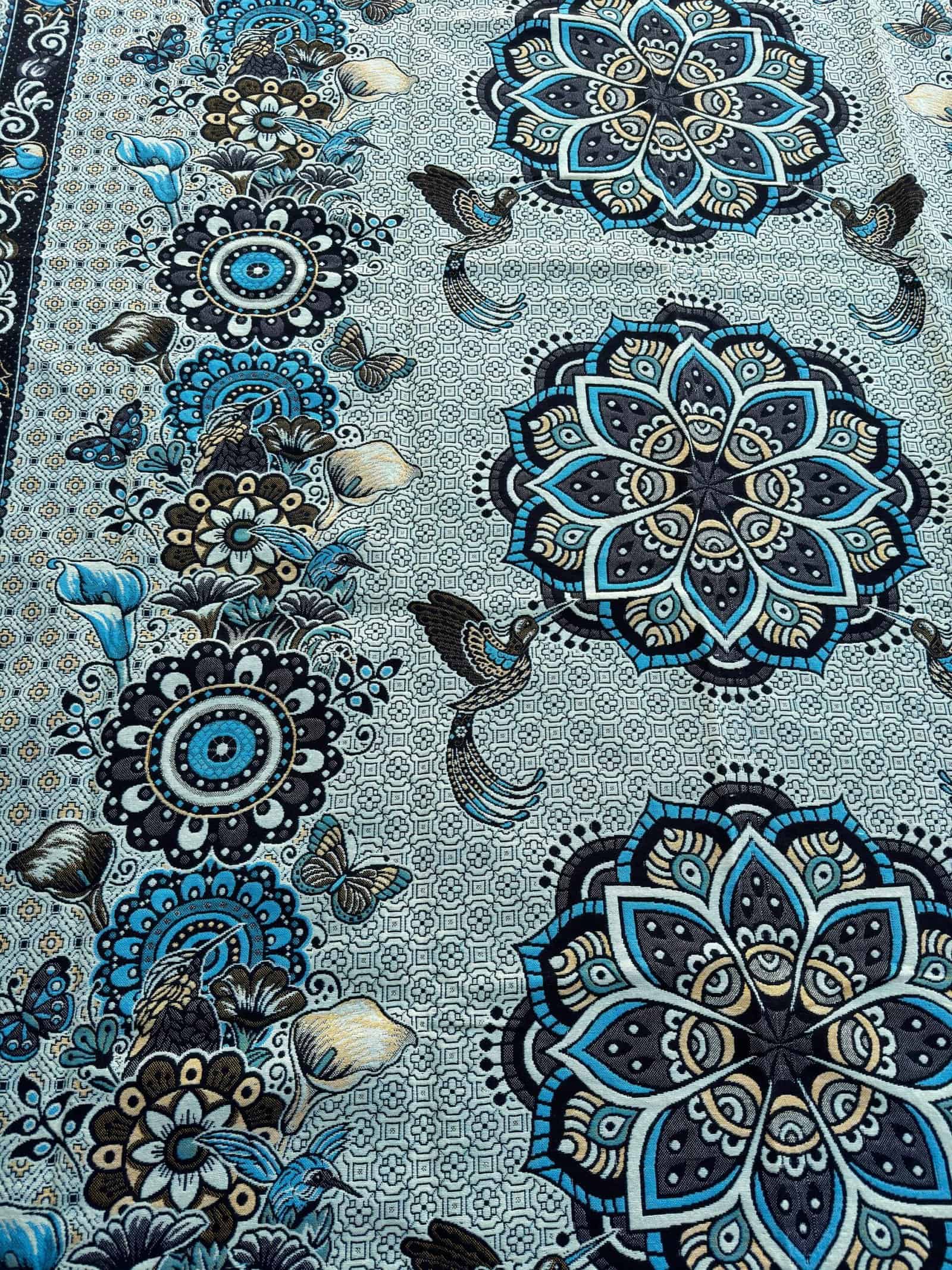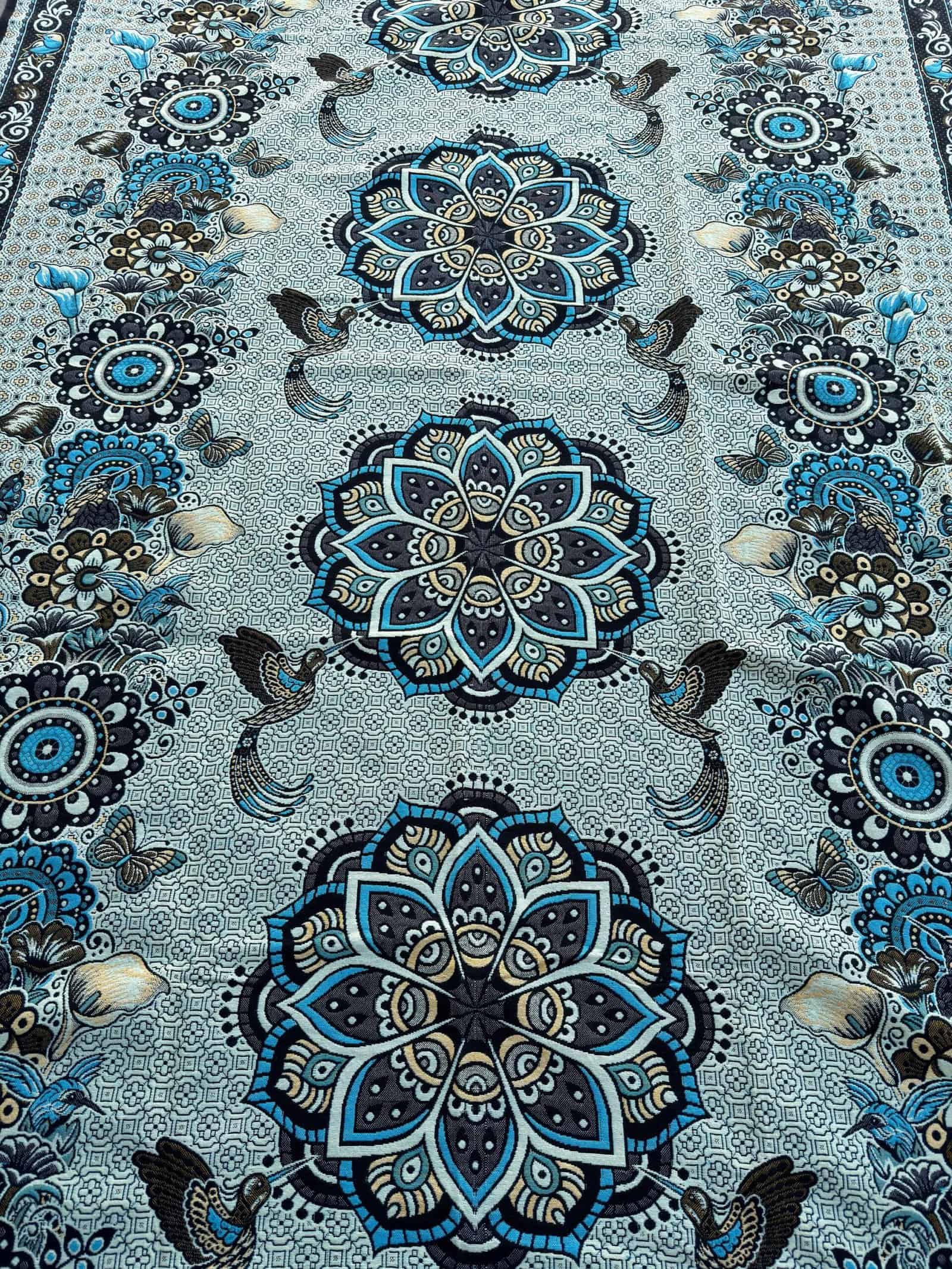 This exquisite tapestry, crafted with precision in Mexico, features a mesmerizing mandala design, a spiritual and ritual symbol in Hinduism and Buddhism that represents the universe. The central focus of the tapestry is a series of mandalas, each intricately detailed and uniquely patterned, creating a visually stunning array of symmetry and complexity. These mandalas are adorned with floral motifs and traditional geometric patterns, which echo the sacred artistry found in ancient temples.