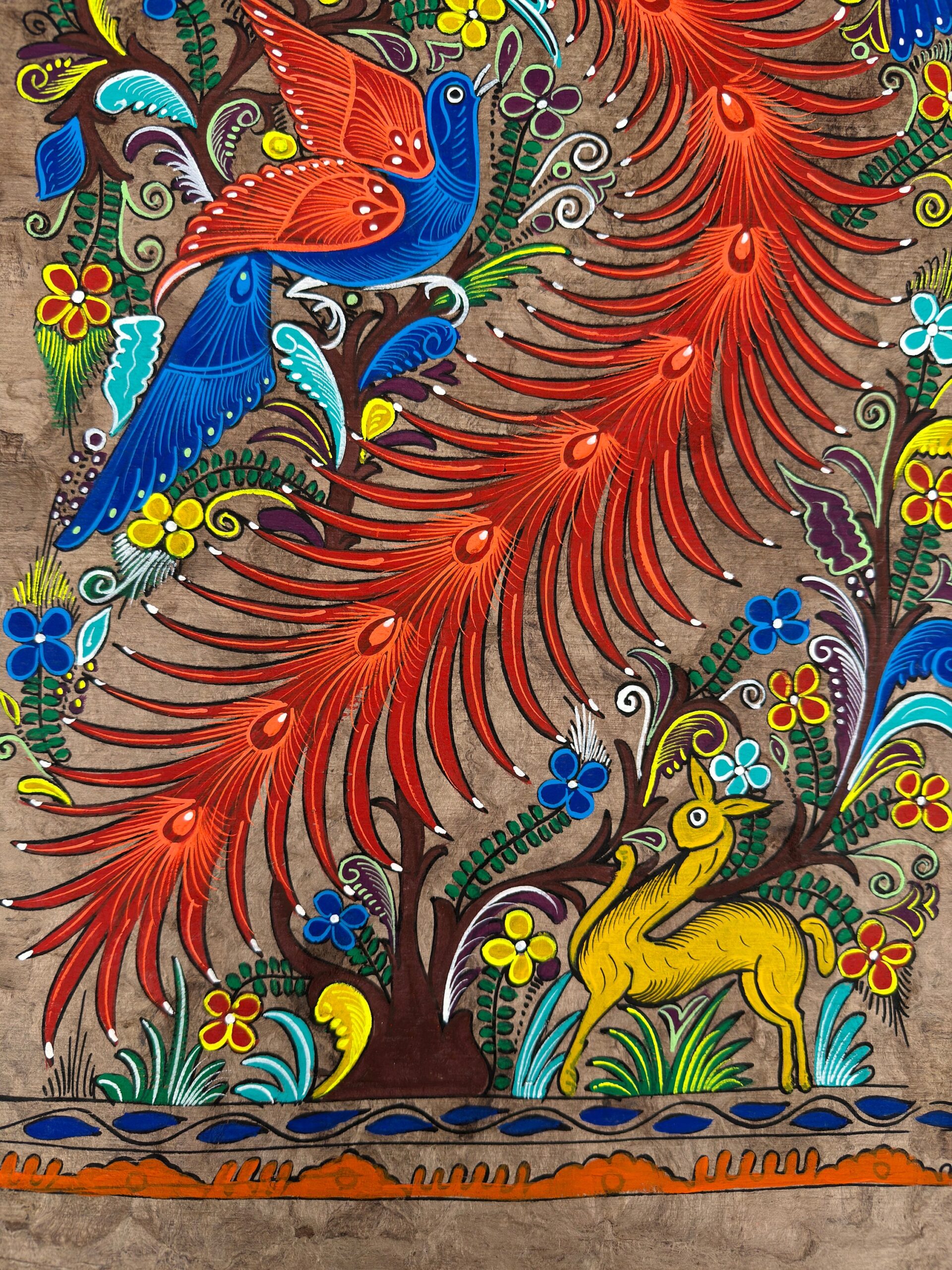 This colorful painting is hand painted on bark paper in Mexico.