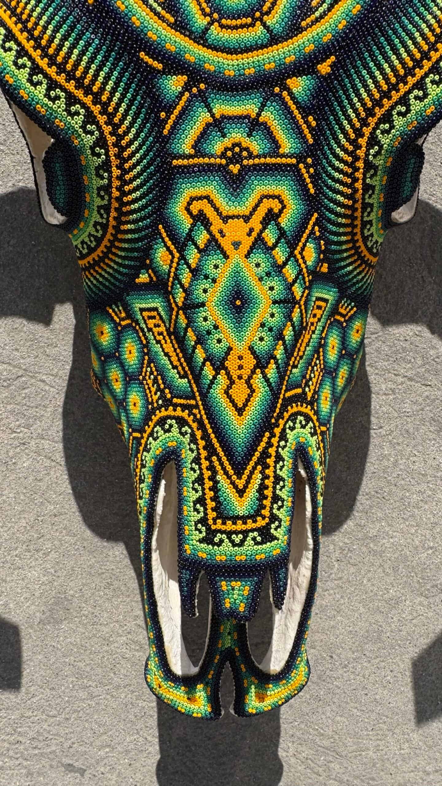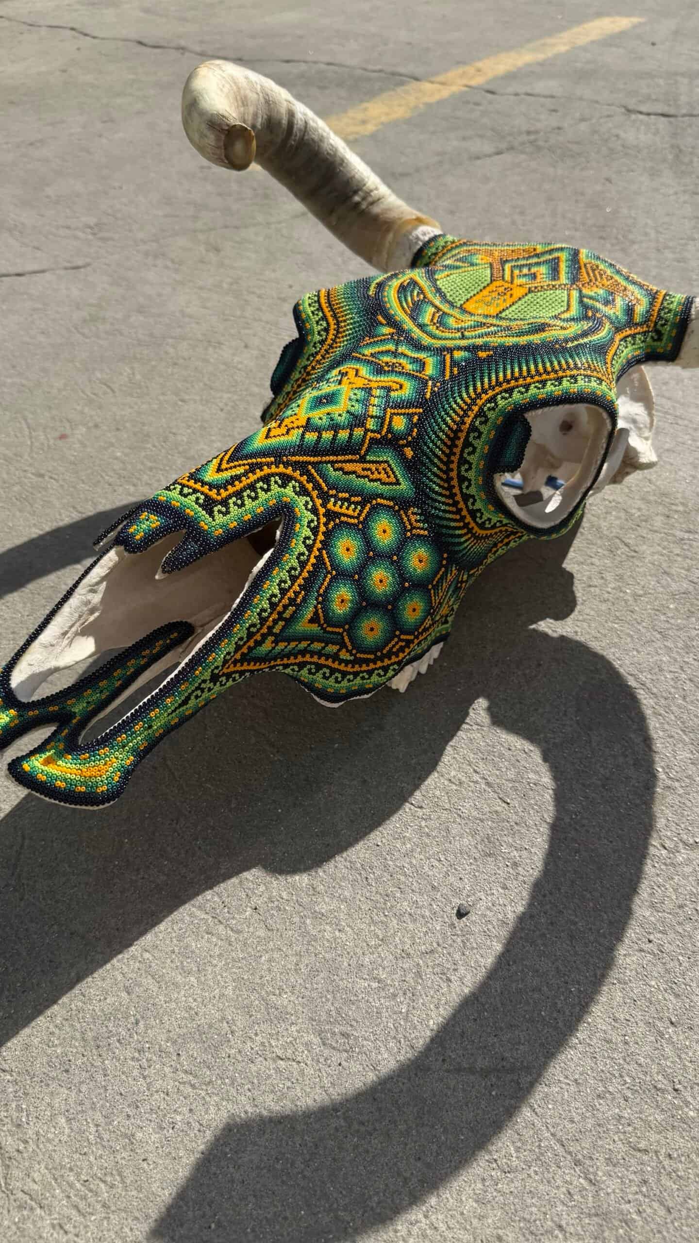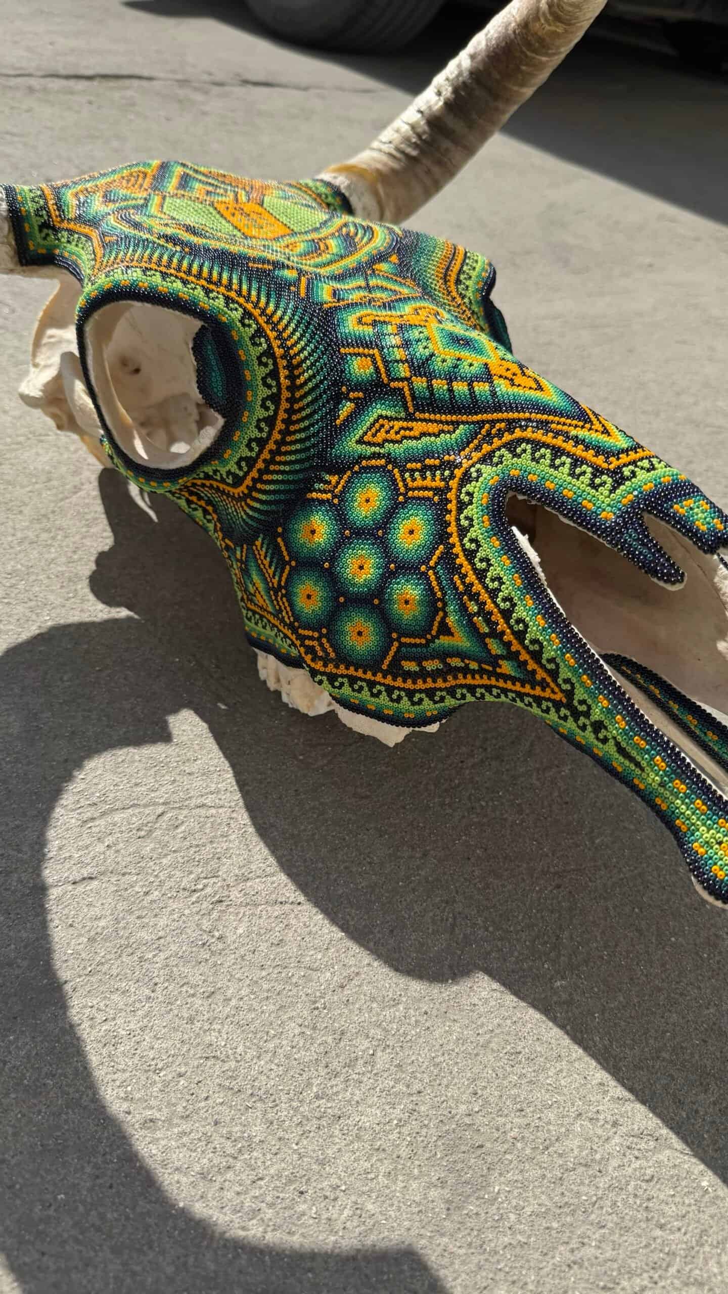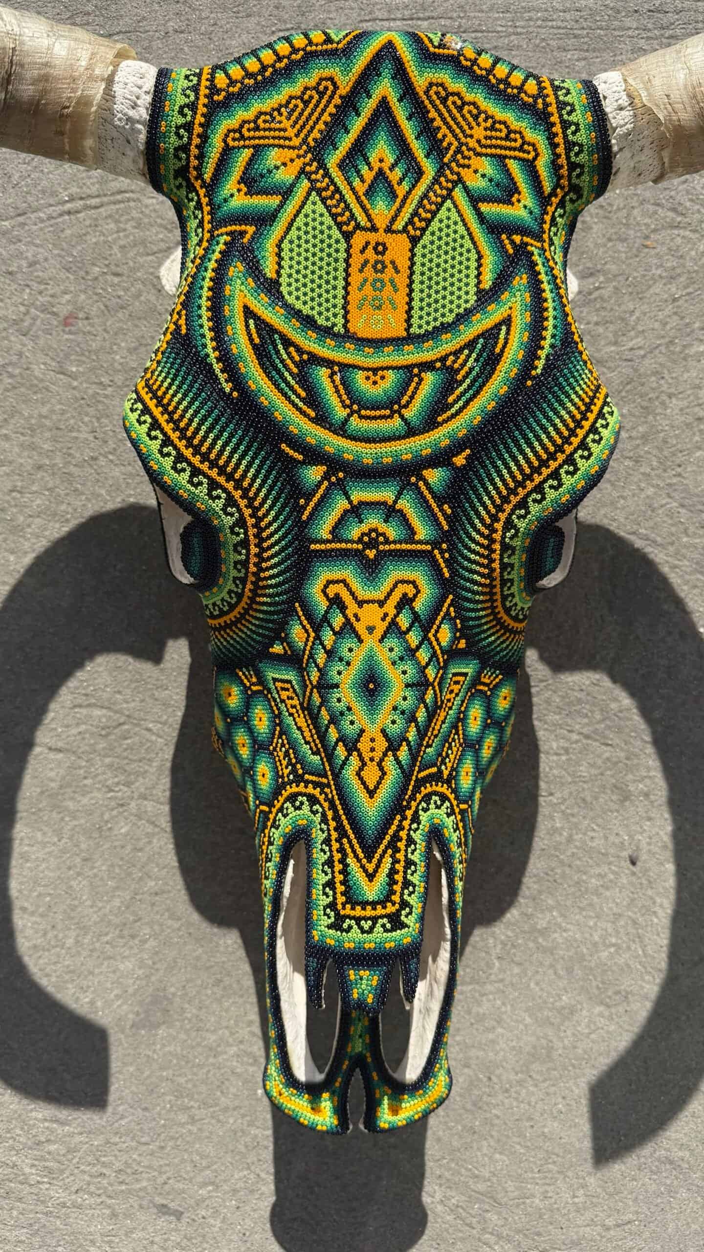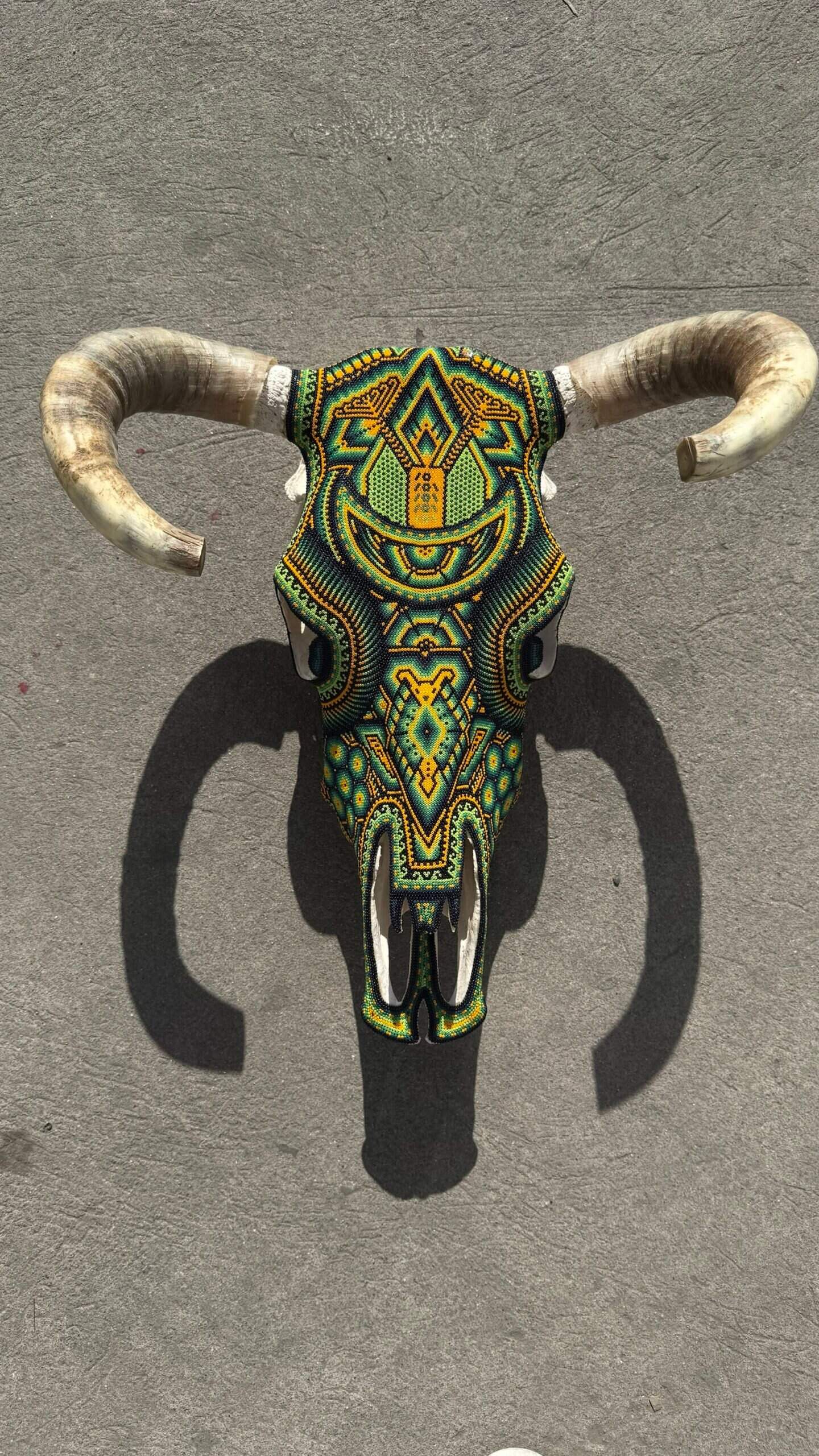 “ Bighorn Bull head wall sculpture” Huichol culture and Wixarica art “WE DO CUSTOMIZE ORDERS” Item Description * Mexican art from Mexico * Handmade by indigenous Mexicans * Measures: 18.5” wide, 24” tall * You can HANG in the wall * Horns travel detached Item details * Technique: crystal micro beads on real skull * Unique piece Order carefully, we will pack ✅ Express shipping is available for an additional charge, please ask ✅ You can send this with a special dedication✅ It can be sent with a special wrapping as a gift ✅ Any questions please do not hesitate, we usually respond in less than an hour 😀 Wixárika Huichol bead art is a traditional form of art practiced by the Wixárika people of western Mexico. This intricate art form involves applying small glass or plastic beads to a surface, such as a wooden or gourd object, using beeswax or resin as an adhesive. The designs used in Wixárika bead art are often highly symbolic and reflect the cosmology and spiritual beliefs of the Wixárika people. Common motifs include depictions of the sun, moon, stars, and animals such as deer and snakes, which are considered sacred. The colors used in Wixárika bead art also have symbolic meaning. For example, blue is associated with the ocean and the sky, while green represents the earth and the natural world. Wixárika bead art is a time-consuming and labor-intensive process, with each piece requiring hours or even days to complete. The art form has gained international recognition and is now sold in markets and galleries throughout Mexico and beyond. However, it is important to note that the commercialization of Wixárika bead art has also led to issues of cultural appropriation and exploitation, with some artists and sellers profiting from the art without proper acknowledgement or compensation to the Wixárika people who originated it.