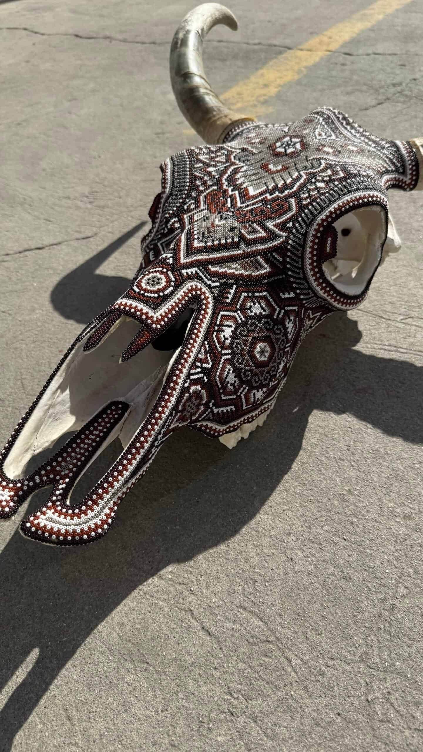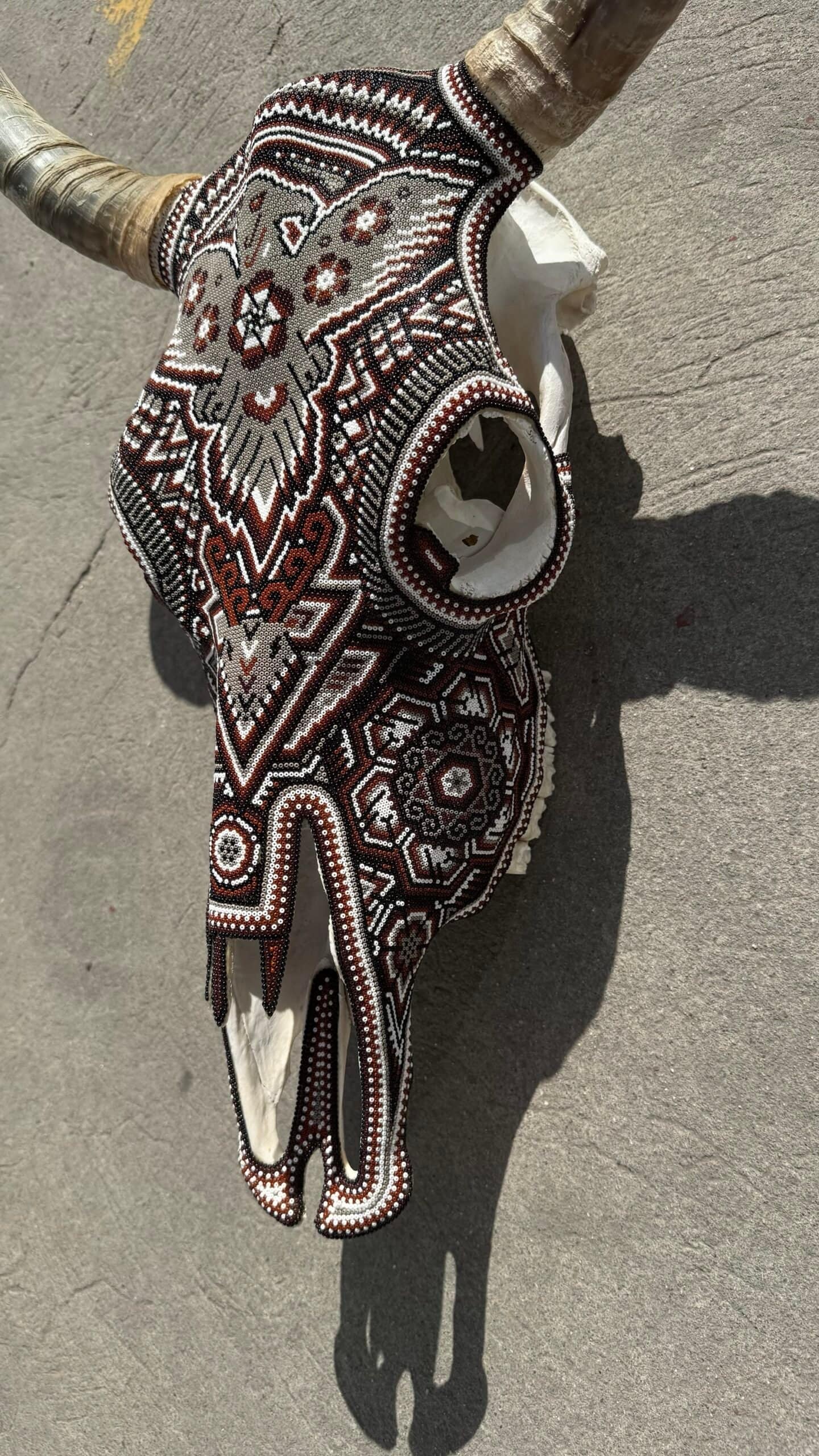 “ Bighorn Bull head wall sculpture” Huichol culture and Wixarica art “WE DO CUSTOMIZE ORDERS” Item Description * Mexican art from Mexico * Handmade by indigenous Mexicans * Measures: 18.5” wide, 24” tall * You can HANG in the wall * Horns travel detached Item details * Technique: crystal micro beads on real skull * Unique piece Order carefully, we will pack ✅ Express shipping is available for an additional charge, please ask ✅ You can send this with a special dedication✅ It can be sent with a special wrapping as a gift ✅ Any questions please do not hesitate, we usually respond in less than an hour 😀 Wixárika Huichol bead art is a traditional form of art practiced by the Wixárika people of western Mexico. This intricate art form involves applying small glass or plastic beads to a surface, such as a wooden or gourd object, using beeswax or resin as an adhesive. The designs used in Wixárika bead art are often highly symbolic and reflect the cosmology and spiritual beliefs of the Wixárika people. Common motifs include depictions of the sun, moon, stars, and animals such as deer and snakes, which are considered sacred. The colors used in Wixárika bead art also have symbolic meaning. For example, blue is associated with the ocean and the sky, while green represents the earth and the natural world. Wixárika bead art is a time-consuming and labor-intensive process, with each piece requiring hours or even days to complete. The art form has gained international recognition and is now sold in markets and galleries throughout Mexico and beyond. However, it is important to note that the commercialization of Wixárika bead art has also led to issues of cultural appropriation and exploitation, with some artists and sellers profiting from the art without proper acknowledgement or compensation to the Wixárika people who originated it.