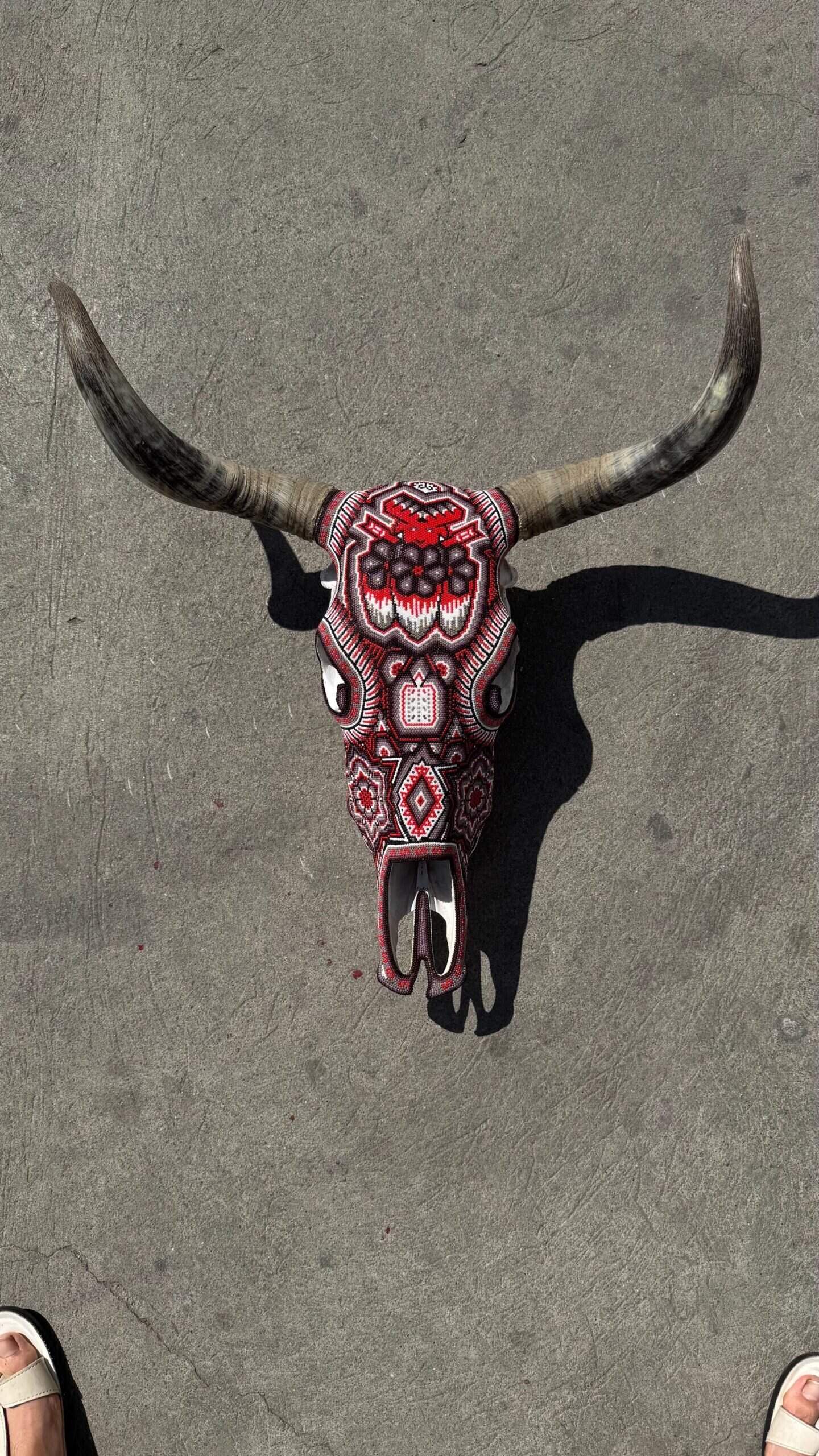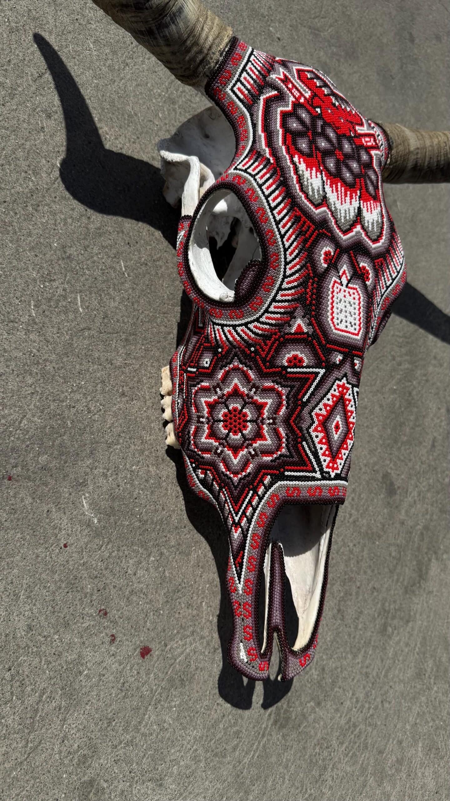 “ Bighorn Bull head wall sculpture” Huichol culture and Wixarica art “WE DO CUSTOMIZE ORDERS” Item Description * Mexican art from Mexico * Handmade by indigenous Mexicans * Measures: 18.5” wide, 24” tall * You can HANG in the wall * Horns travel detached Item details * Technique: crystal micro beads on real skull * Unique piece Order carefully, we will pack ✅ Express shipping is available for an additional charge, please ask ✅ You can send this with a special dedication✅ It can be sent with a special wrapping as a gift ✅ Any questions please do not hesitate, we usually respond in less than an hour 😀 Wixárika Huichol bead art is a traditional form of art practiced by the Wixárika people of western Mexico. This intricate art form involves applying small glass or plastic beads to a surface, such as a wooden or gourd object, using beeswax or resin as an adhesive. The designs used in Wixárika bead art are often highly symbolic and reflect the cosmology and spiritual beliefs of the Wixárika people. Common motifs include depictions of the sun, moon, stars, and animals such as deer and snakes, which are considered sacred. The colors used in Wixárika bead art also have symbolic meaning. For example, blue is associated with the ocean and the sky, while green represents the earth and the natural world. Wixárika bead art is a time-consuming and labor-intensive process, with each piece requiring hours or even days to complete. The art form has gained international recognition and is now sold in markets and galleries throughout Mexico and beyond. However, it is important to note that the commercialization of Wixárika bead art has also led to issues of cultural appropriation and exploitation, with some artists and sellers profiting from the art without proper acknowledgement or compensation to the Wixárika people who originated it.