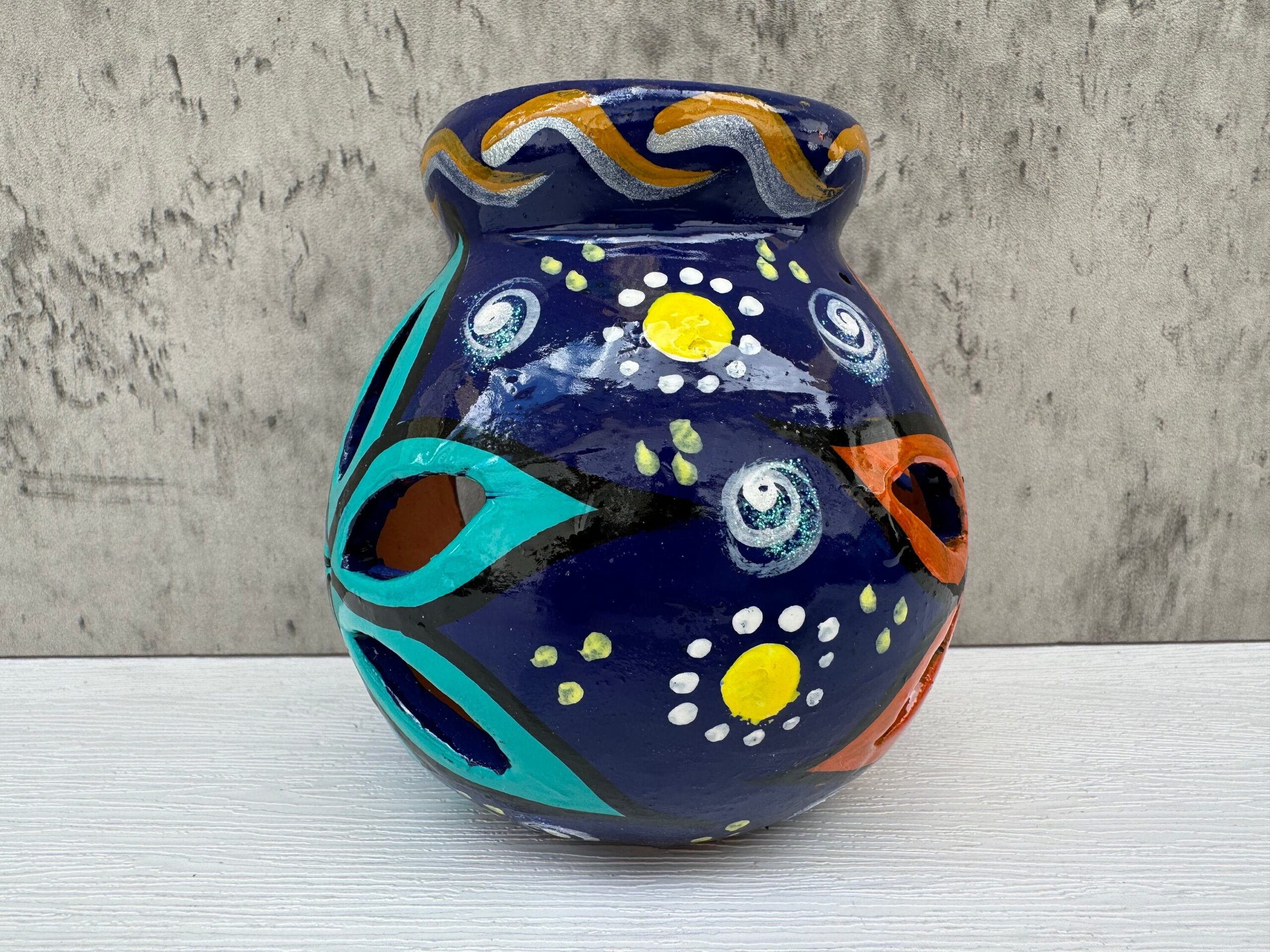 Bring a touch of authentic Mexican artistry into your home with this hand-painted clay candleholder. Expertly crafted by skilled artisans, each piece embodies a unique blend of tradition and creativity. The natural clay construction offers a warm, rustic feel, while the hand-painted designs showcase the intricate craftsmanship that has been passed down through generations. Ideal for creating a cozy, ambient atmosphere, this candleholder is perfect for any room in your home. Whether you’re looking to enhance your living space or searching for a thoughtful, handmade gift, this candleholder is a versatile and beautiful addition. Embrace the beauty of handcrafted art and support traditional Mexican artisans with this exquisite piece. Each candleholder is a one-of-a-kind creation, reflecting the rich cultural heritage and artistic spirit of Mexico.
