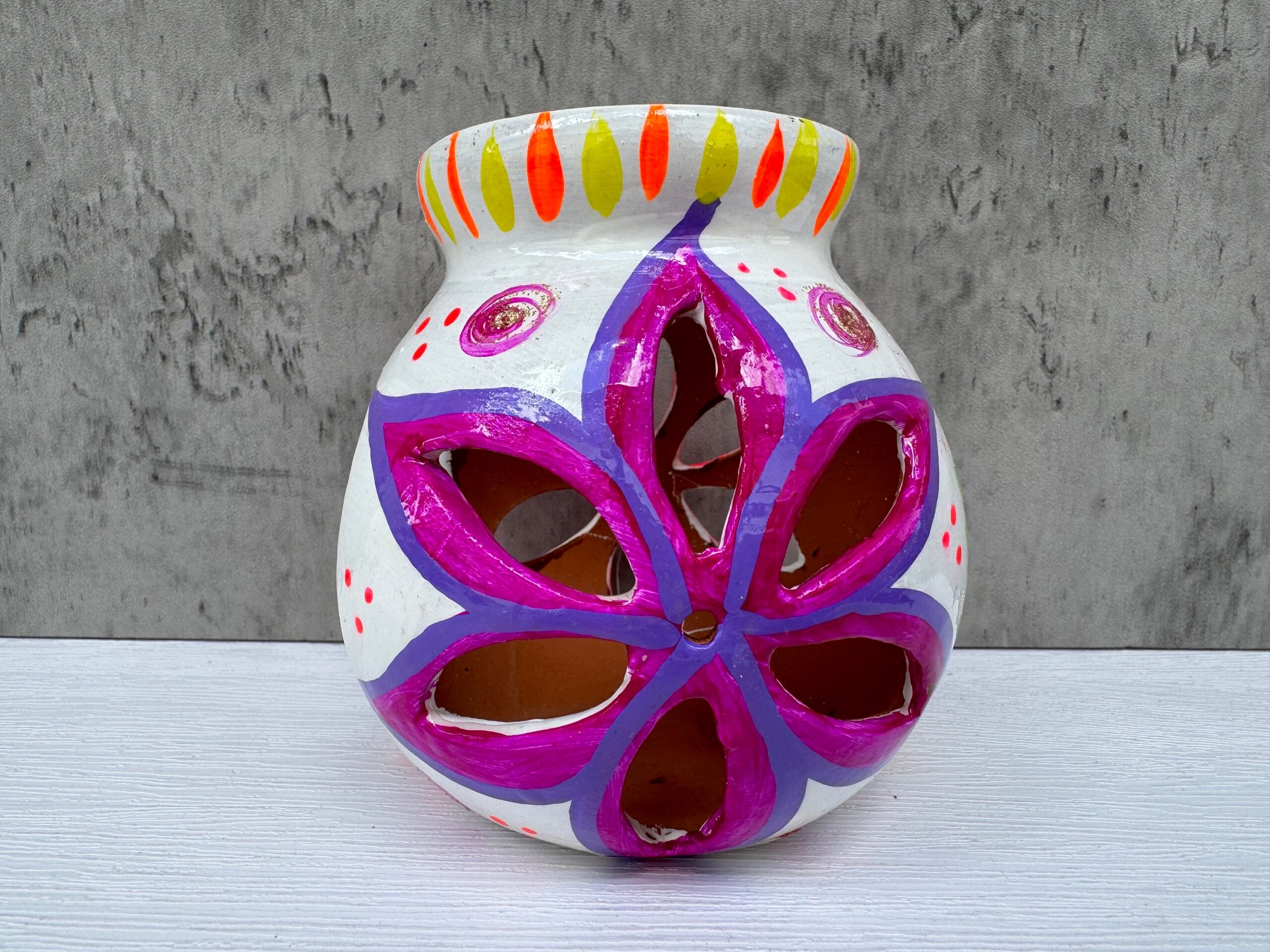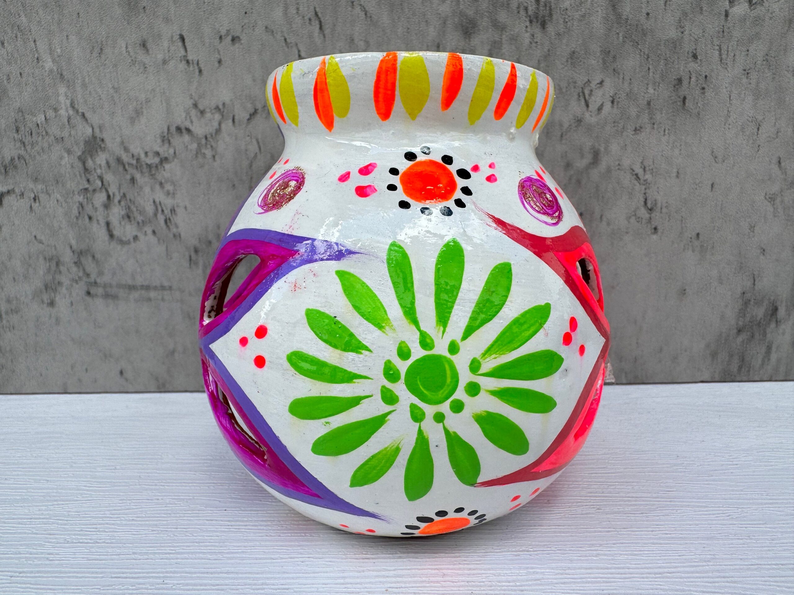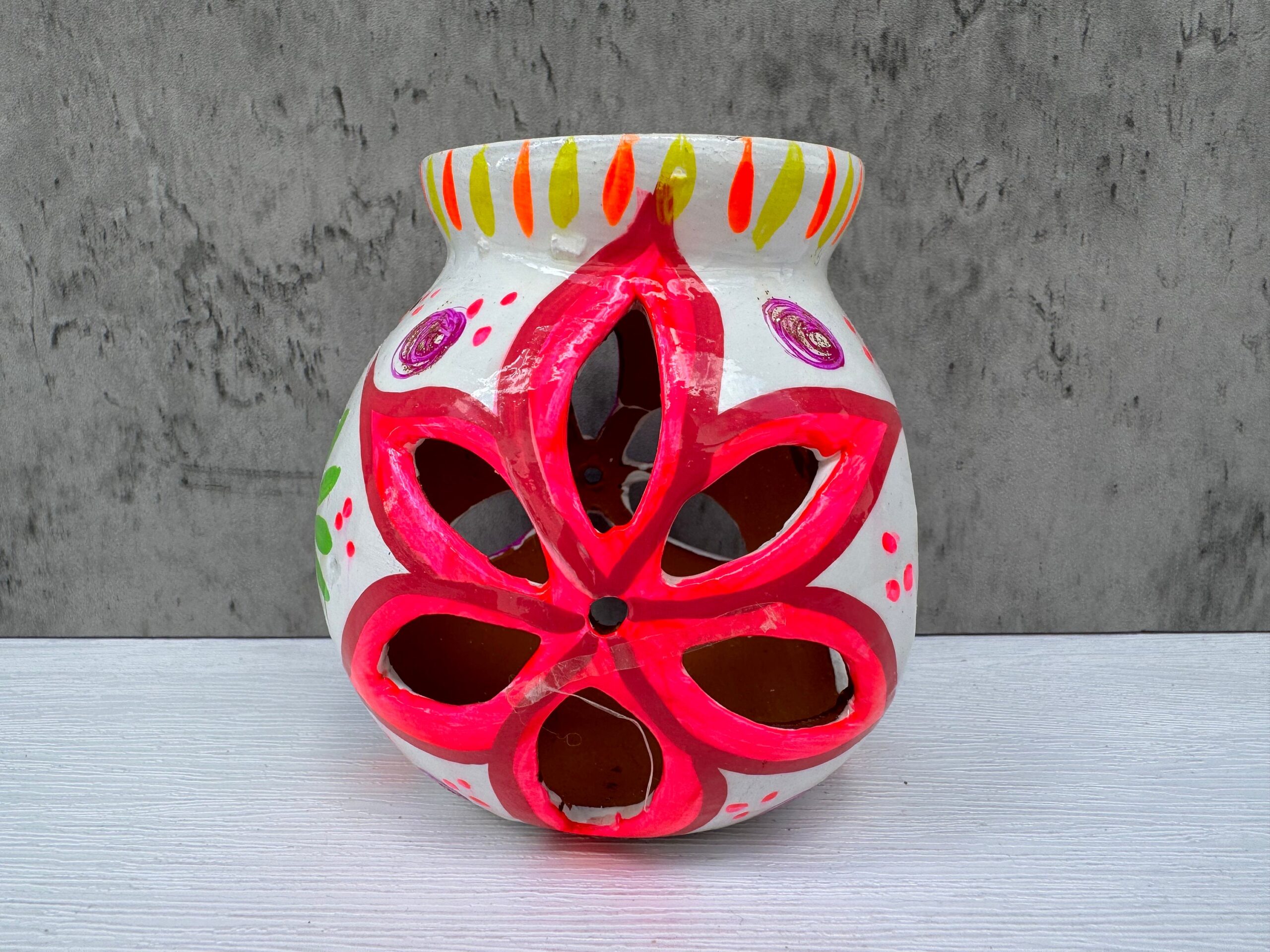 Bring a touch of authentic Mexican artistry into your home with this hand-painted clay candleholder. Expertly crafted by skilled artisans, each piece embodies a unique blend of tradition and creativity. The natural clay construction offers a warm, rustic feel, while the hand-painted designs showcase the intricate craftsmanship that has been passed down through generations. Ideal for creating a cozy, ambient atmosphere, this candleholder is perfect for any room in your home. Whether you’re looking to enhance your living space or searching for a thoughtful, handmade gift, this candleholder is a versatile and beautiful addition. Embrace the beauty of handcrafted art and support traditional Mexican artisans with this exquisite piece. Each candleholder is a one-of-a-kind creation, reflecting the rich cultural heritage and artistic spirit of Mexico.