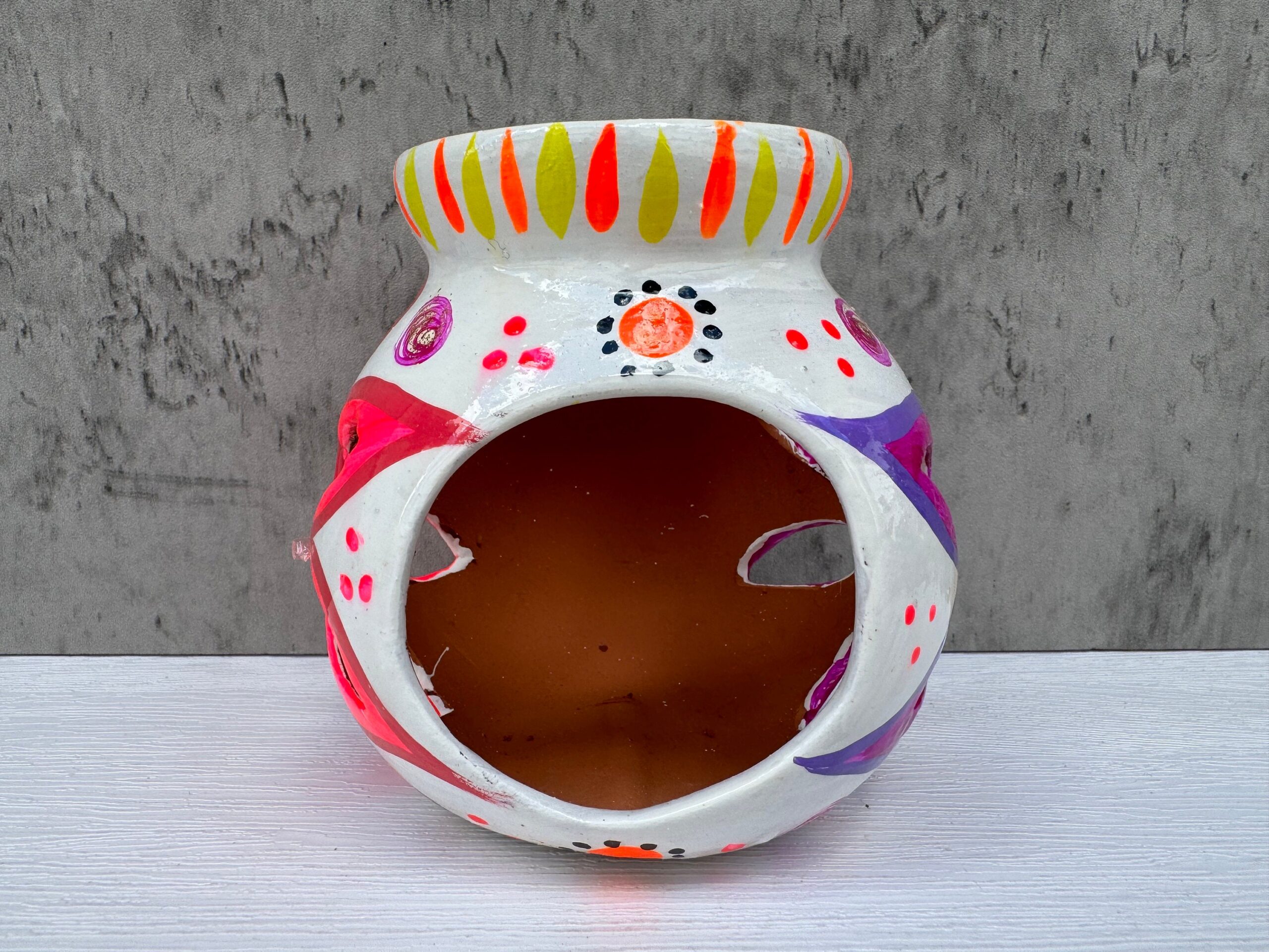 “Candleholder crafted and painted” Details: Includes (1) candleholder Size: 3.2” tall Material: natural clay and paint