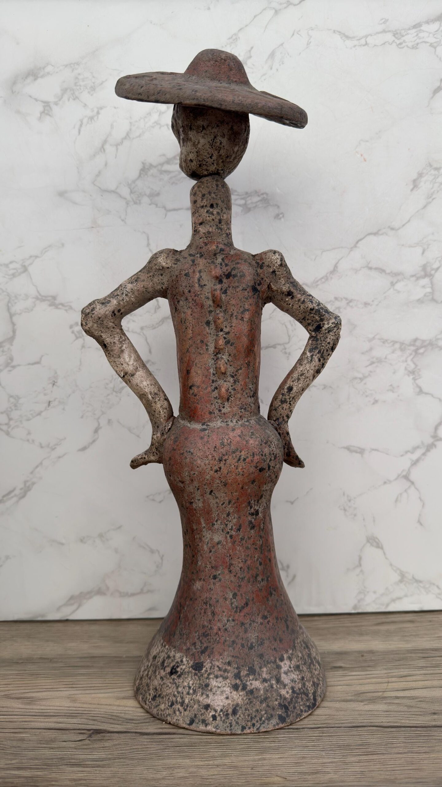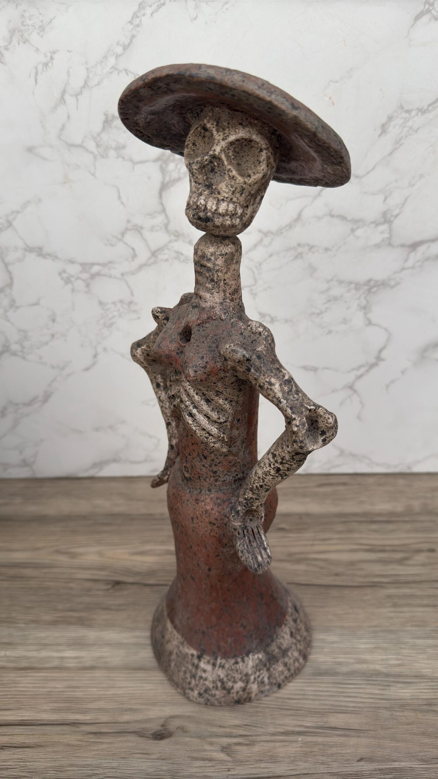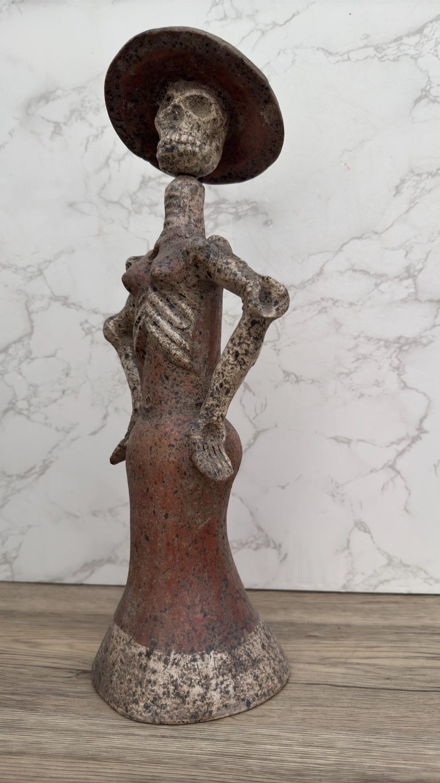 Celebrate Mexican tradition with this stunning handmade Catrina sculpture, a symbol of elegance and remembrance tied to Día de Muertos. Crafted from rustic terracotta, this skeleton lady stands with pride and poise, wearing a classic wide-brimmed hat and long dress. Each detail honors the joyful spirit with which Mexican culture embraces life and death. Perfect for altars, seasonal displays, or year-round folk art décor, this Catrina brings heritage and personality to any space. Handcrafted by Mexican artisans, no two pieces are exactly alike—making each one a unique tribute to ancestral celebration and artistic legacy. Whether as a collector’s item or meaningful gift, this clay figure is more than decoration—it’s a cultural statement of honor, beauty, and tradition. A timeless piece that connects past and present through the power of handcrafted art.