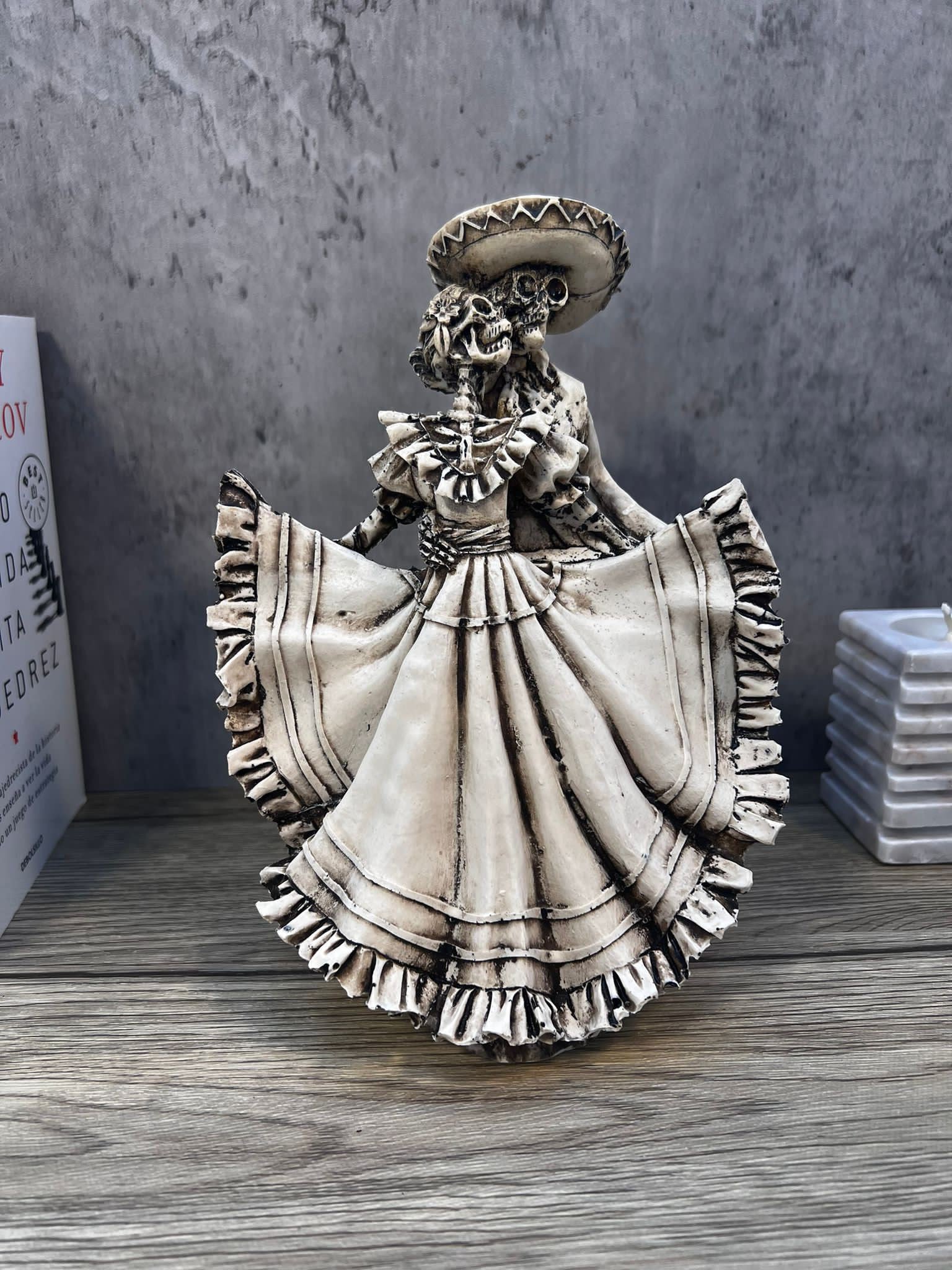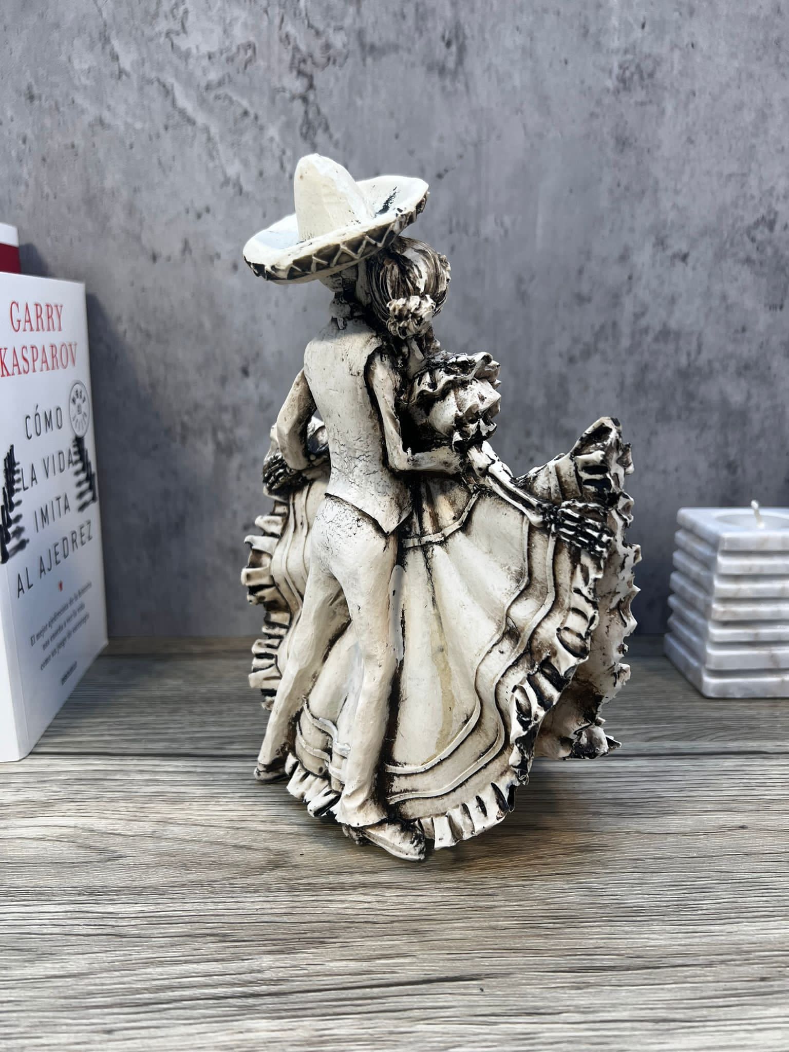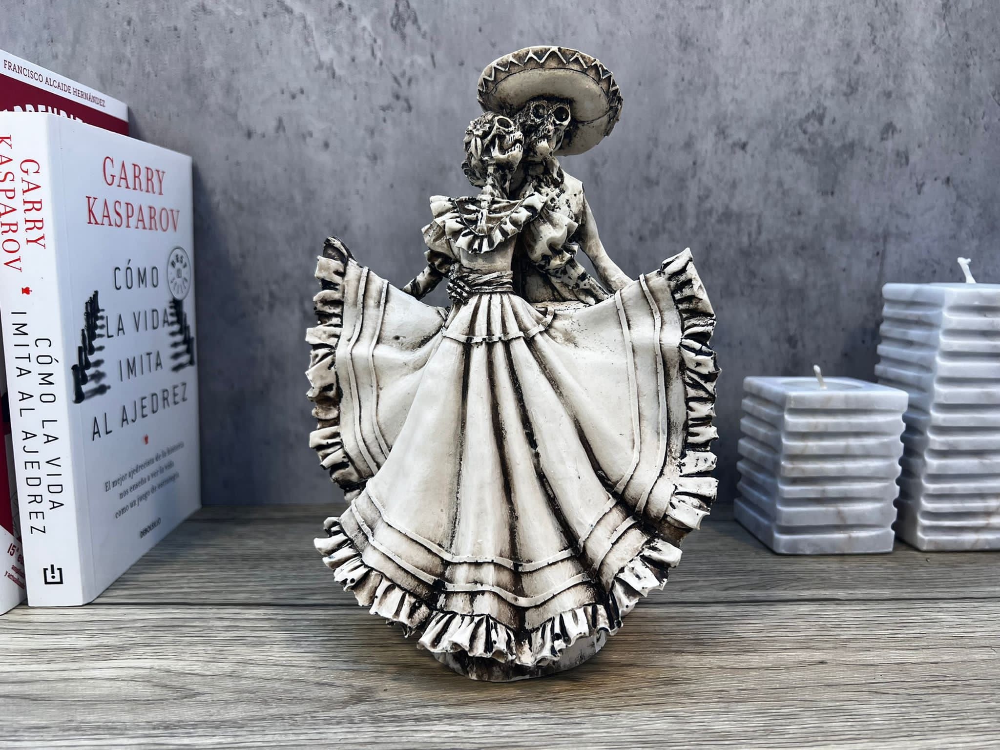 This skeleton figurine will add a mysterious and interesting look to your home, the couple is in a dancing position, they are both a mariachi skeleton
