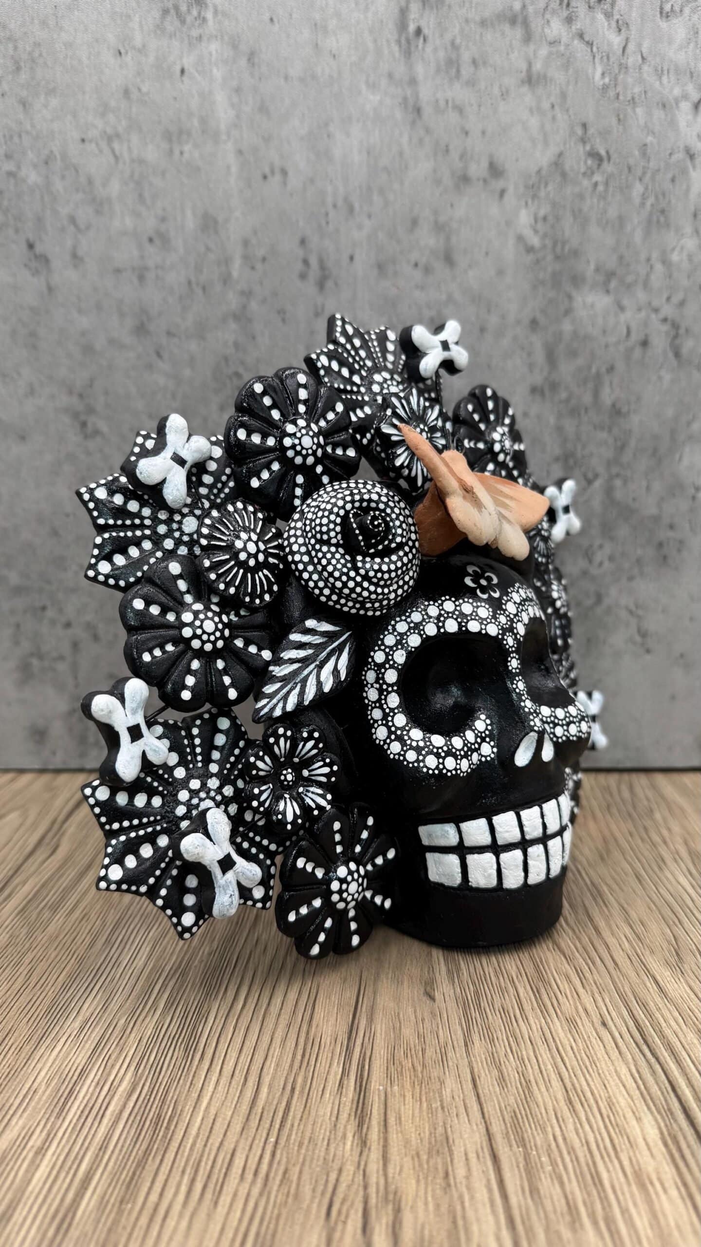 “ Sugar skull, Catrina, Mexican decoration, Day of the dead “ Clay skull with flowers decoration ideal to decorate your home or as a special gift, characteristic: – Handmade by Mexican artisans – Polychrome clay material – Dimentions Between 7” Long, 7 high 2” wide