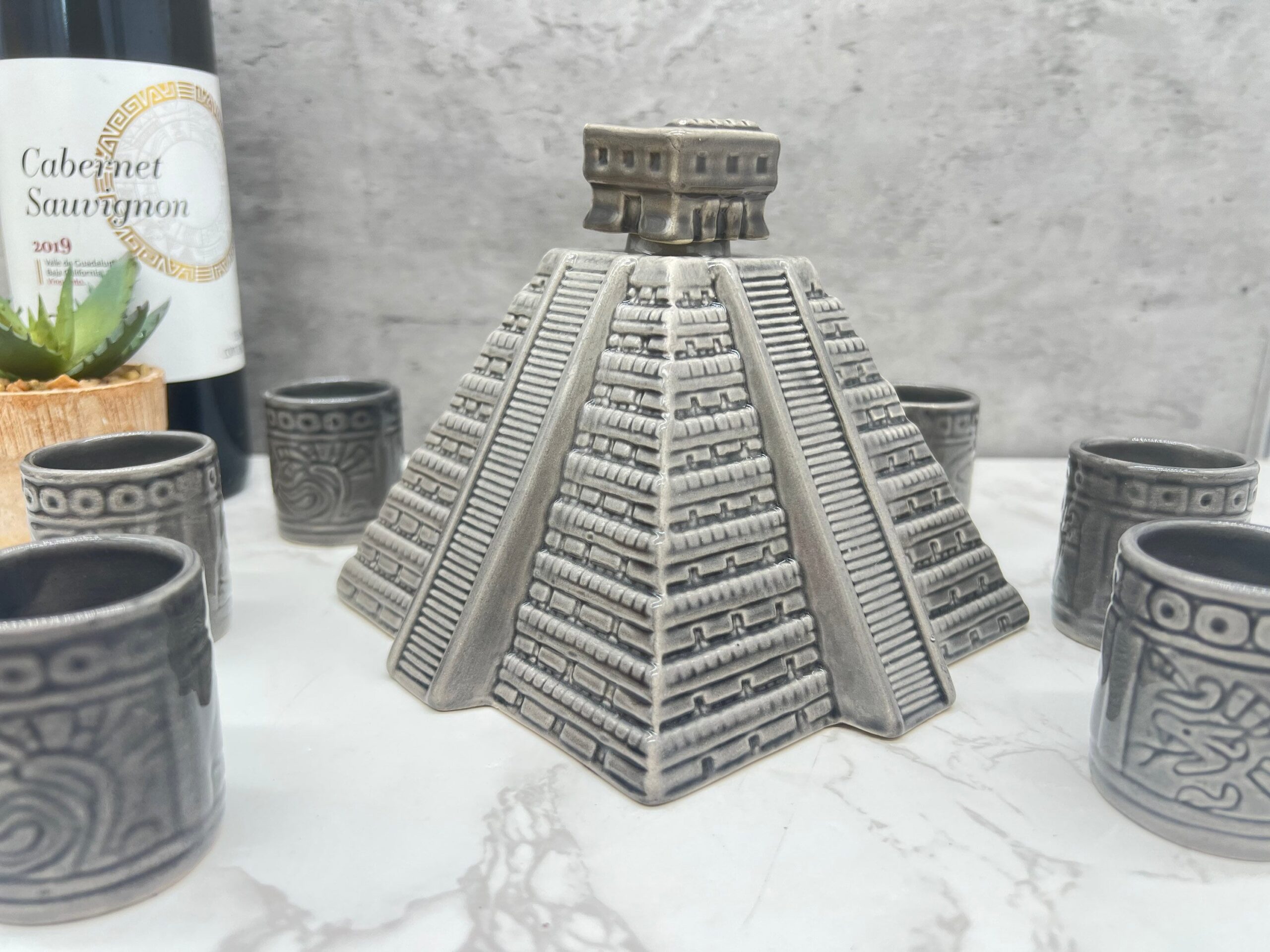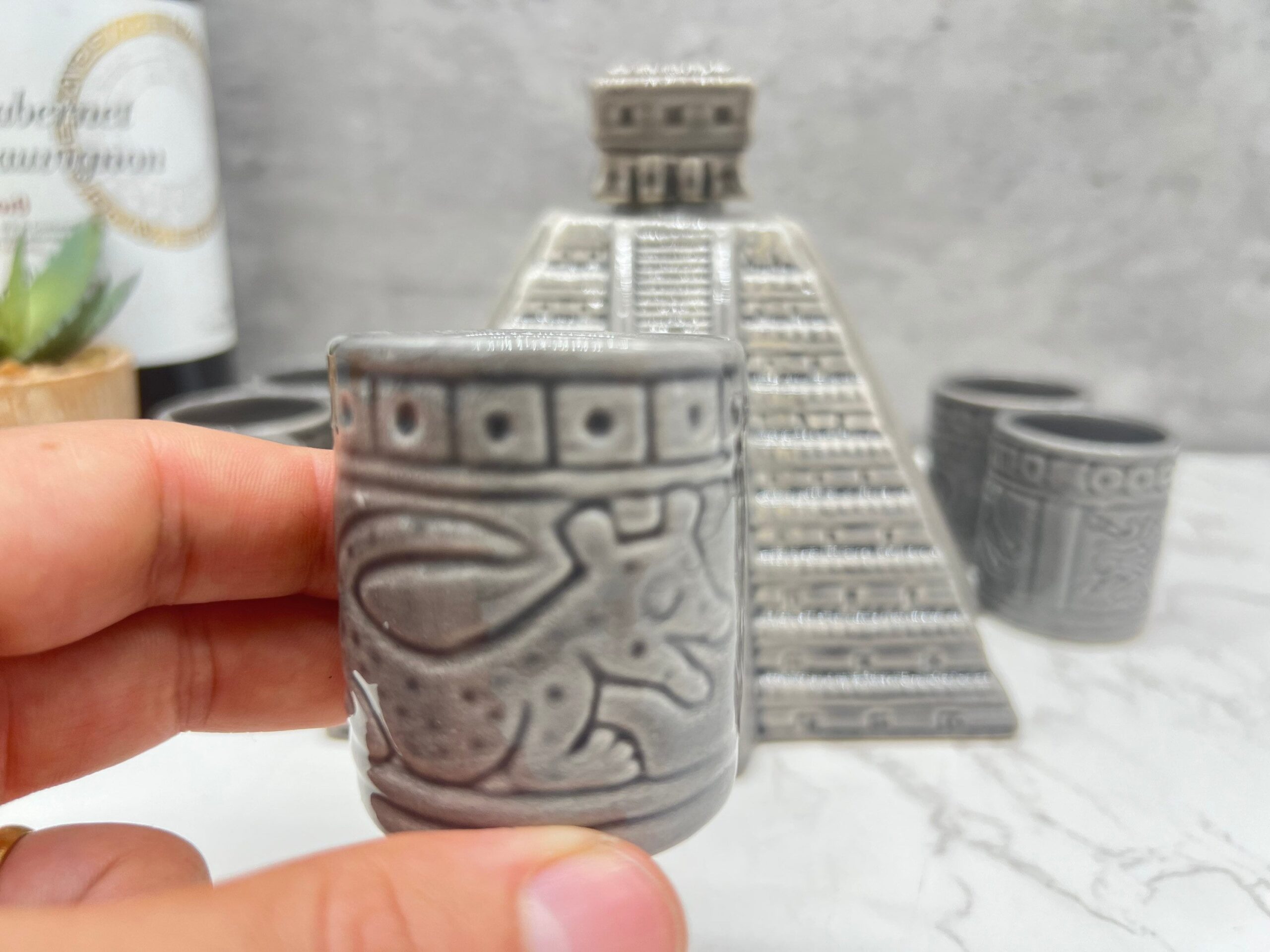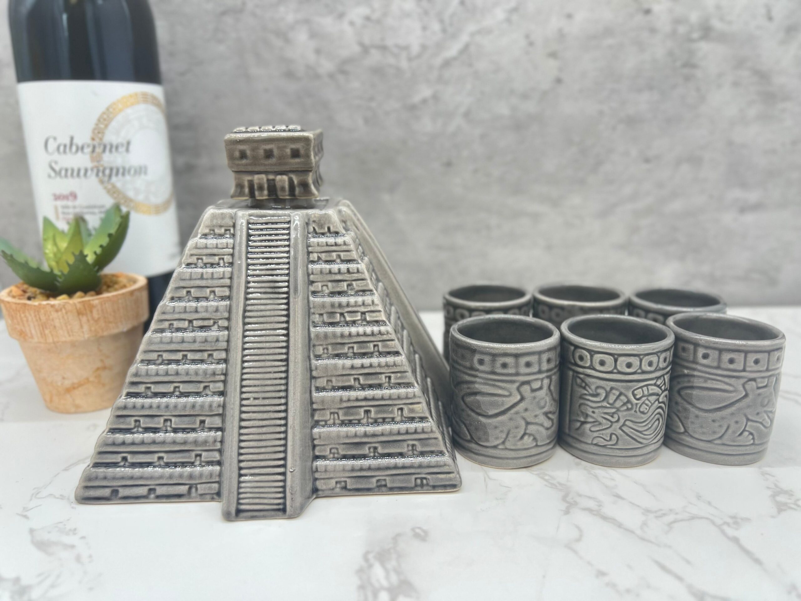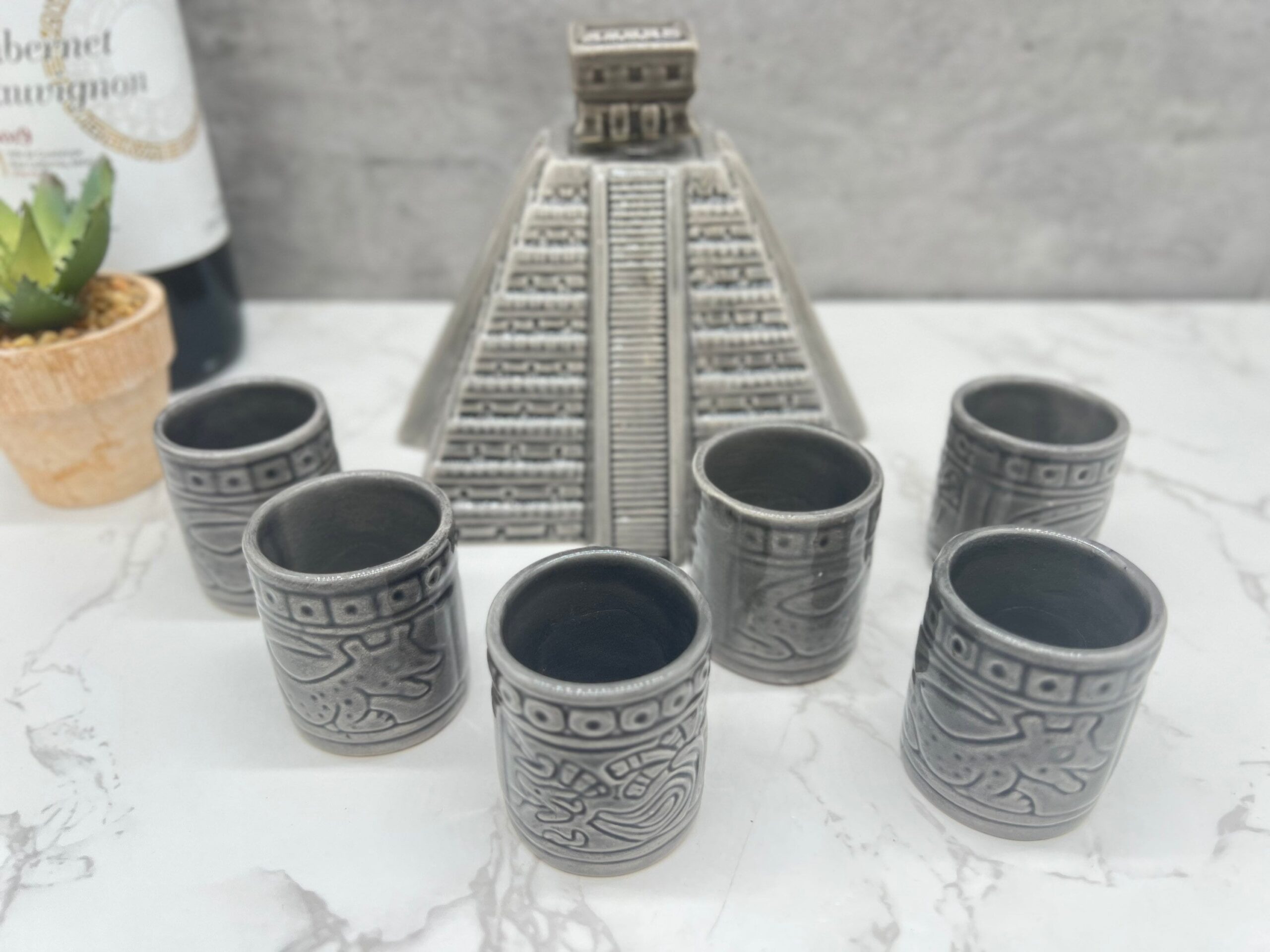 Tequila shot glass, Ceramic shot glasses, Fathers Day gift, Chichen Itza sculpture Characteristic: – Ceramic material Dimension: Shot Glass: Height 2.5” Wide 1” Container: -Color: Gray