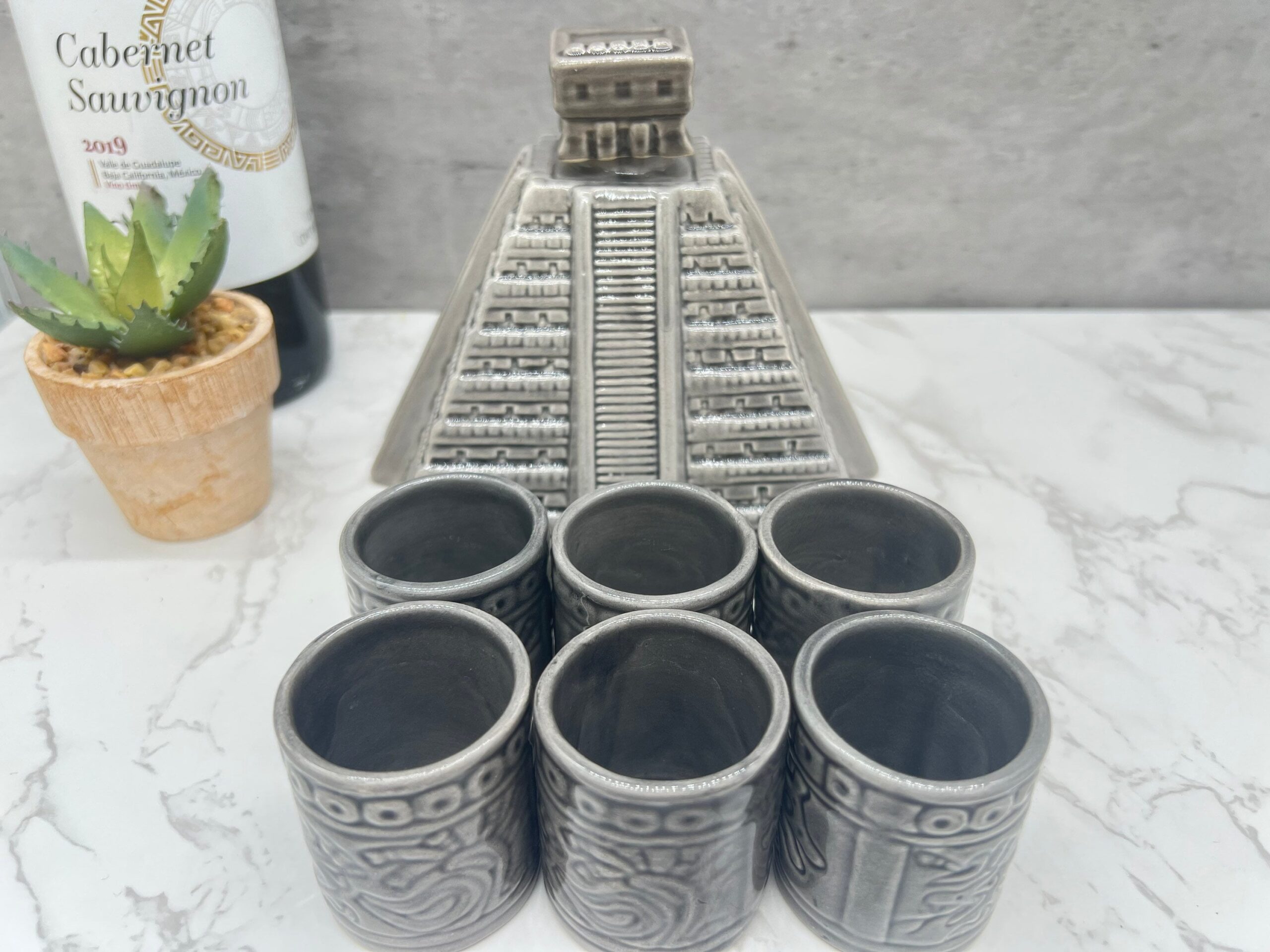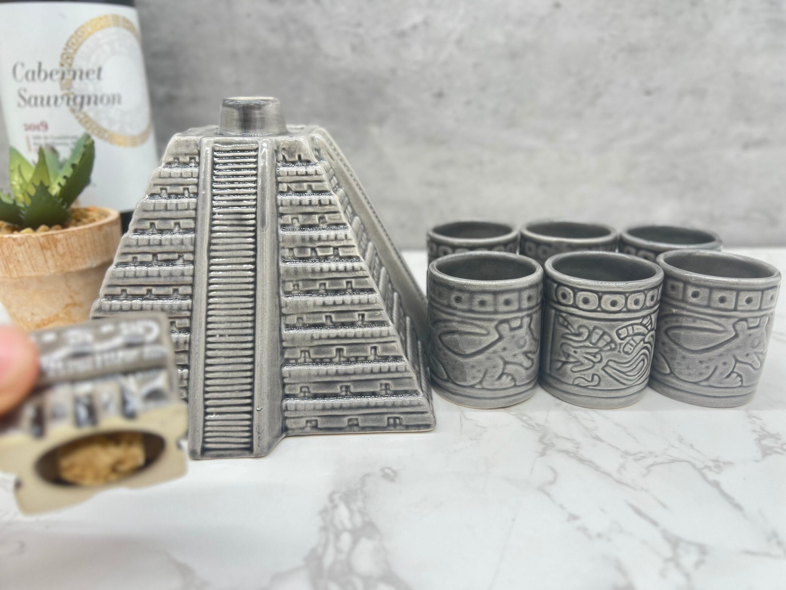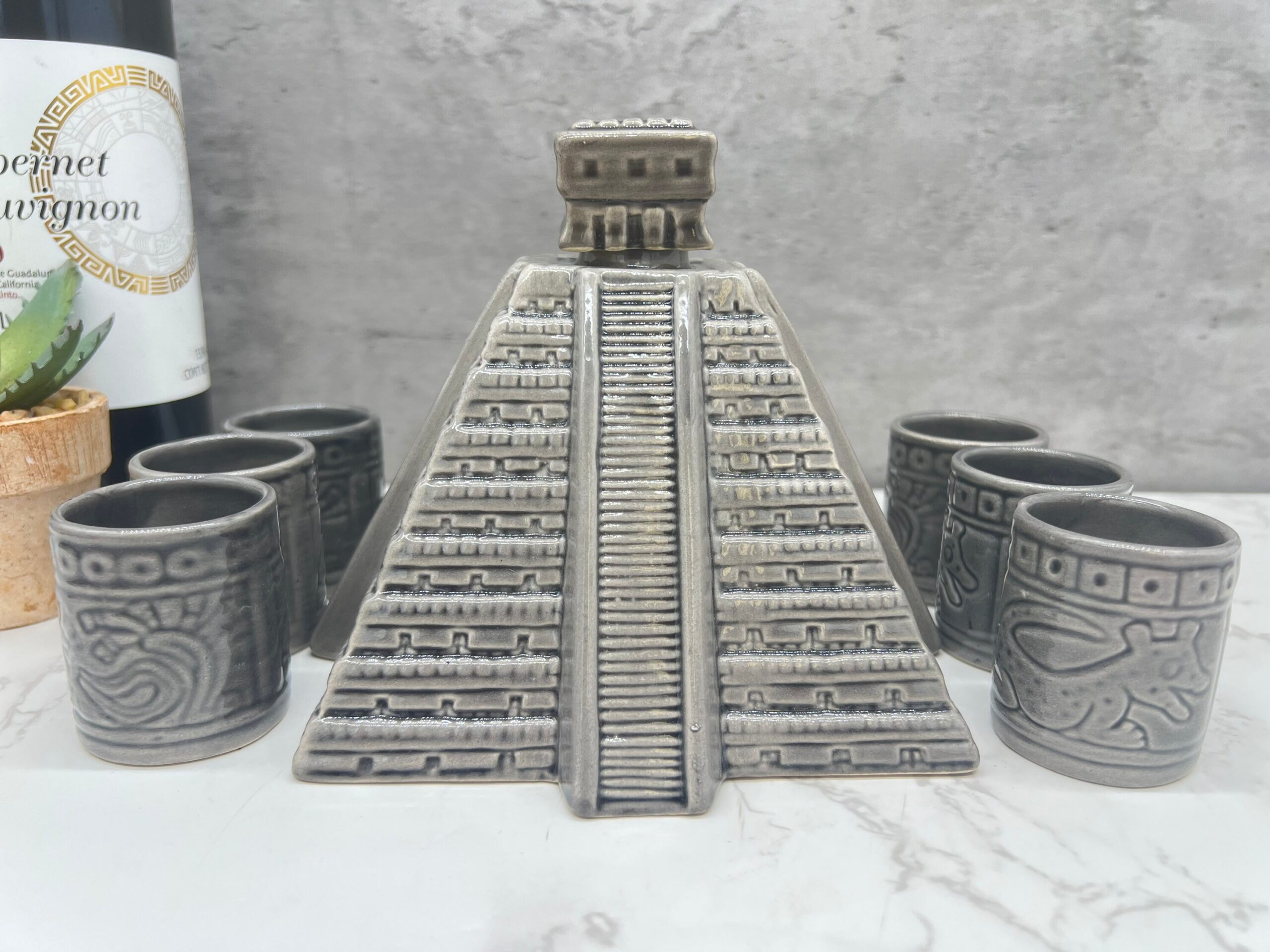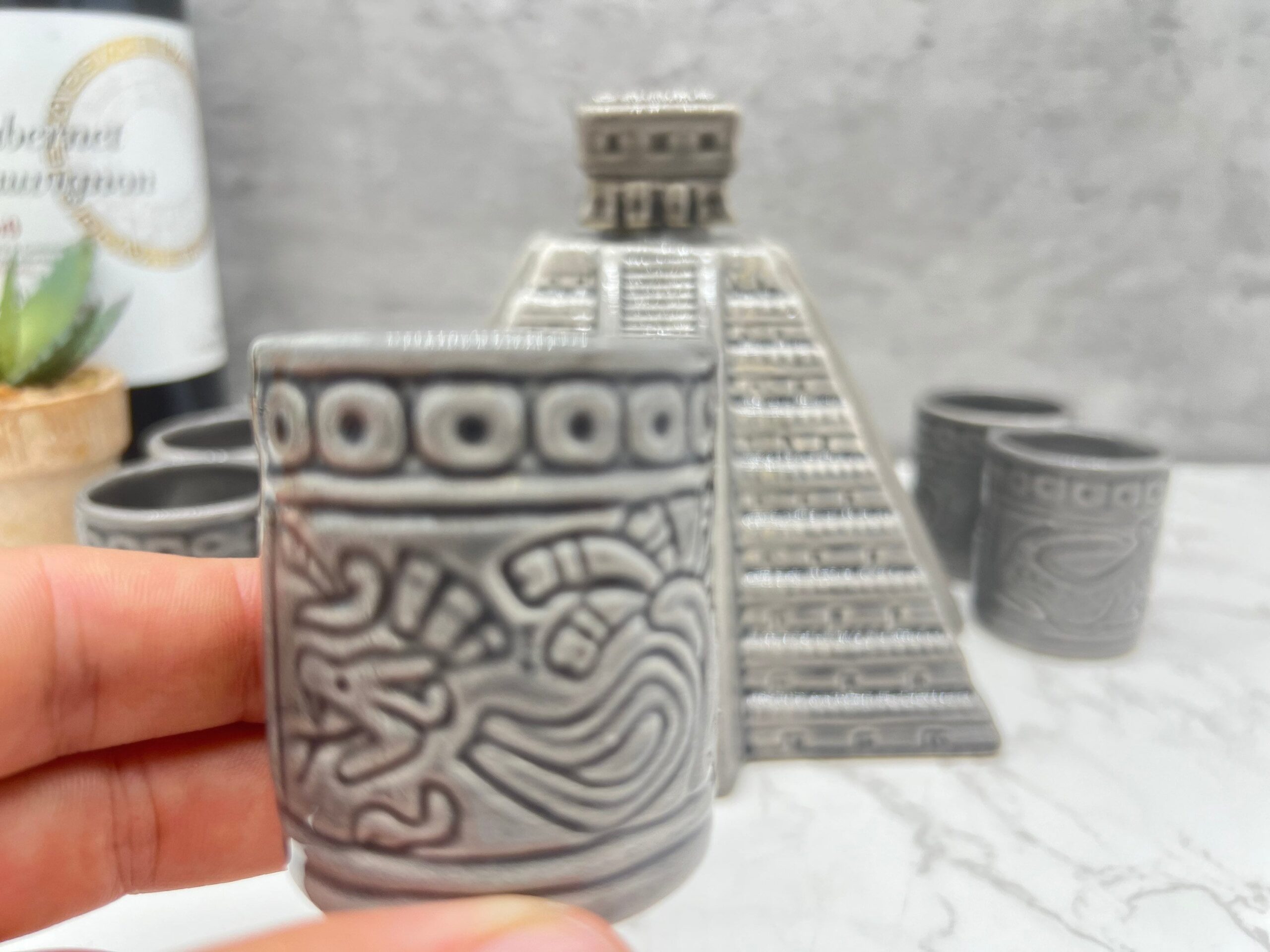 Tequila shot glass, Ceramic shot glasses, Fathers Day gift, Chichen Itza sculpture Characteristic: – Ceramic material Dimension: Shot Glass: Height 2.5” Wide 1” Container: -Color: Gray
