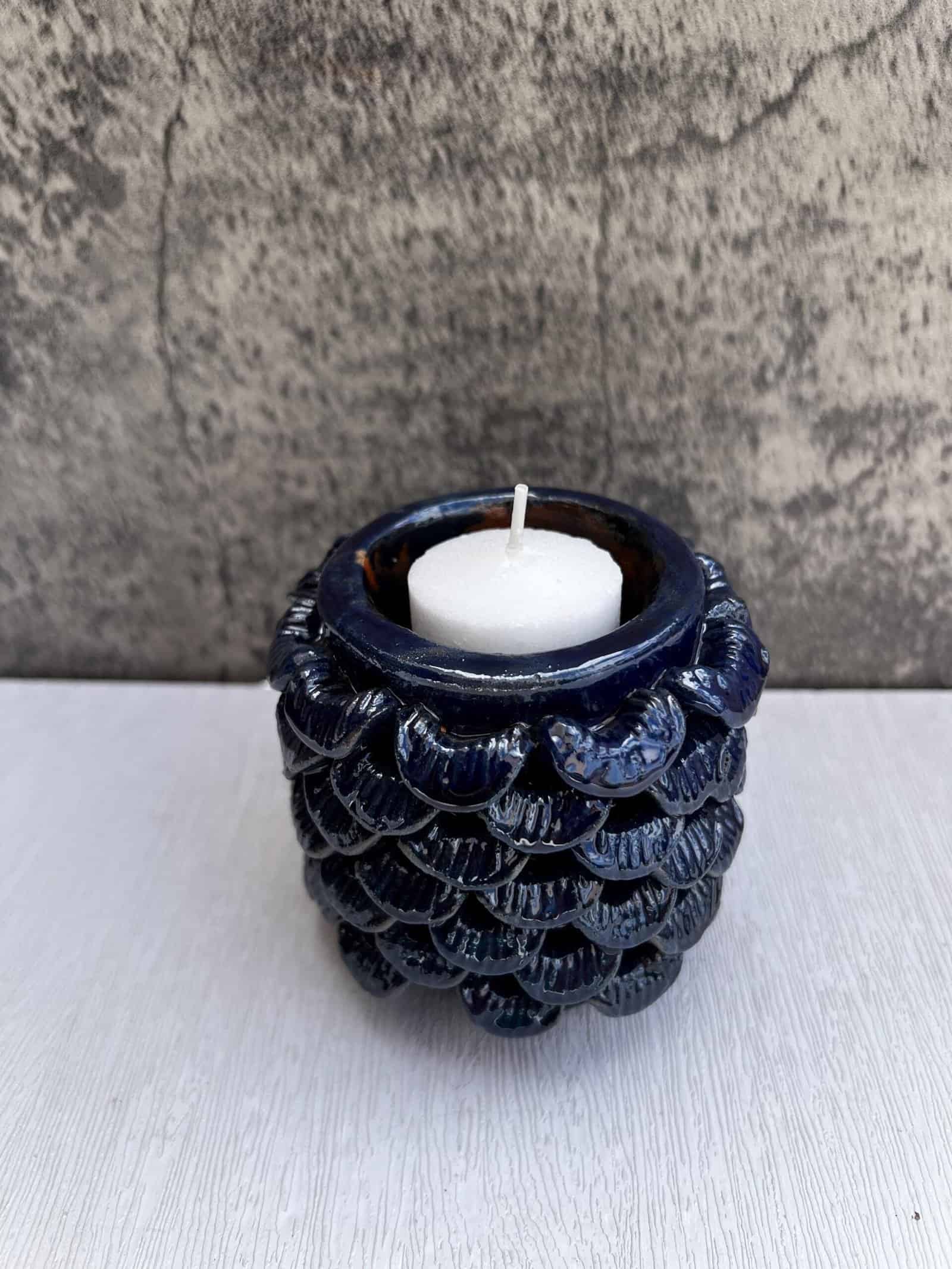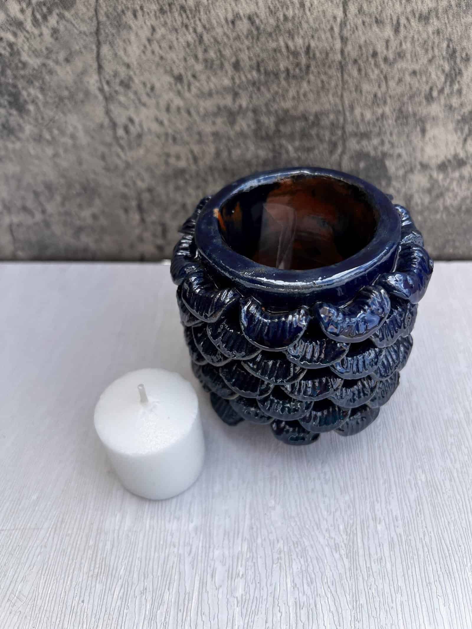Discover the charm of traditional Mexican craftsmanship with this exquisite Capula glazed clay candle holder. Each piece is meticulously handcrafted by artisans in Michoacán, utilizing age-old techniques that have been passed down through generations. The glossy glazed finish enhances the intricate texture, making it a standout addition to any decor. Ideal for setting a serene mood in your living room, bedroom, or dining table, this candle holder also makes a thoughtful and unique gift for any occasion. Embrace the beauty of artisanal pottery and add a touch of warmth and cultural flair to your home with this timeless piece. Due to its handmade nature, each candle holder is truly one-of-a-kind.