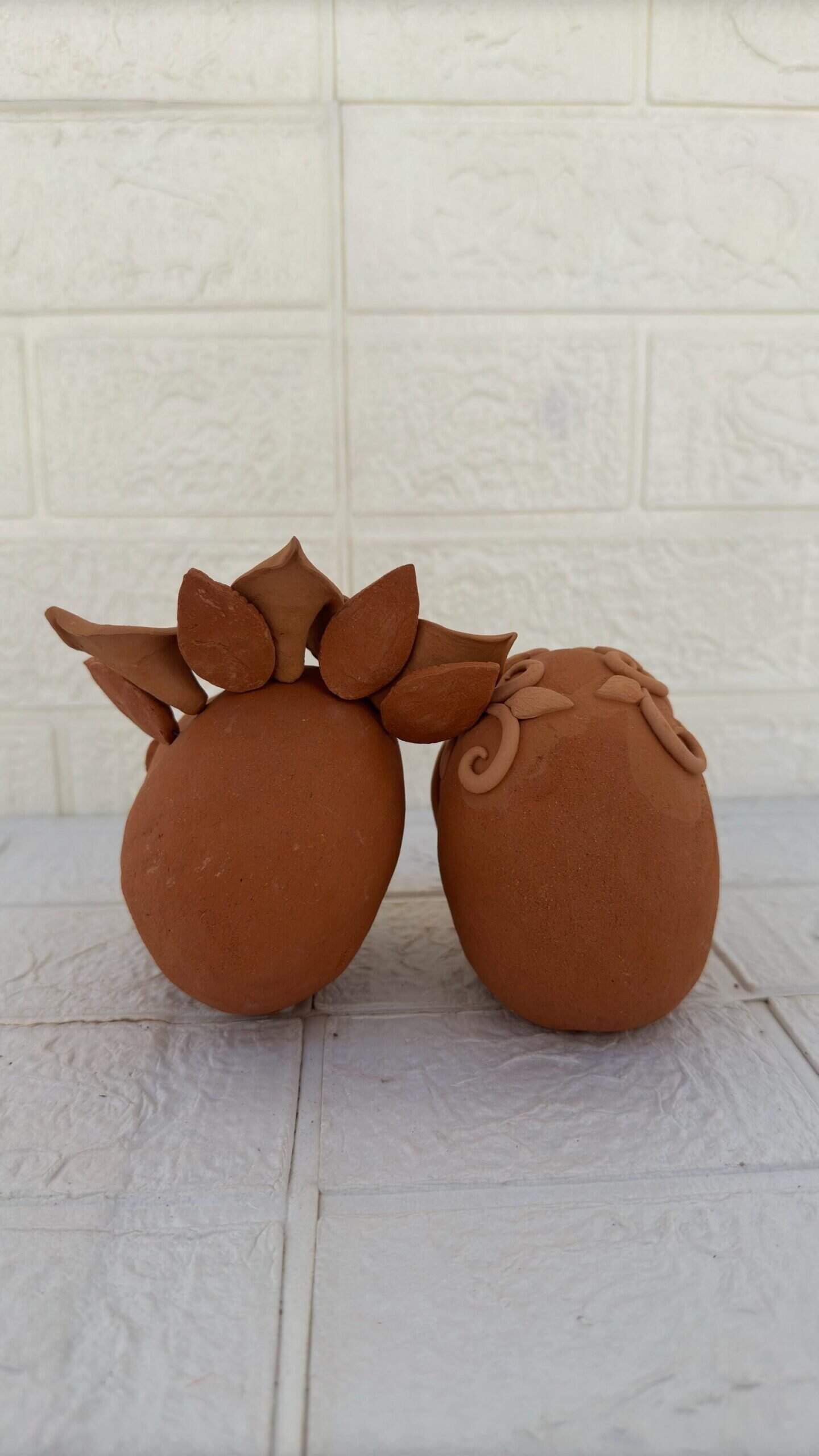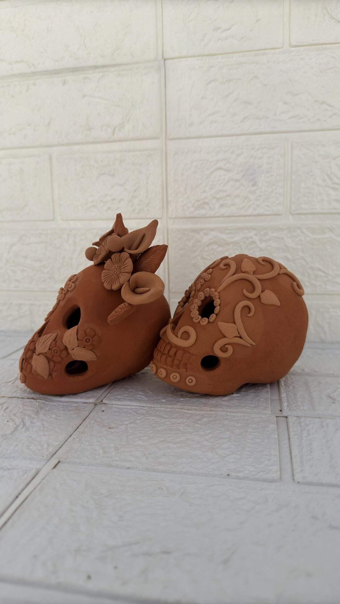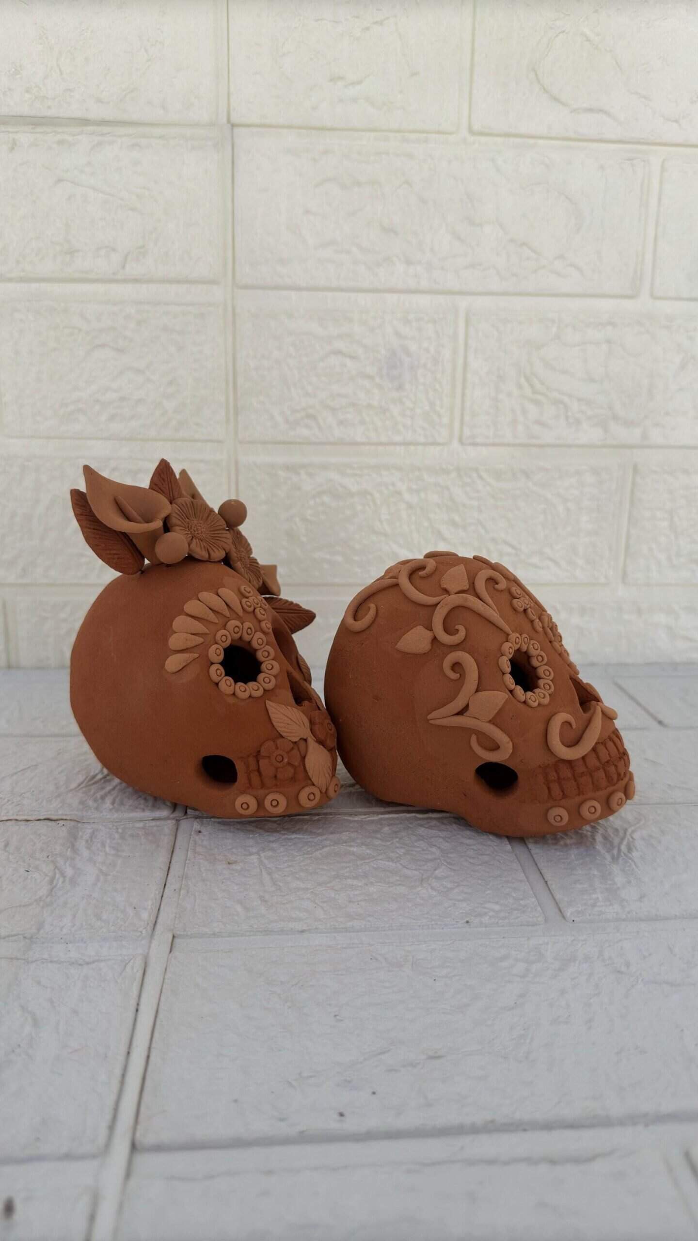 “Oaxaca Filigrana Skull” Description: includes: 2 pieces Natural and red Clay Handmade Unique Designs Dimensions: 4”, 5” tall