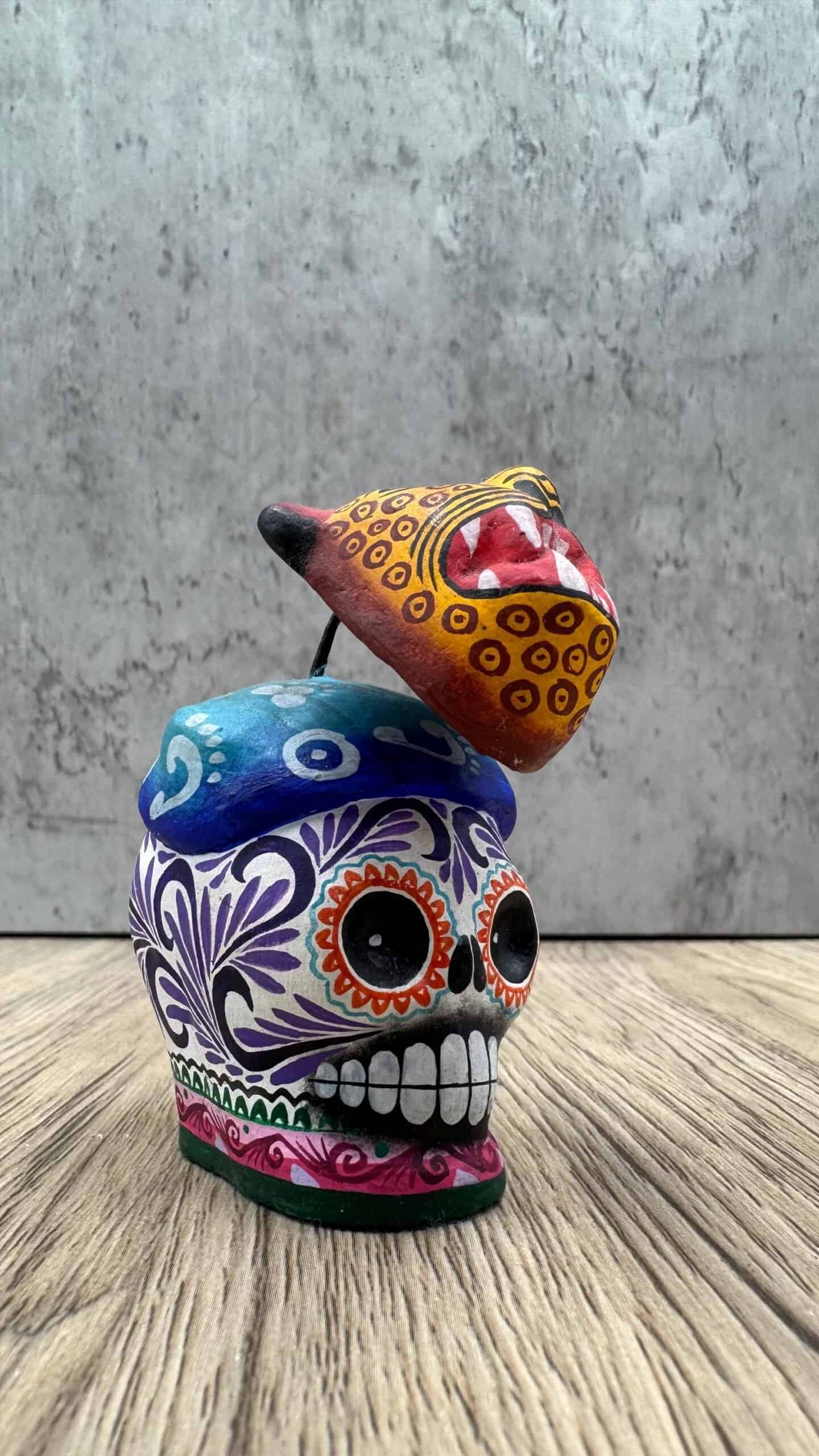 Resting on top is a beautifully painted jaguar head, a powerful symbol in Mexican culture representing strength, protection, and ancestral energy. The combination of the skull and jaguar creates a unique artistic piece that honors both Día de Muertos symbolism and pre-Hispanic heritage.