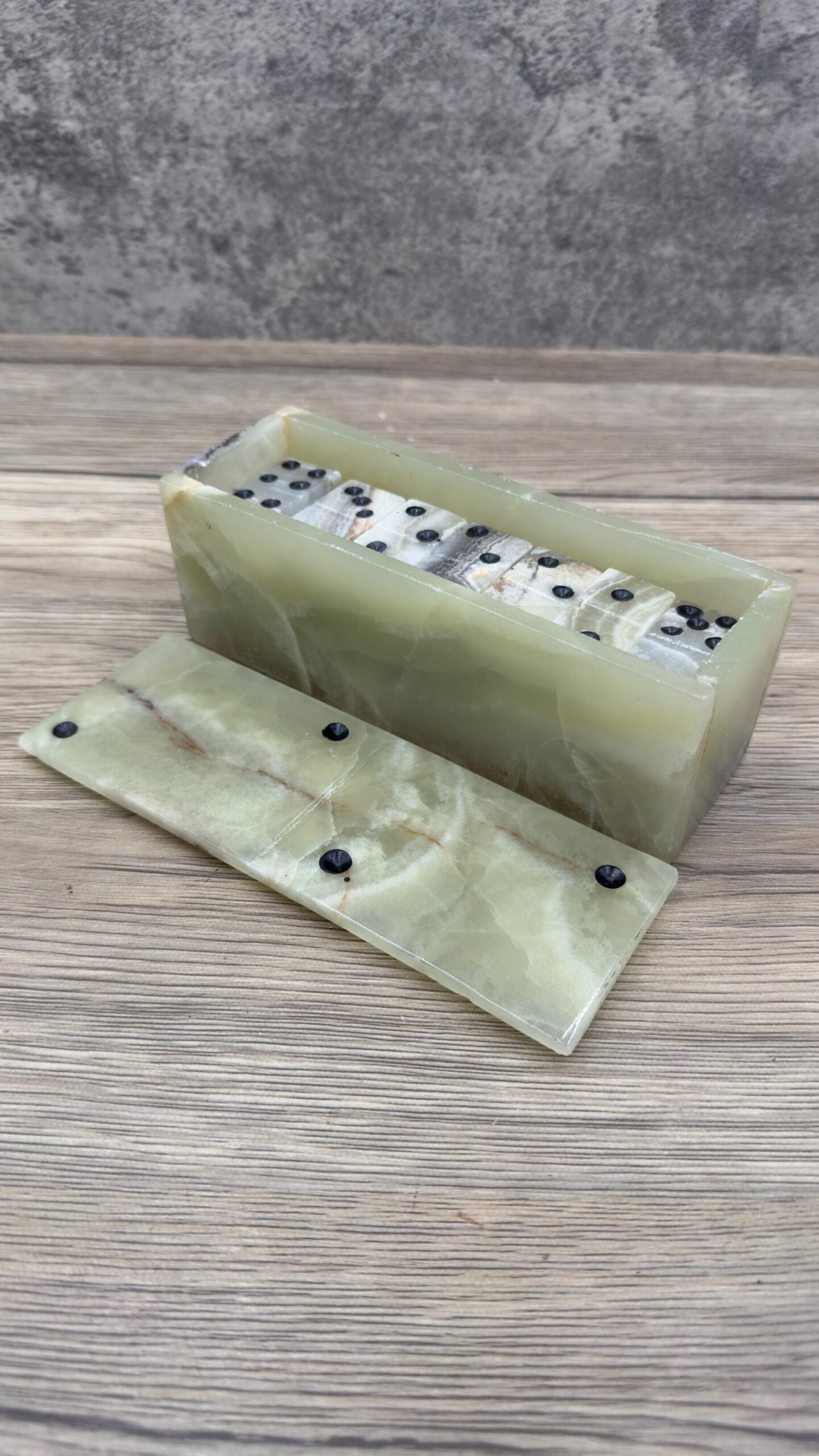 “game table, Dominoes, Marble game, Vintage dominoes” Description: – Marble stone domino game – Available in grey, white, brown, pink and black and more… – 6.69” long box Includes: – 28 chips to play – Box to store the chips Note: – As the box and chips are hand carved, please note that there are there may be minor variations from piece to piece – The domino is made of natural stone and is obtained in Mexico Everything is hand made This domino can be used to play and to decorate, giving a special and elegant touch to your home.