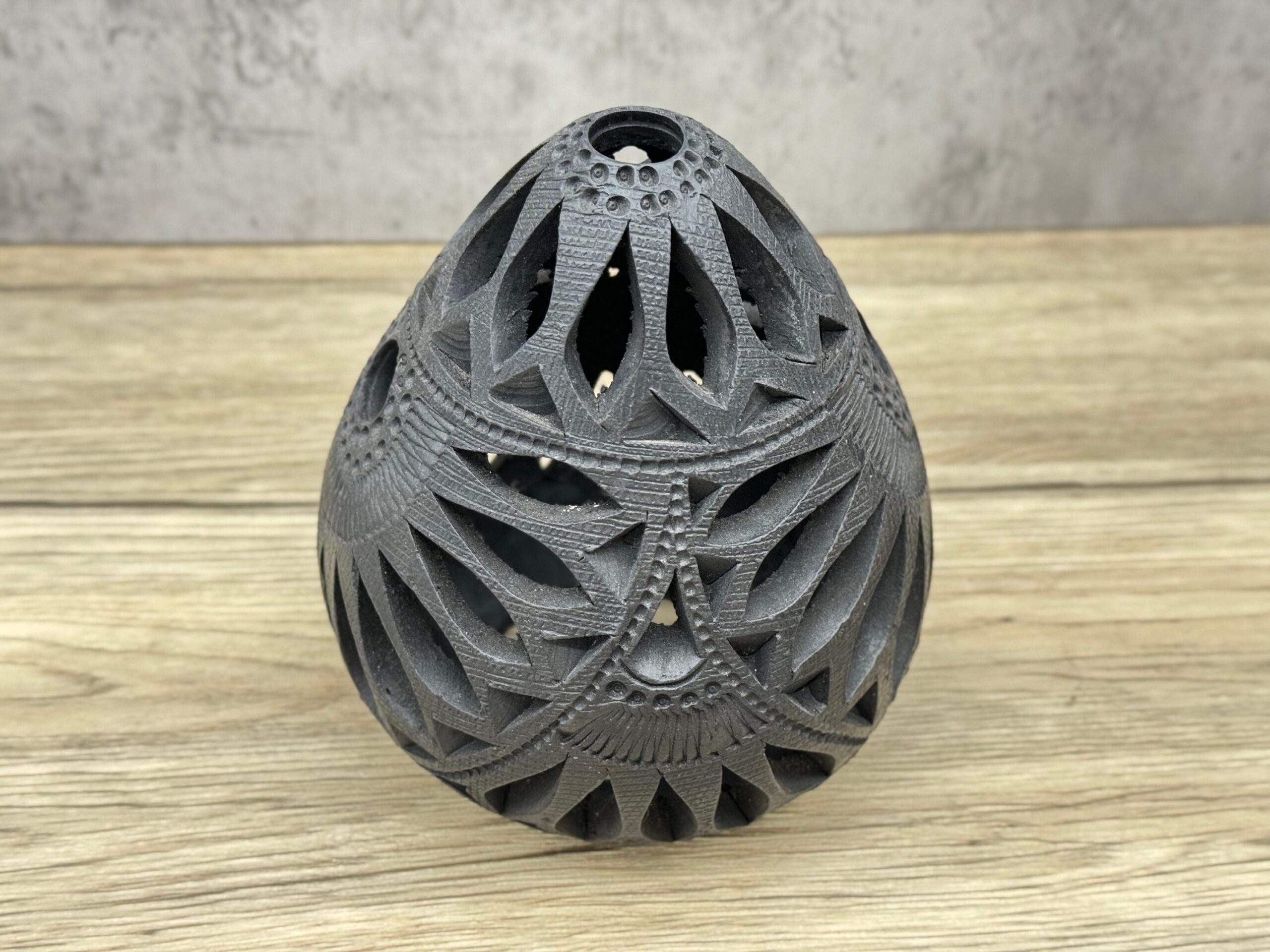 Introducing our mesmerizing Egg Luminary, meticulously handcrafted from the finest black clay sourced from the vibrant region of Oaxaca. Experience the enchantment of soft, diffused light as it radiates through the delicate patterns and textures of this captivating piece.
