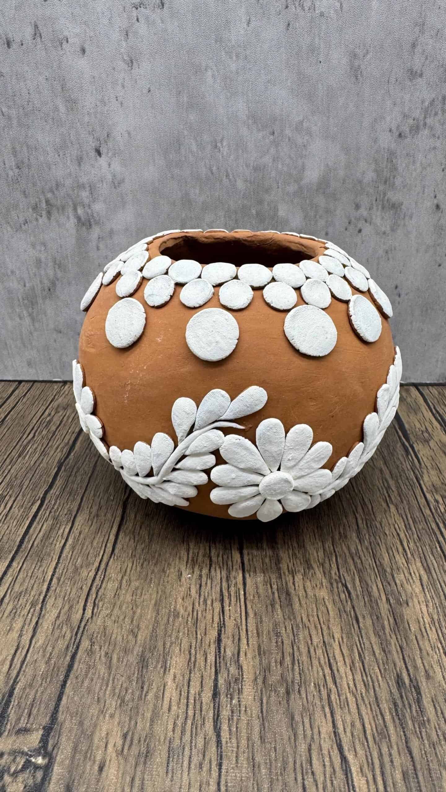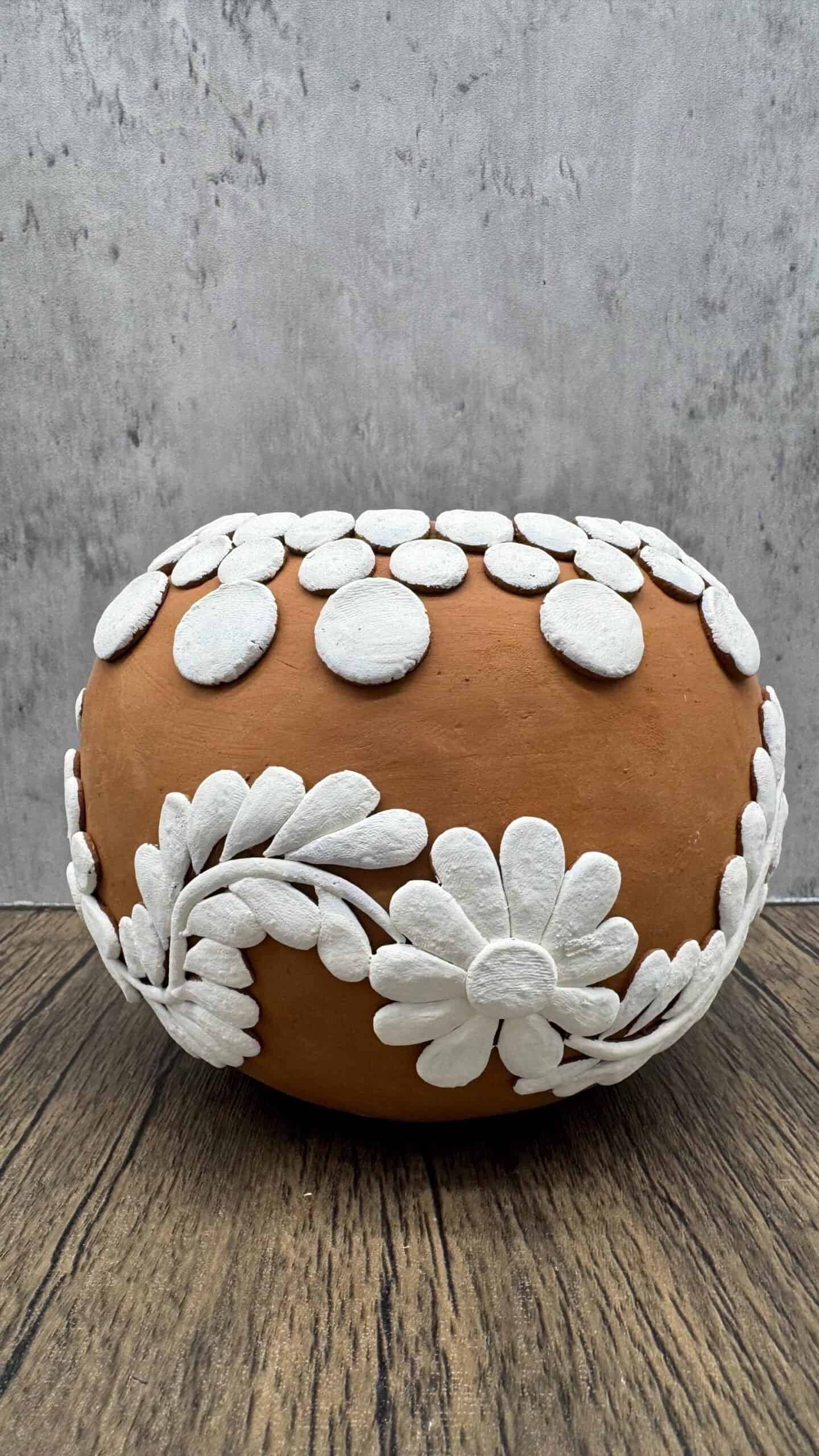“Oaxaca vase” Material: natural clay Origin: Atzompa Oaxaca Size: 6” wide, 5” tall, 3” top hole Discover the magic of traditional craftsmanship from Santa María Atzompa, Oaxaca, with this exquisite handmade clay vase. Each piece is a testament to the rich cultural heritage of the region, where pottery has been a way of life for generations. Skilled artisans from Atzompa mold the local clay by hand, shaping each vase with techniques passed down through centuries. The vase features a robust base and a gracefully elongated neck, making it not only a functional piece but also a striking decorative element. The natural terracotta surface is adorned with intricate, embossed white patterns that highlight the meticulous attention to detail typical of Atzompa pottery. This decorative approach not only enhances the aesthetic appeal but also celebrates the vibrant artistic expressions rooted in the community’s traditions. Suitable for both indoor and outdoor use, this vase can serve as a standalone statement piece or as a dignified container for your favorite flowers. Embrace a piece of Mexican heritage with this handcrafted vase, perfect for adding a touch of timeless elegance and cultural depth to any home or garden. Its unique design and historical significance make it an ideal gift for art collectors and enthusiasts of traditional crafts.