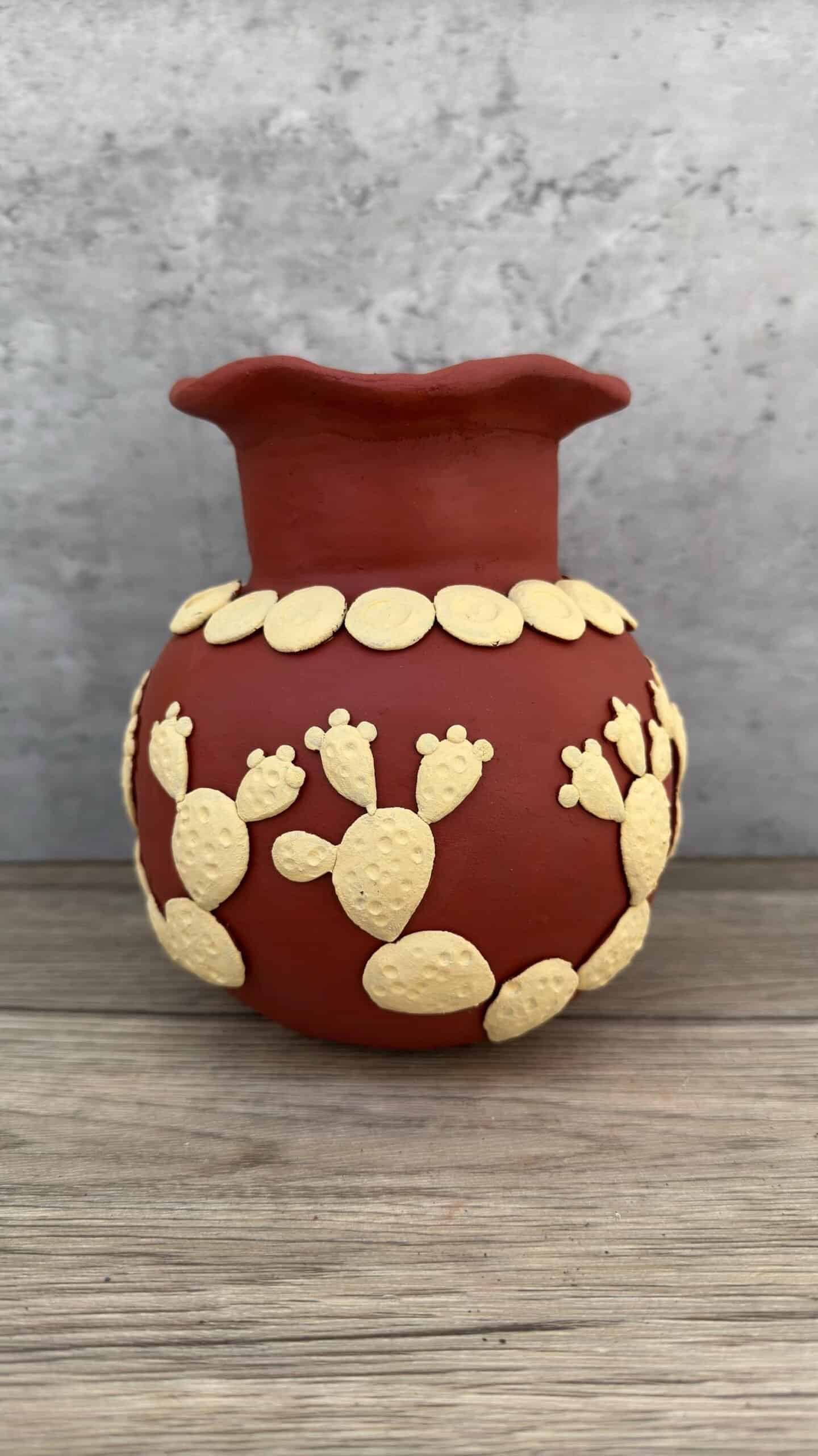 “Oaxaca vase” Material: natural clay Origin: Atzompa Oaxaca Size: 5.5” wide, 6.5” tall, 2.7” top hole Discover the magic of traditional craftsmanship from Santa María Atzompa, Oaxaca, with this exquisite handmade clay vase. Each piece is a testament to the rich cultural heritage of the region, where pottery has been a way of life for generations. Skilled artisans from Atzompa mold the local clay by hand, shaping each vase with techniques passed down through centuries. The vase features a robust base and a gracefully elongated neck, making it not only a functional piece but also a striking decorative element. The natural terracotta surface is adorned with intricate, embossed white patterns that highlight the meticulous attention to detail typical of Atzompa pottery. This decorative approach not only enhances the aesthetic appeal but also celebrates the vibrant artistic expressions rooted in the community’s traditions. Suitable for both indoor and outdoor use, this vase can serve as a standalone statement piece or as a dignified container for your favorite flowers. Embrace a piece of Mexican heritage with this handcrafted vase, perfect for adding a touch of timeless elegance and cultural depth to any home or garden. Its unique design and historical significance make it an ideal gift for art collectors and enthusiasts of traditional crafts.