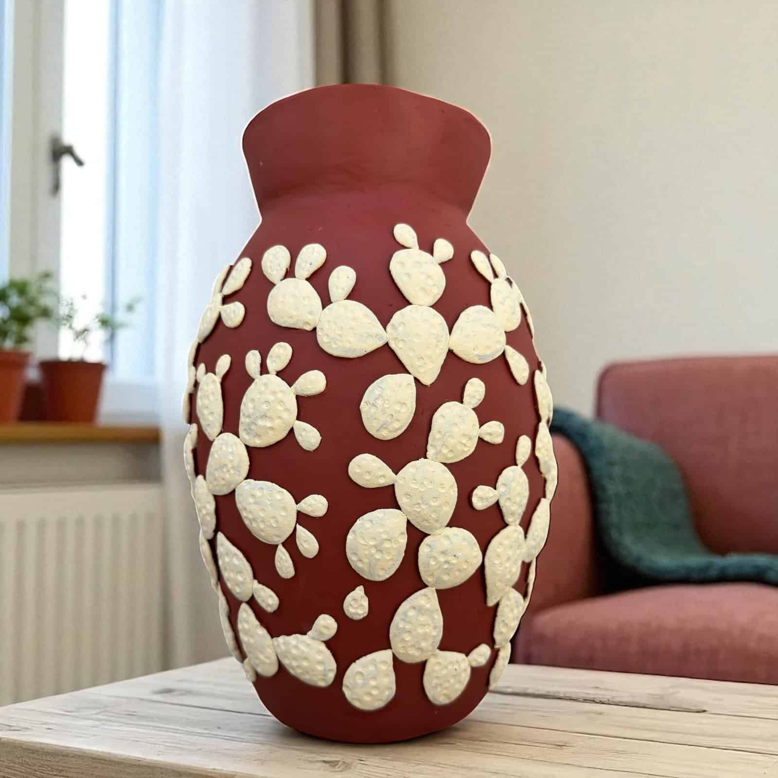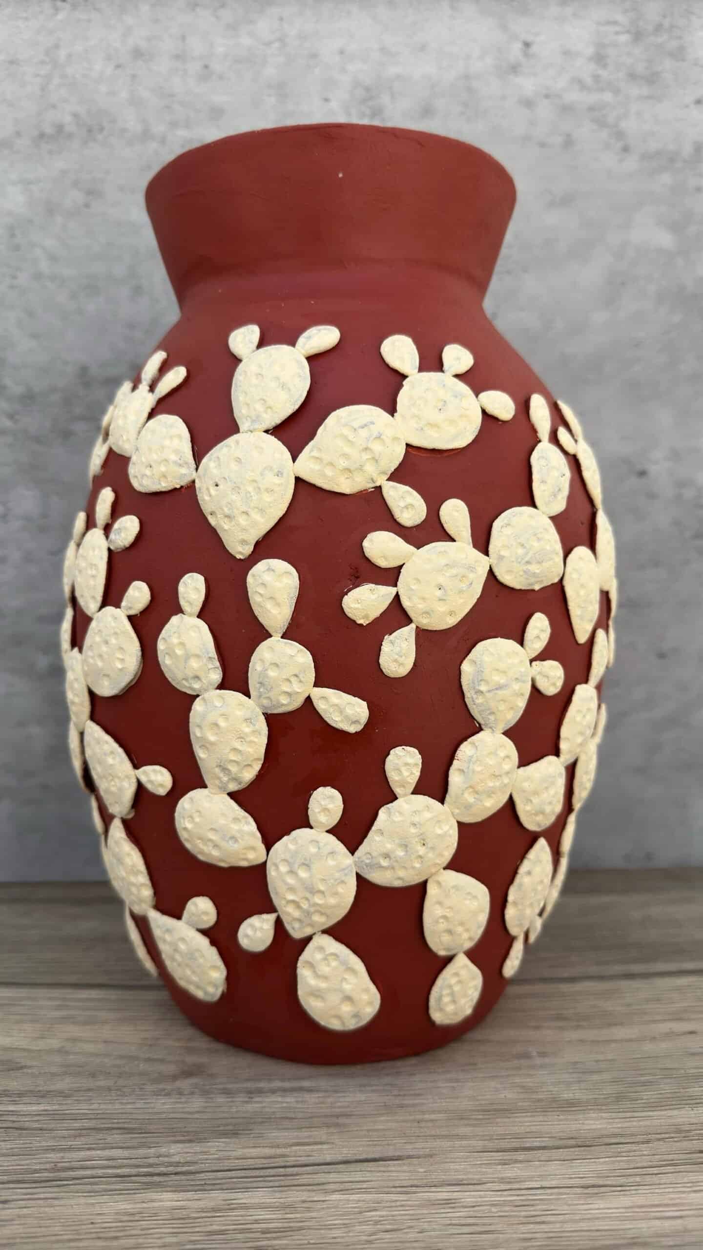 The natural terracotta surface is adorned with intricate, embossed white patterns that highlight the meticulous attention to detail typical of Atzompa pottery. This decorative approach not only enhances the aesthetic appeal but also celebrates the vibrant artistic expressions rooted in the community’s traditions. Suitable for both indoor and outdoor use, this vase can serve as a standalone statement piece or as a dignified container for your favorite flowers.