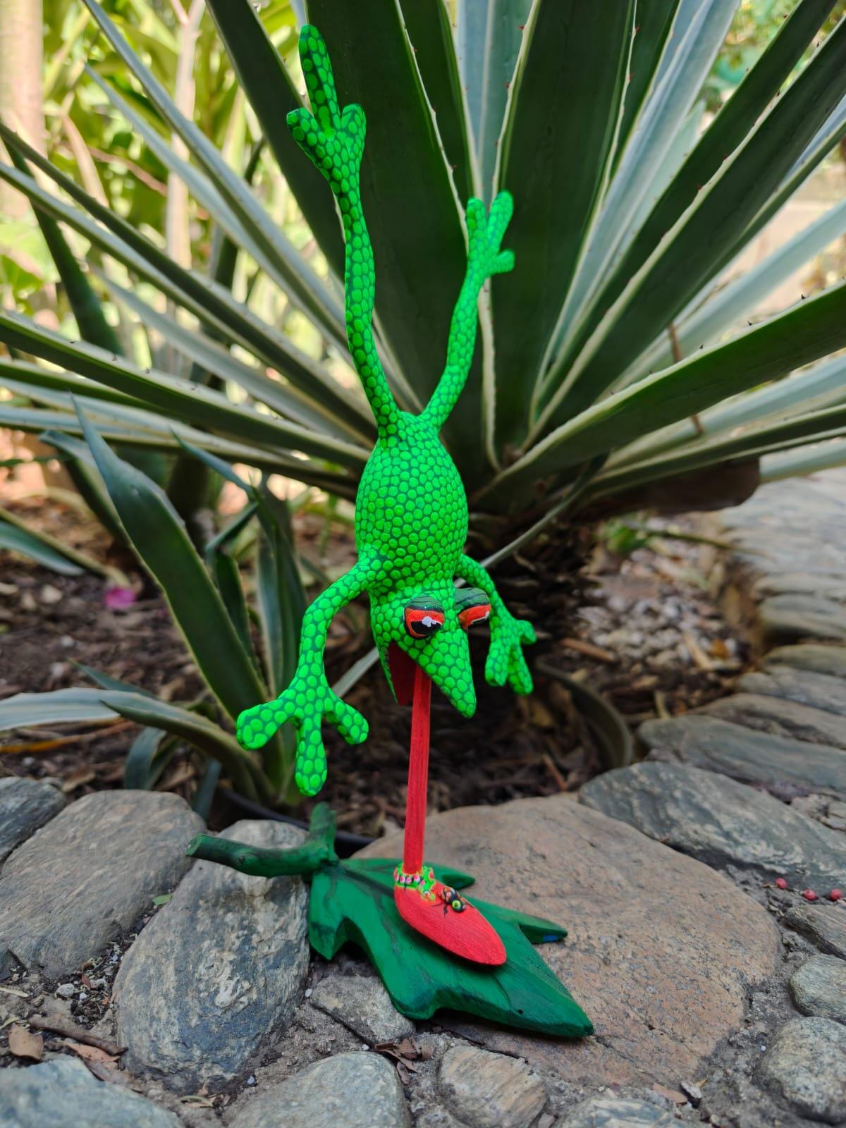 This vibrant hand carved wooden frog alebrije is a beautiful piece of traditional Oaxacan folk art, handmade and carefully painted by talented artisans in Oaxaca, Mexico.