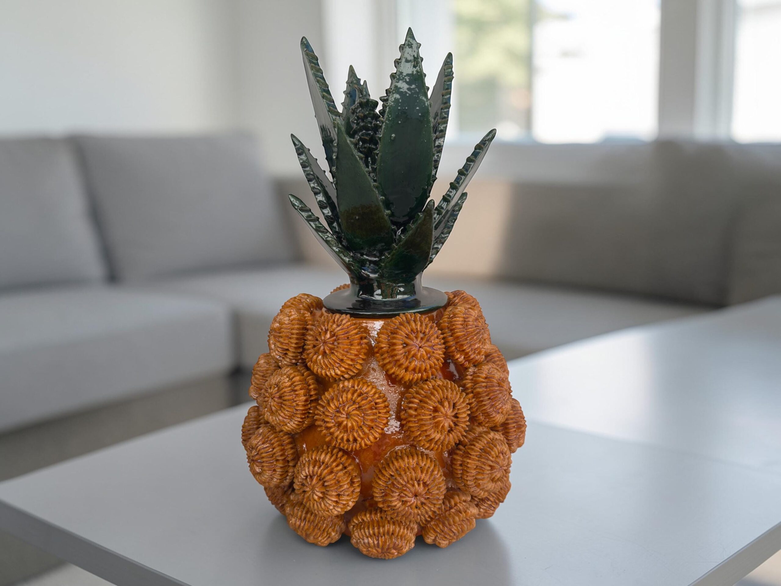 Glazed pineapple – Mexican folk pottery – Mexican folk art This pineapple decor is a unique piece, each part of the scale is made by hand, by artisans from the state of Michoacan, Mexico. Characteristic: – Size: 10” wide, 16” tall” – Clay material The pineapple sculpture of Michoacan is distinguished in Popular Art in Mexico not only for its quality, but also for the ancestral techniques they use, making a fusion of prehispanic techniques. Glazed clay, named for its glazed, glass-like appearance. The potters’ process consists of applying to the clay pieces, after their first firing, a film or layer that, after melting in an oven, takes on a crystalline appearance. It is therefore a smooth and waterproof coating achieved in a second firing that must reach 800 °C to 1300 °C. ______________________________________________________________________________________________________________________________________________________________________________________________________________________ This beautiful decoration pineapple can be used as a home decoration, the top of the pinecone can be removed to store items inside. By buying one of these pieces you support the families of artisans who work in this beautiful art. ______________________________________________________________________________________________________________________________________________________________________________________________________________________ IMPORTANT NOTE: – Please note that as this is a handmade enameled piece there may be some imperfections. – All our fragile products, we pack them with special materials to guarantee their protection, if there is any problem with your package, please contact us to solve it as soon as possible. ______________________________________________________________________________________________________________________________________________________________________________________________________________________ Order carefully, we will pack ✅ Express shipping is available for an additional charge, please ask ✅ You can send this with a special dedication✅ It can be sent with a special wrapping as a gift ✅ Any questions please do not hesitate, we usually respond in less than an hour 😀