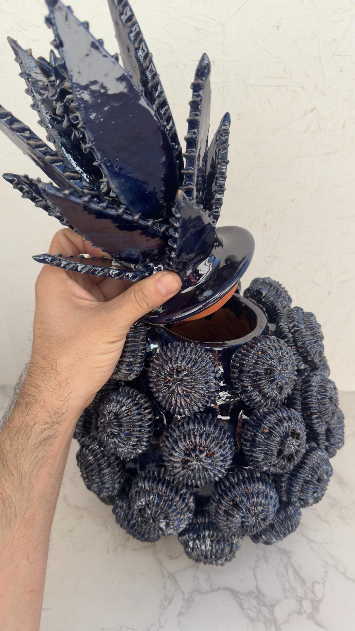 Glazed pineapple – Mexican folk pottery – Mexican folk art This pineapple decor is a unique piece, each part of the scale is made by hand, by artisans from the state of Michoacan, Mexico. Characteristic: – Size: 10” wide, 16” tall” – Clay material The pineapple sculpture of Michoacan is distinguished in Popular Art in Mexico not only for its quality, but also for the ancestral techniques they use, making a fusion of prehispanic techniques. Glazed clay, named for its glazed, glass-like appearance. The potters’ process consists of applying to the clay pieces, after their first firing, a film or layer that, after melting in an oven, takes on a crystalline appearance. It is therefore a smooth and waterproof coating achieved in a second firing that must reach 800 °C to 1300 °C. ______________________________________________________________________________________________________________________________________________________________________________________________________________________ This beautiful decoration pineapple can be used as a home decoration, the top of the pinecone can be removed to store items inside. By buying one of these pieces you support the families of artisans who work in this beautiful art. ______________________________________________________________________________________________________________________________________________________________________________________________________________________ IMPORTANT NOTE: – Please note that as this is a handmade enameled piece there may be some imperfections. – All our fragile products, we pack them with special materials to guarantee their protection, if there is any problem with your package, please contact us to solve it as soon as possible. ______________________________________________________________________________________________________________________________________________________________________________________________________________________ Order carefully, we will pack ✅ Express shipping is available for an additional charge, please ask ✅ You can send this with a special dedication✅ It can be sent with a special wrapping as a gift ✅ Any questions please do not hesitate, we usually respond in less than an hour 😀