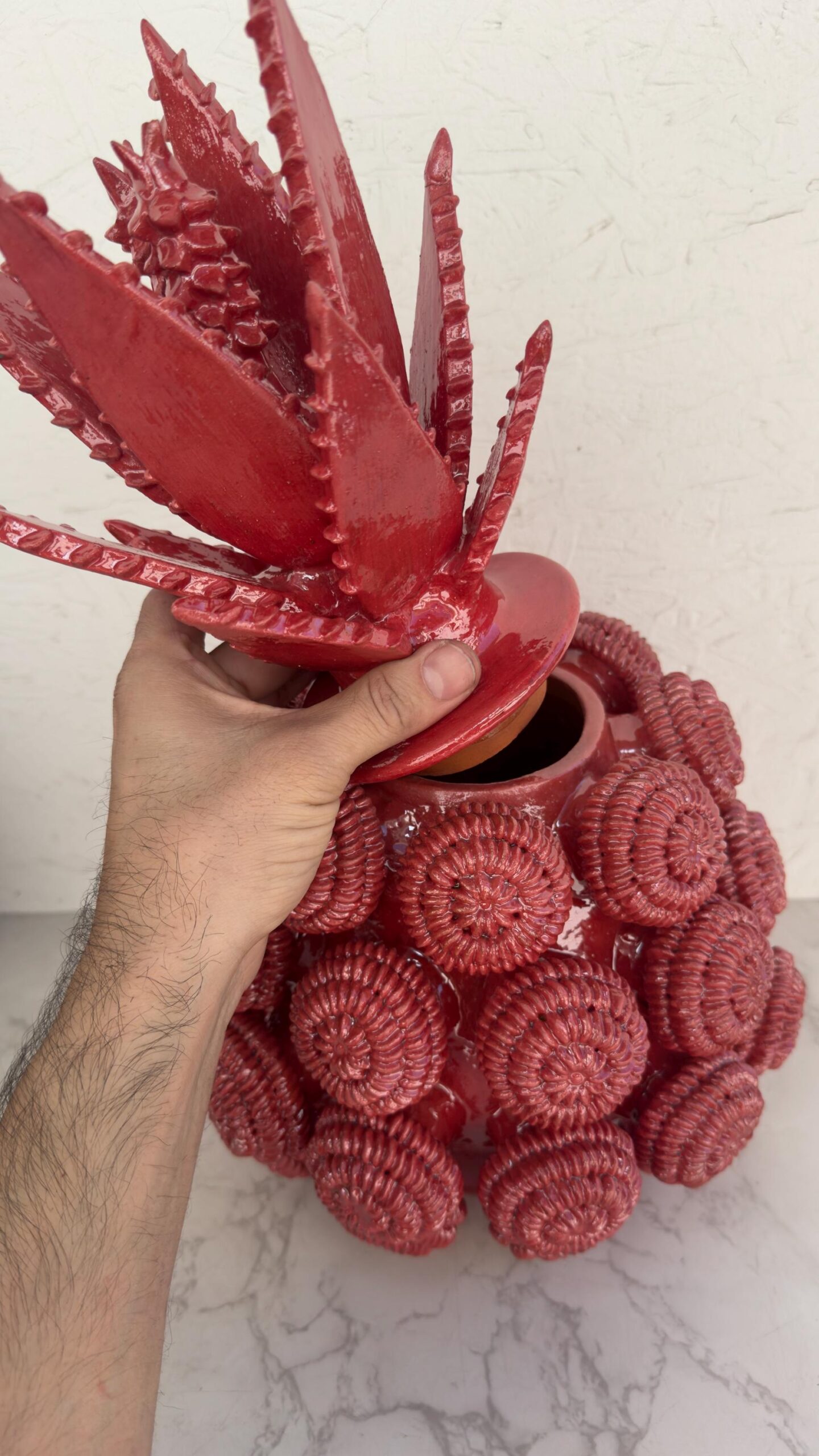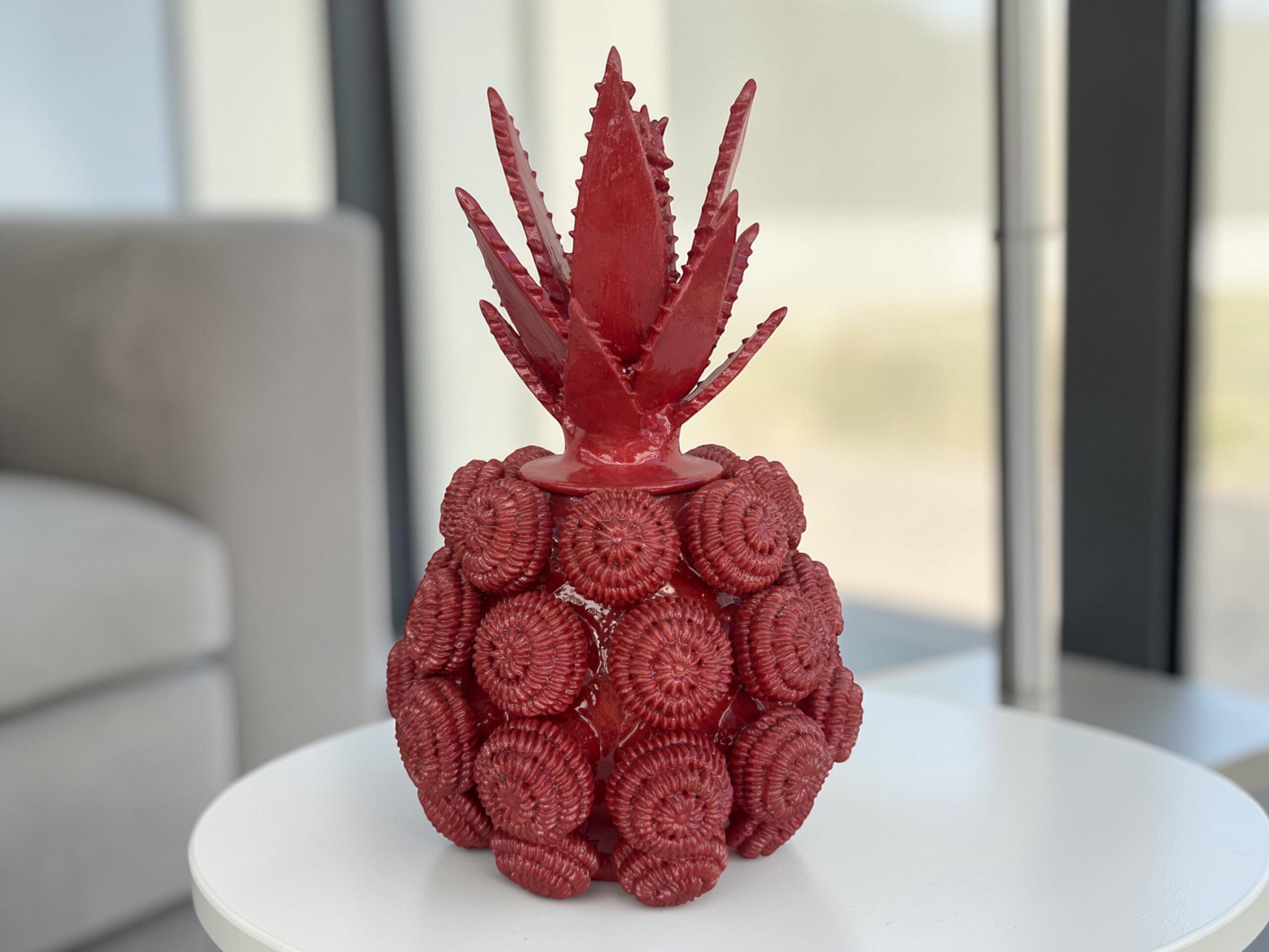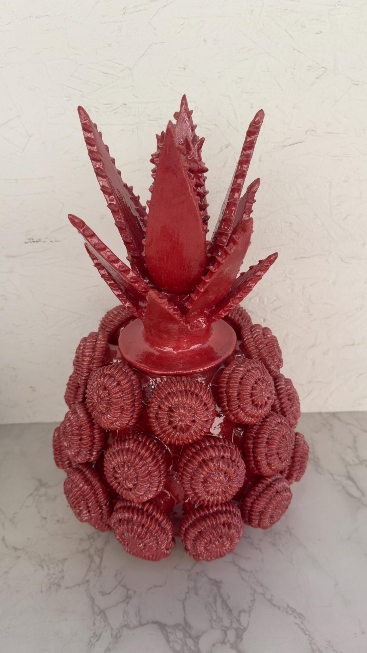 The pineapple sculpture of Michoacan is distinguished in Popular Art in Mexico not only for its quality, but also for the ancestral techniques they use, making a fusion of prehispanic techniques. Glazed clay, named for its glazed, glass-like appearance.