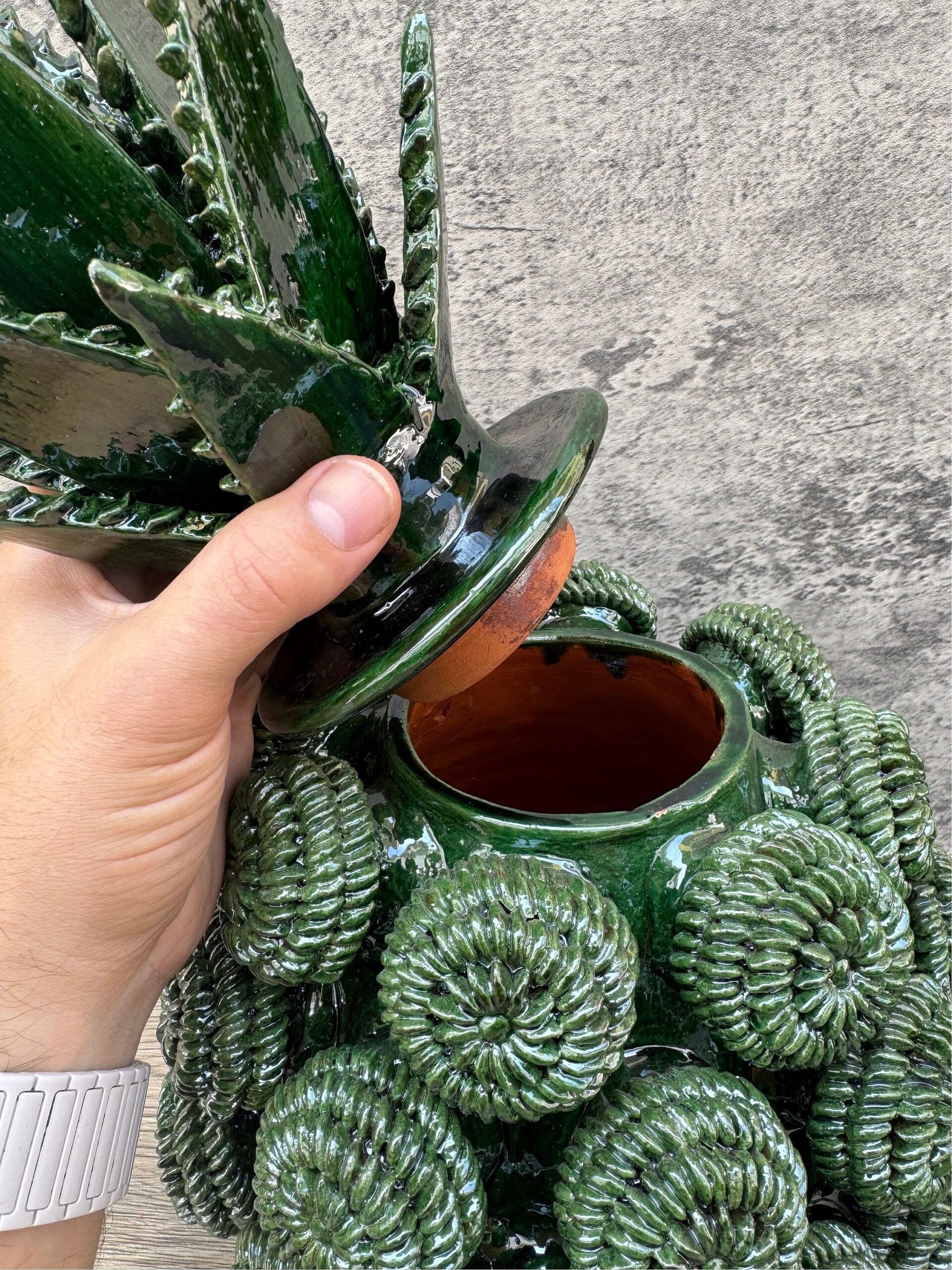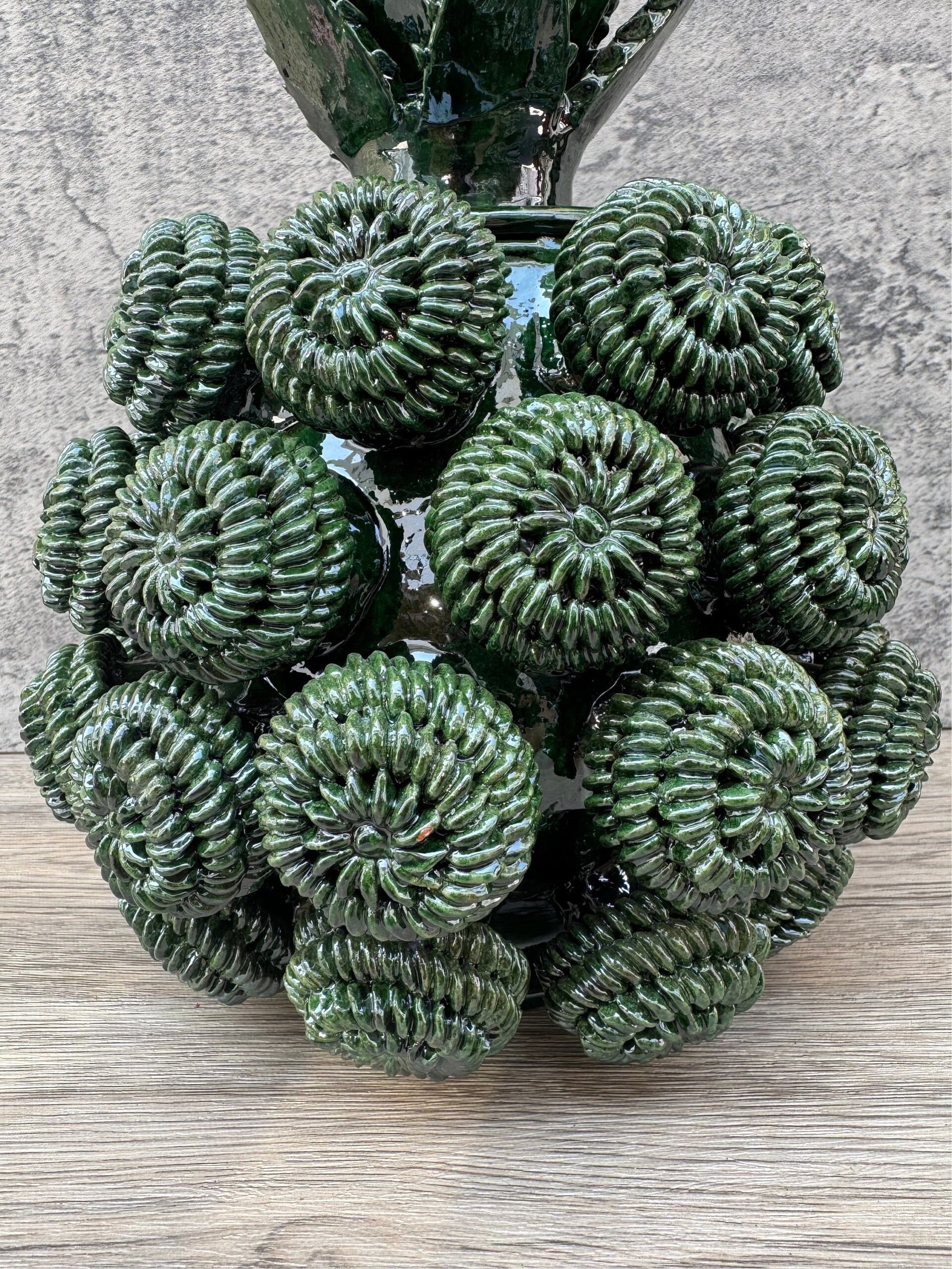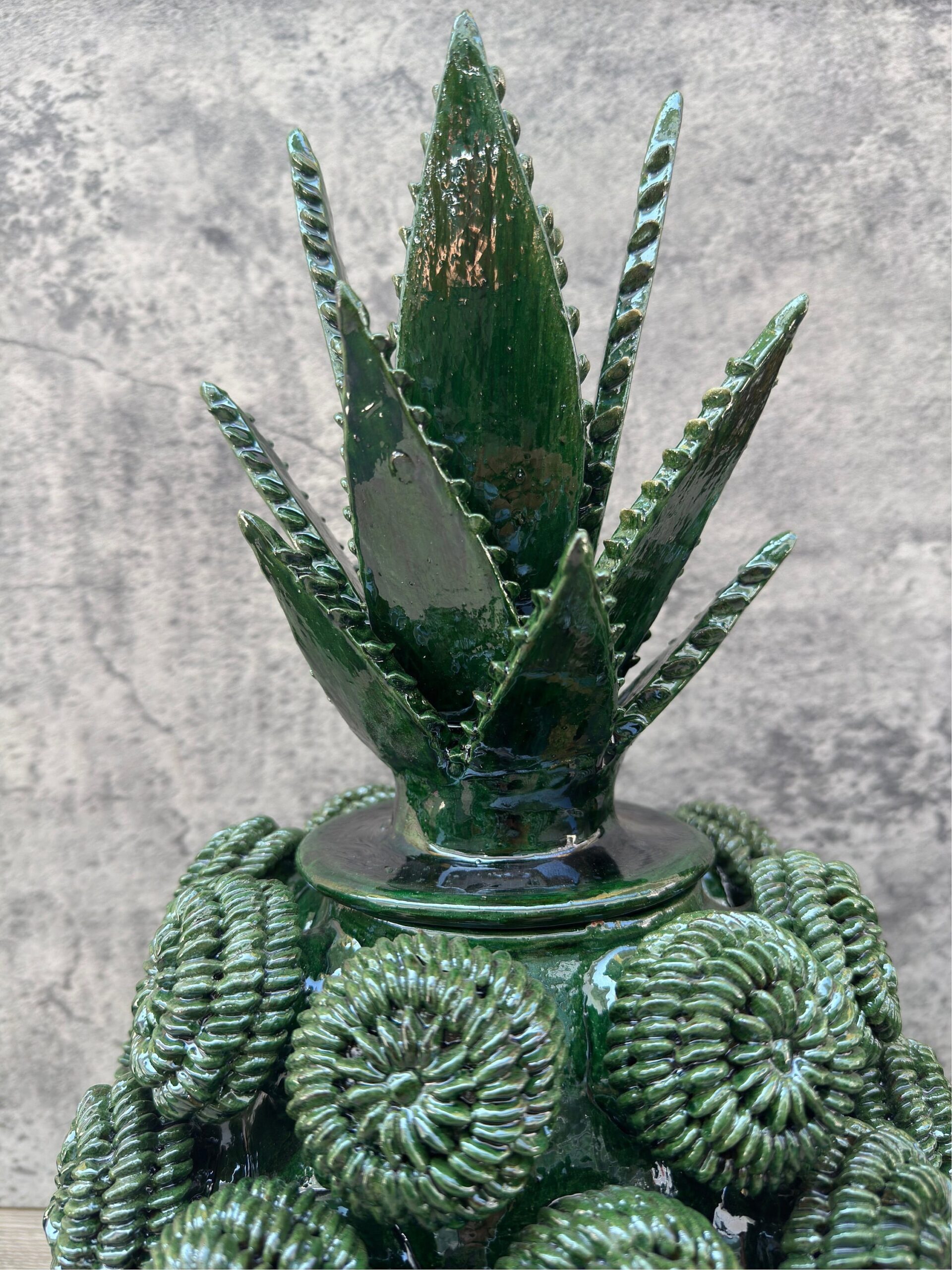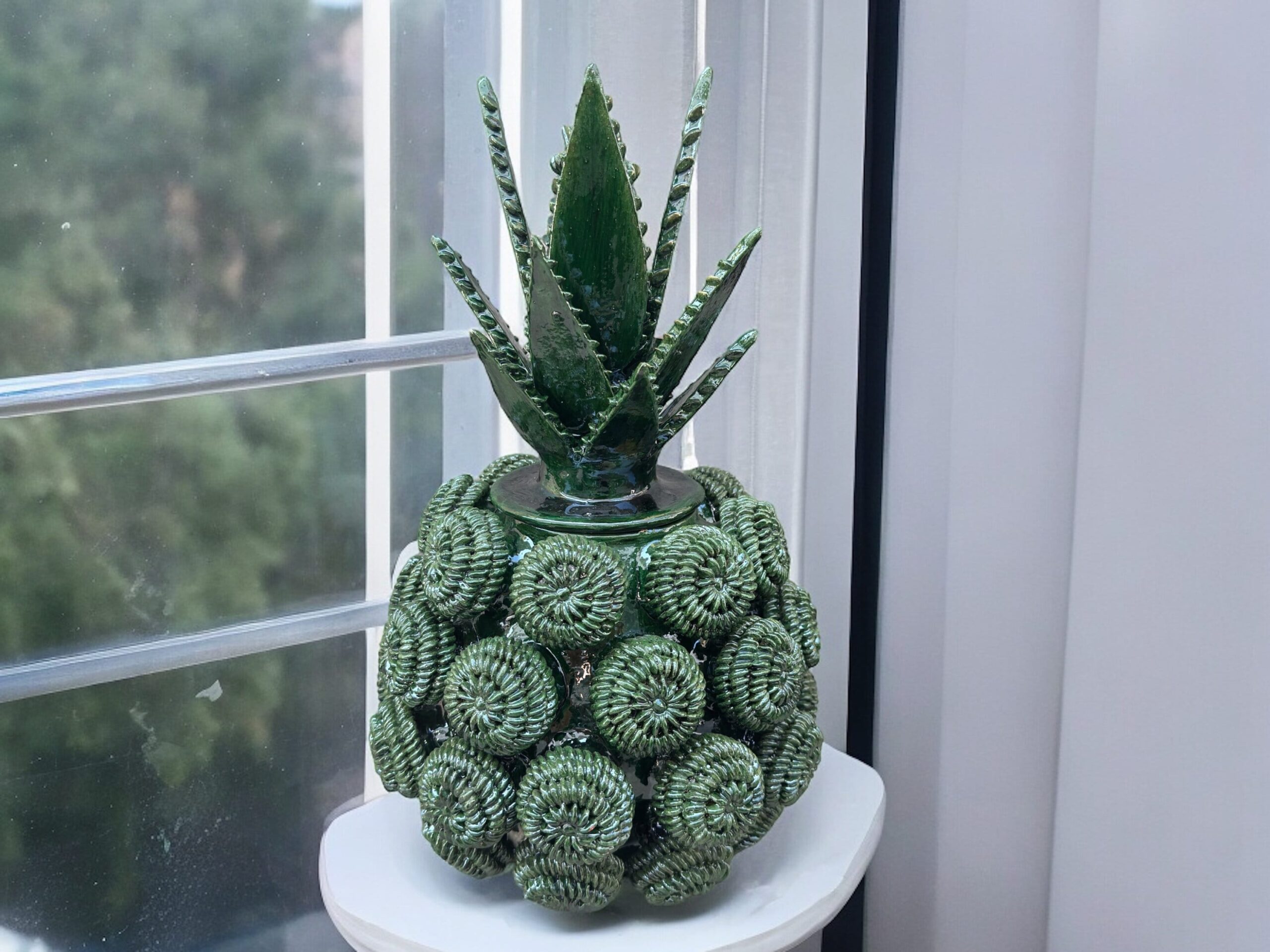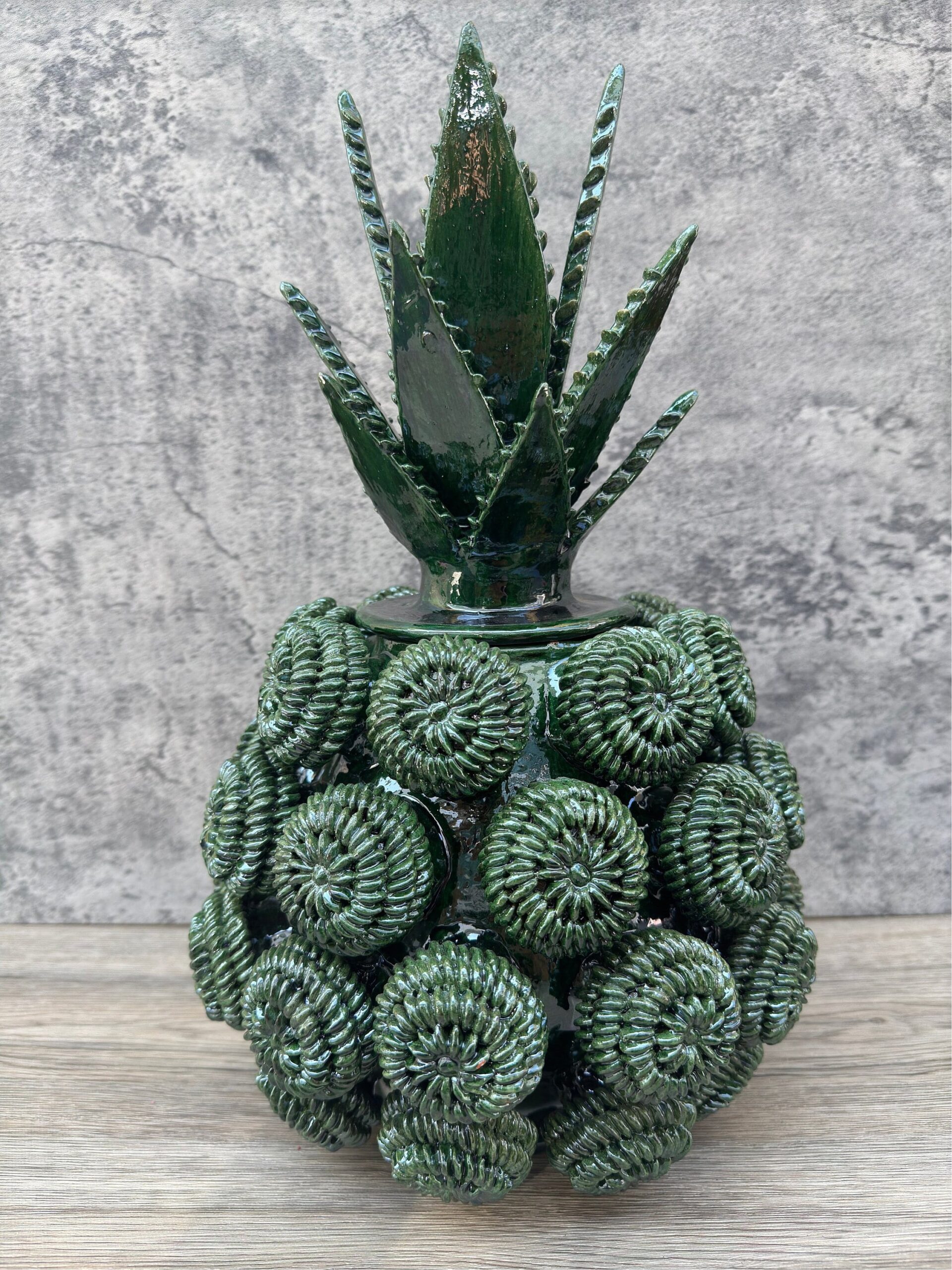 The pineapple sculpture of Michoacan is distinguished in Popular Art in Mexico not only for its quality, but also for the ancestral techniques they use, making a fusion of prehispanic techniques. Glazed clay, named for its glazed, glass-like appearance.