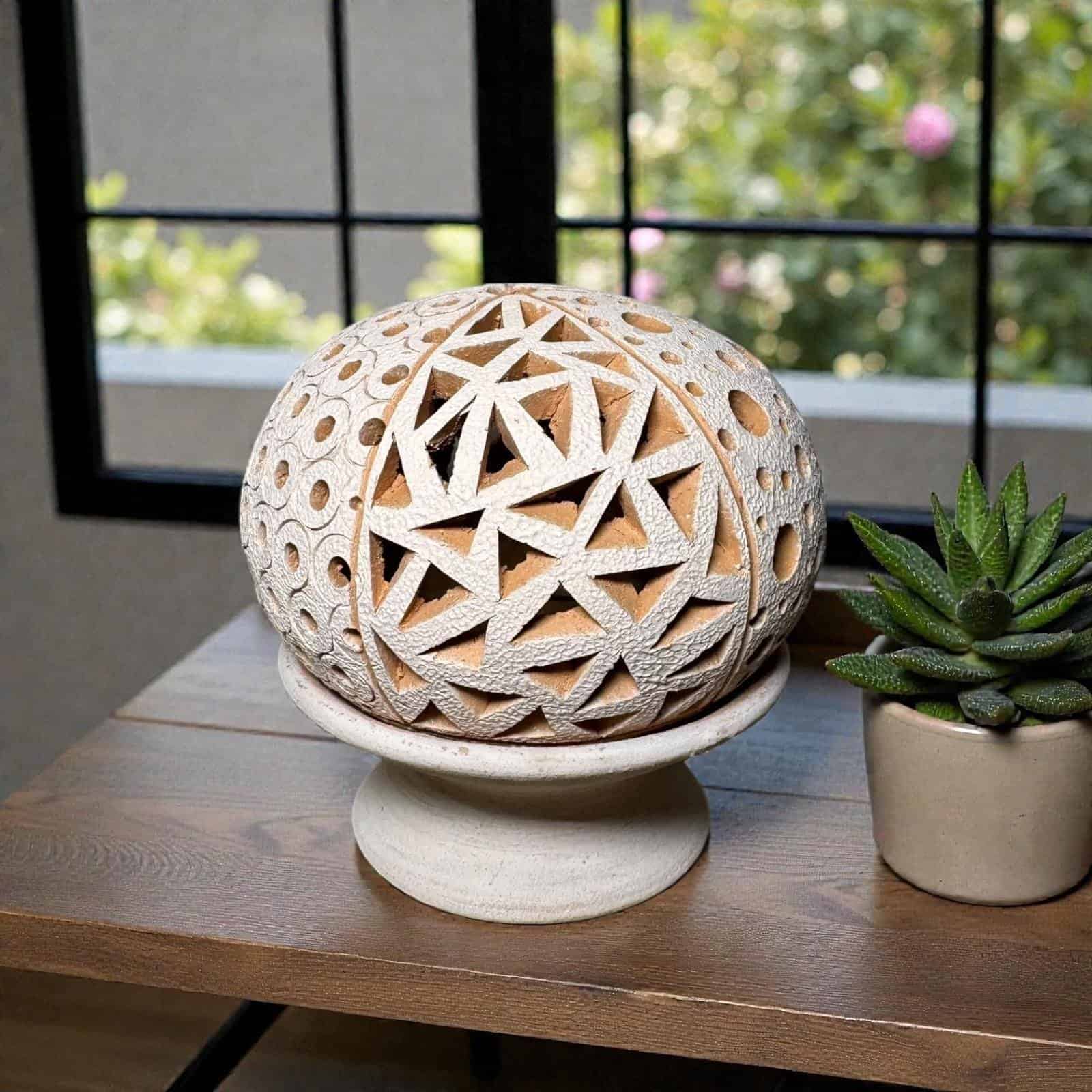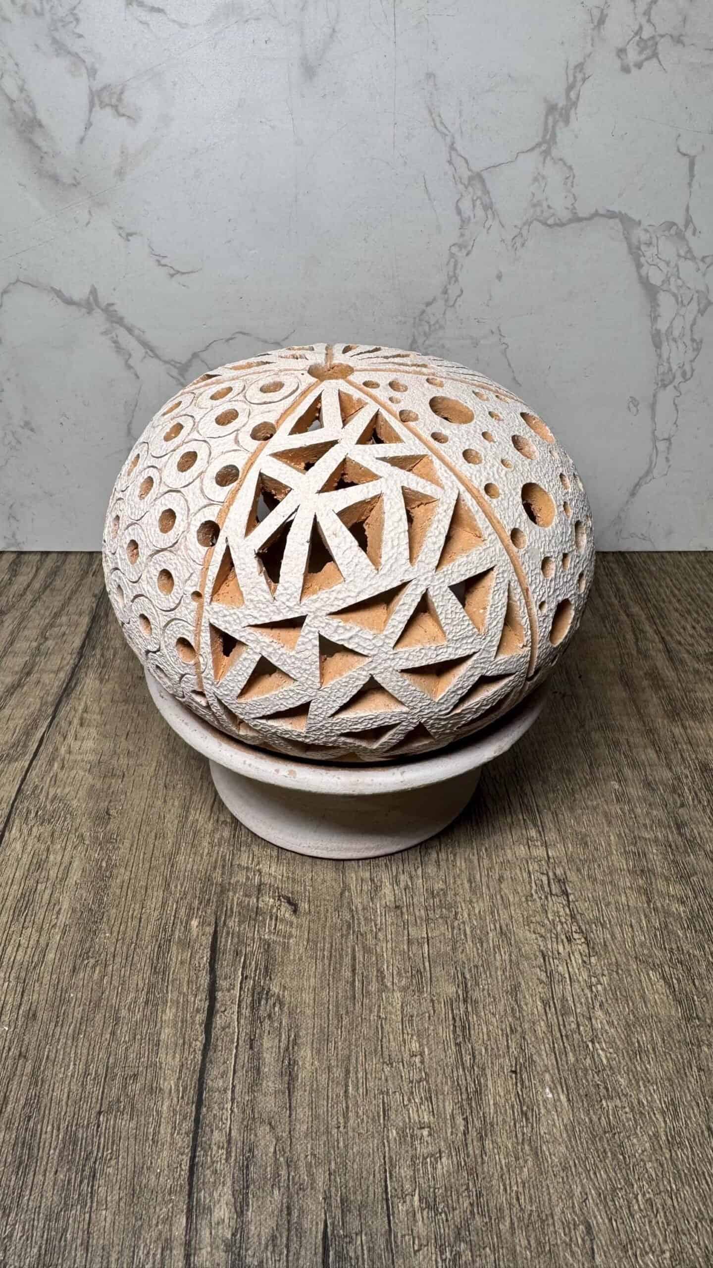 Each piece is sculpted from natural terracotta clay and meticulously carved with geometric cut-out patterns that allow light to softly glow through, creating a cozy and inviting ambiance. Its organic texture and earthy tones make it a beautiful accent for modern, minimalist, boho, or Mexican-inspired interiors.