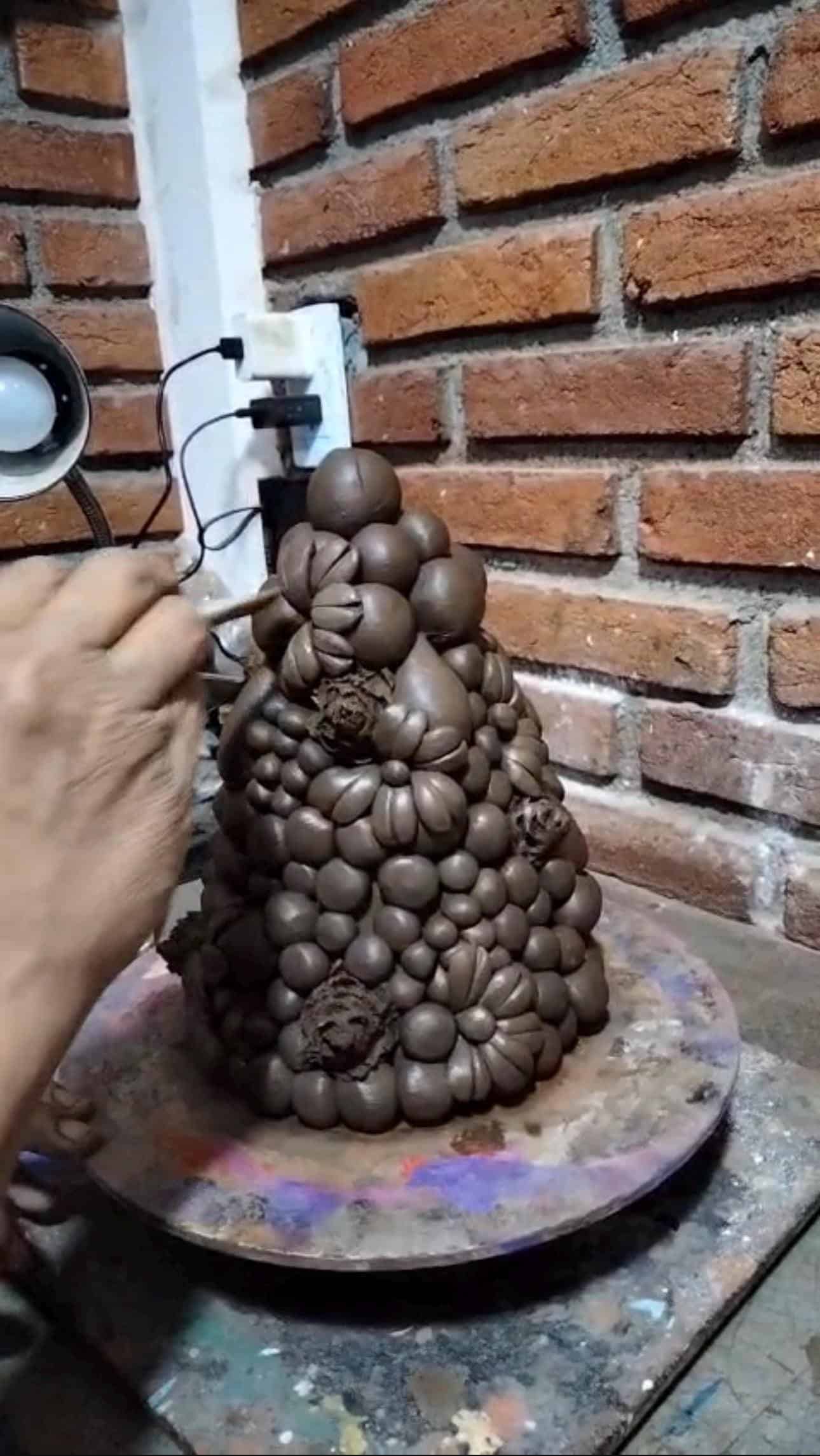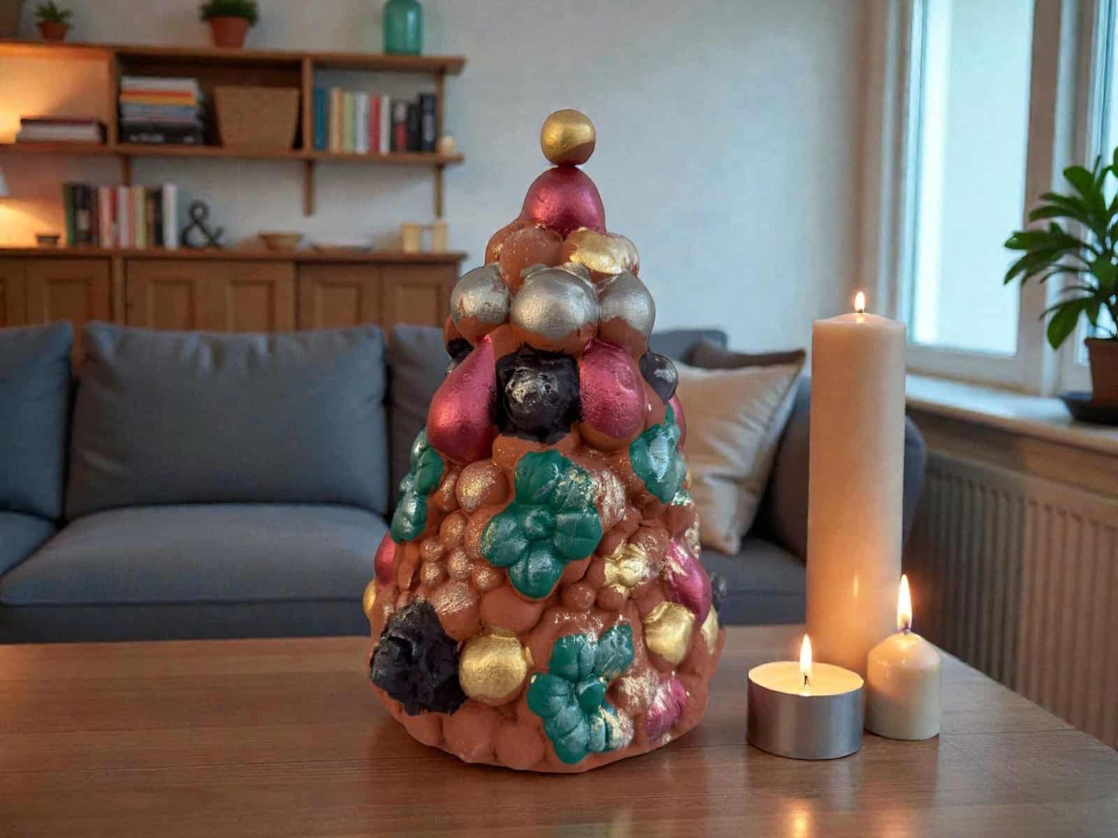 The design features an elegant cone form adorned with raised decorative elements and festive colors, finished with metallic accents that add warmth and character. Its sculptural texture and artisanal charm make it a stunning centerpiece for holiday tables, shelves, or mantels.