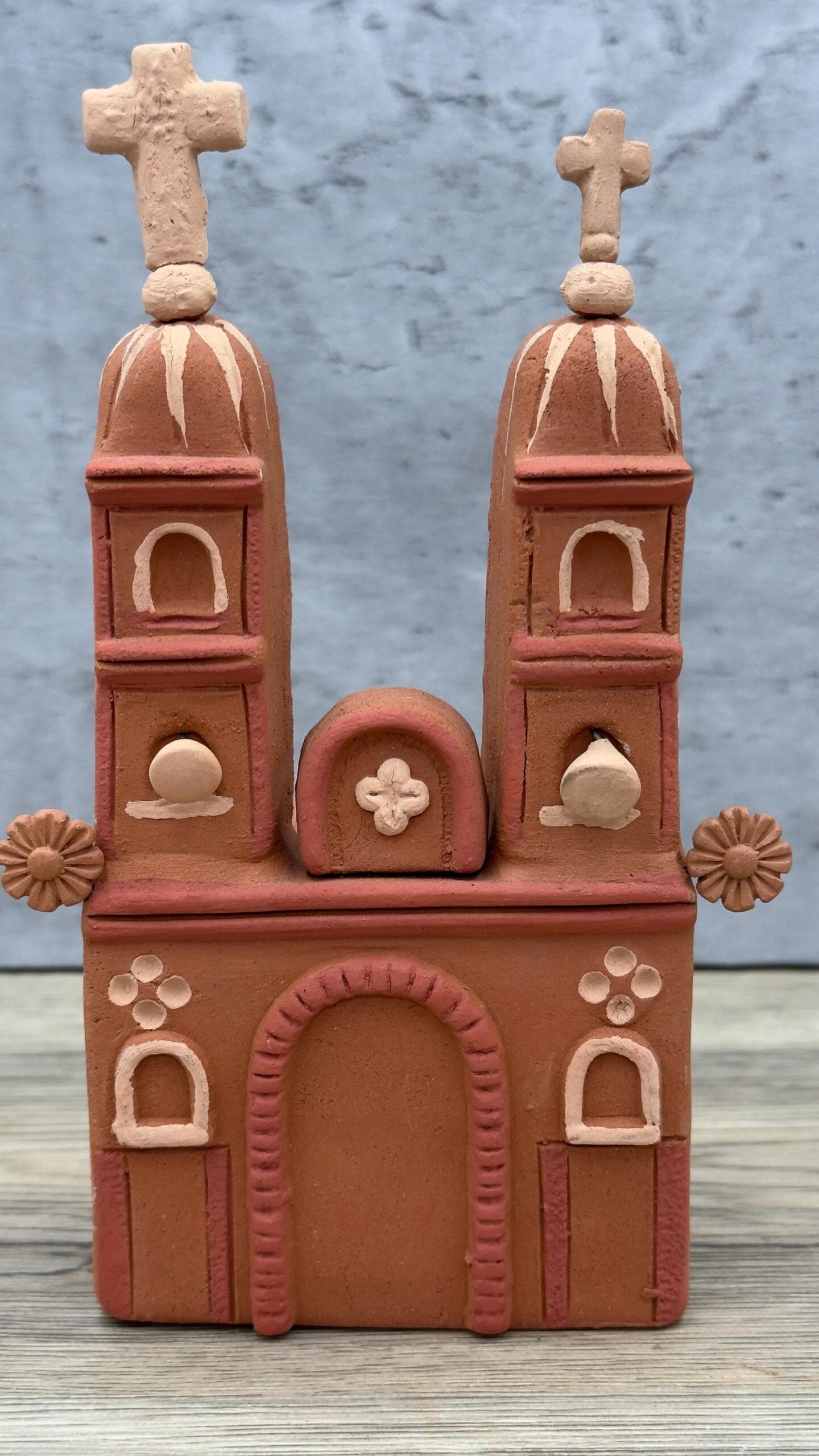 This beautiful handmade clay cathedral is a unique piece of Mexican folk art from Metepec, a town renowned for its traditional pottery. Crafted by skilled artisans using natural terracotta clay, this miniature church showcases intricate details, such as twin towers, small crosses, and floral accents, symbolizing both religious and cultural heritage.