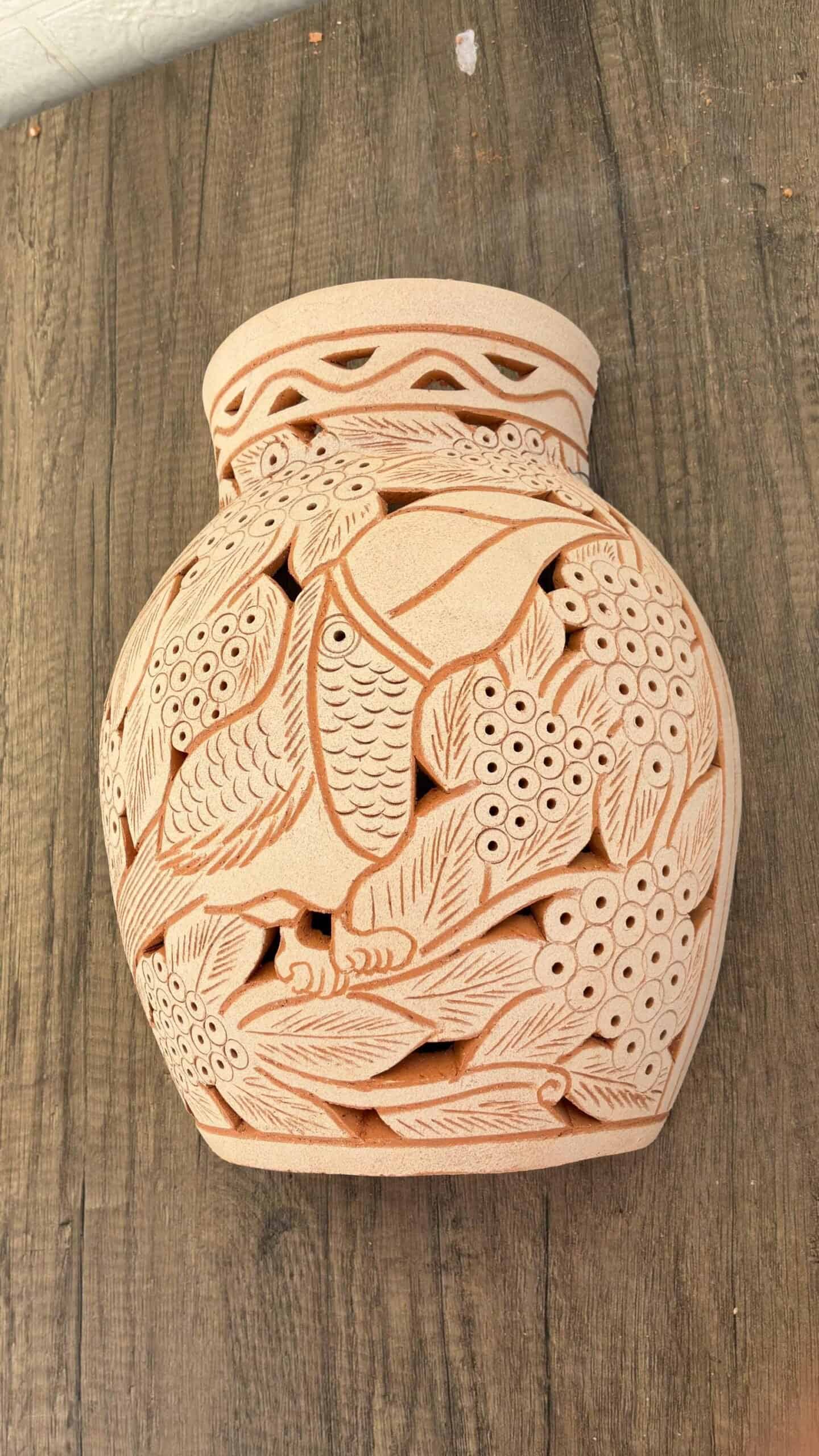 Carefully handcrafted by skilled artisans, this wall luminary features intricate cut-out patterns that allow the light to softly filter through, creating warm and inviting shadows on your walls. Its natural clay finish and organic design make it a perfect accent for modern, rustic, boho, or Mexican-inspired interiors.