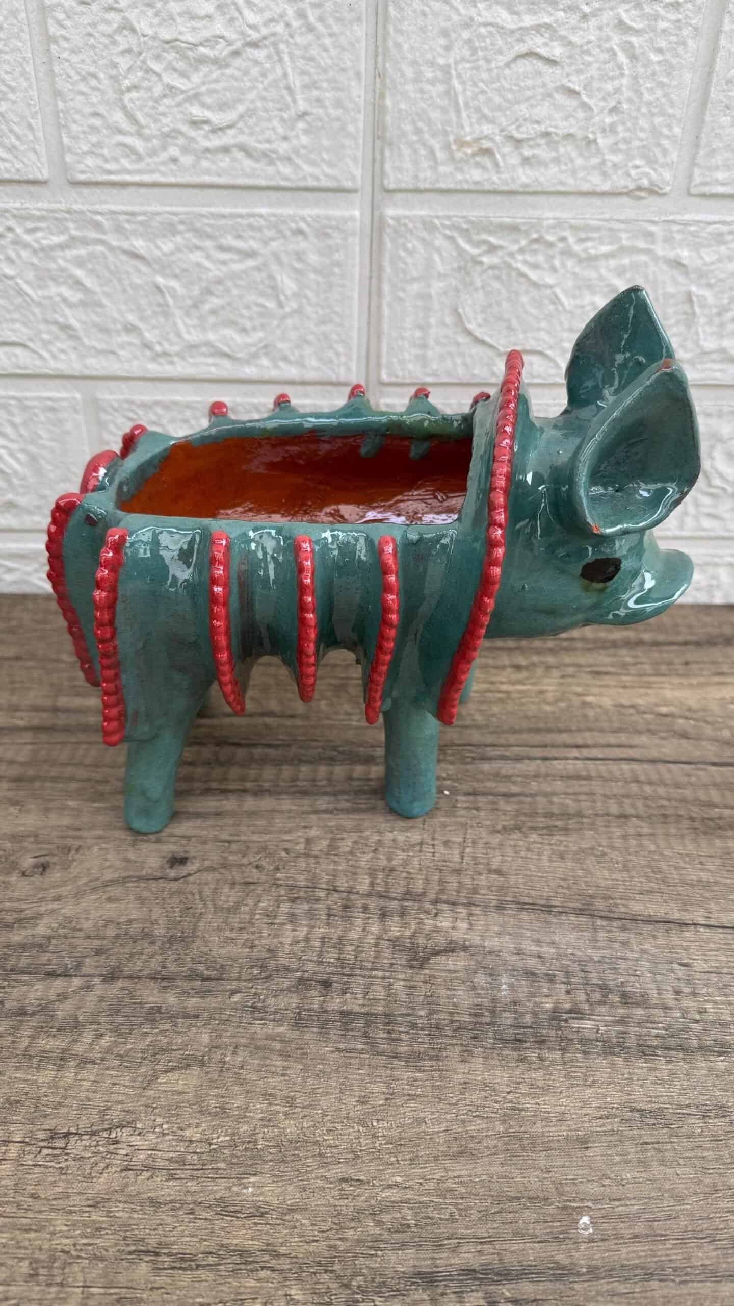 This handmade glazed pig planter or salsa bowl is a unique piece of Mexican folk art, carefully crafted by artisans in Michoacán, Mexico using traditional ceramic techniques passed down through generations.
