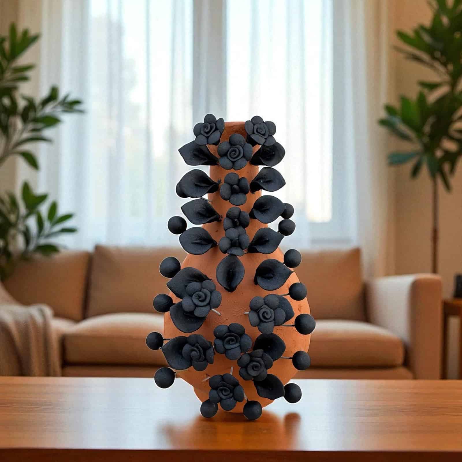 The contrast between the warm clay body and the matte black elements creates a modern twist on a traditional folk art style. Whether used as a decorative centerpiece or as a standalone sculptural piece, this artisan vase adds authenticity and character to any space.