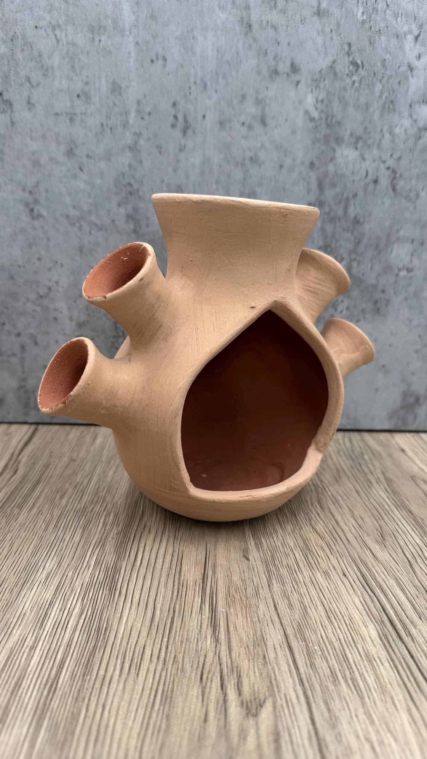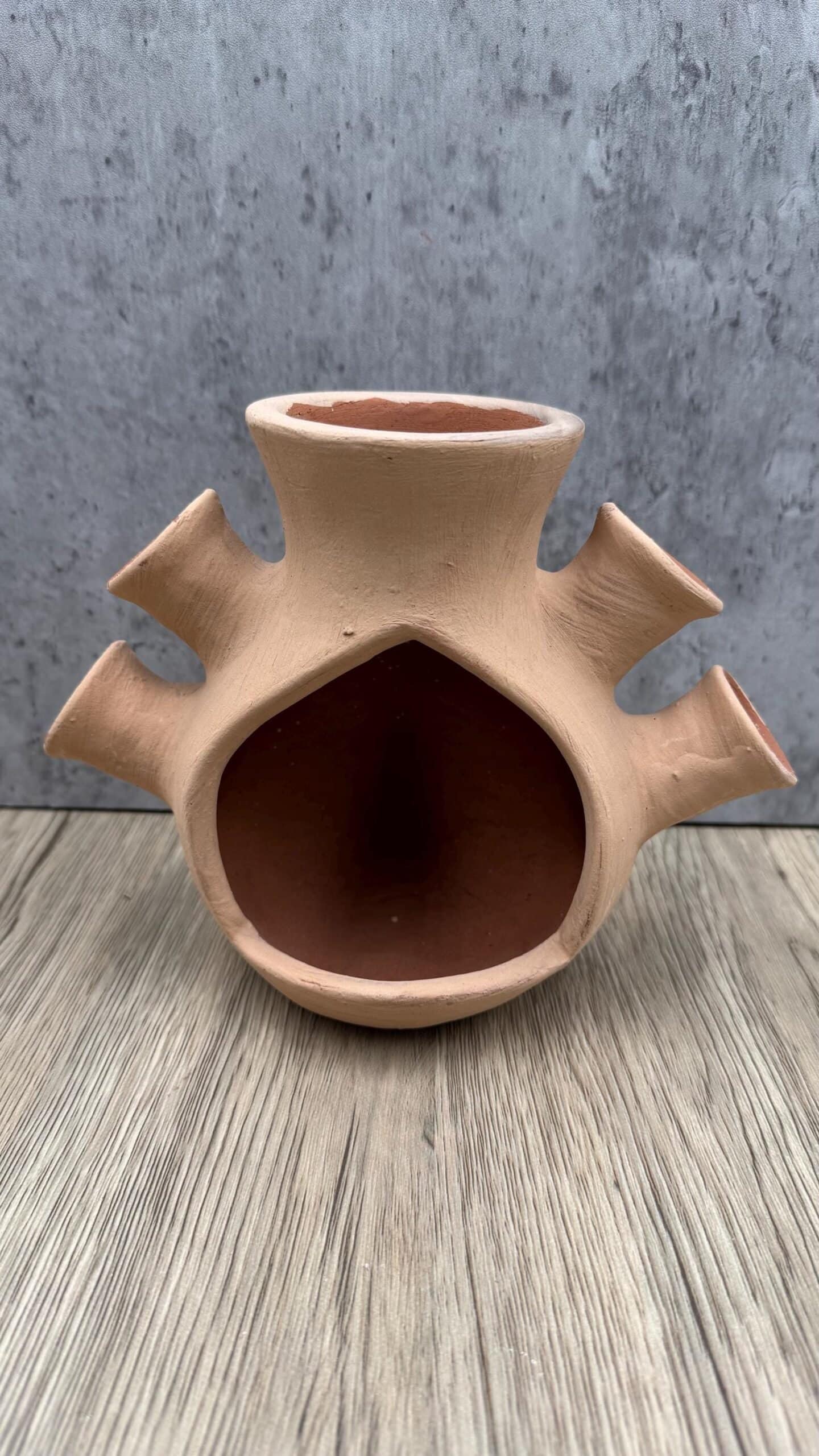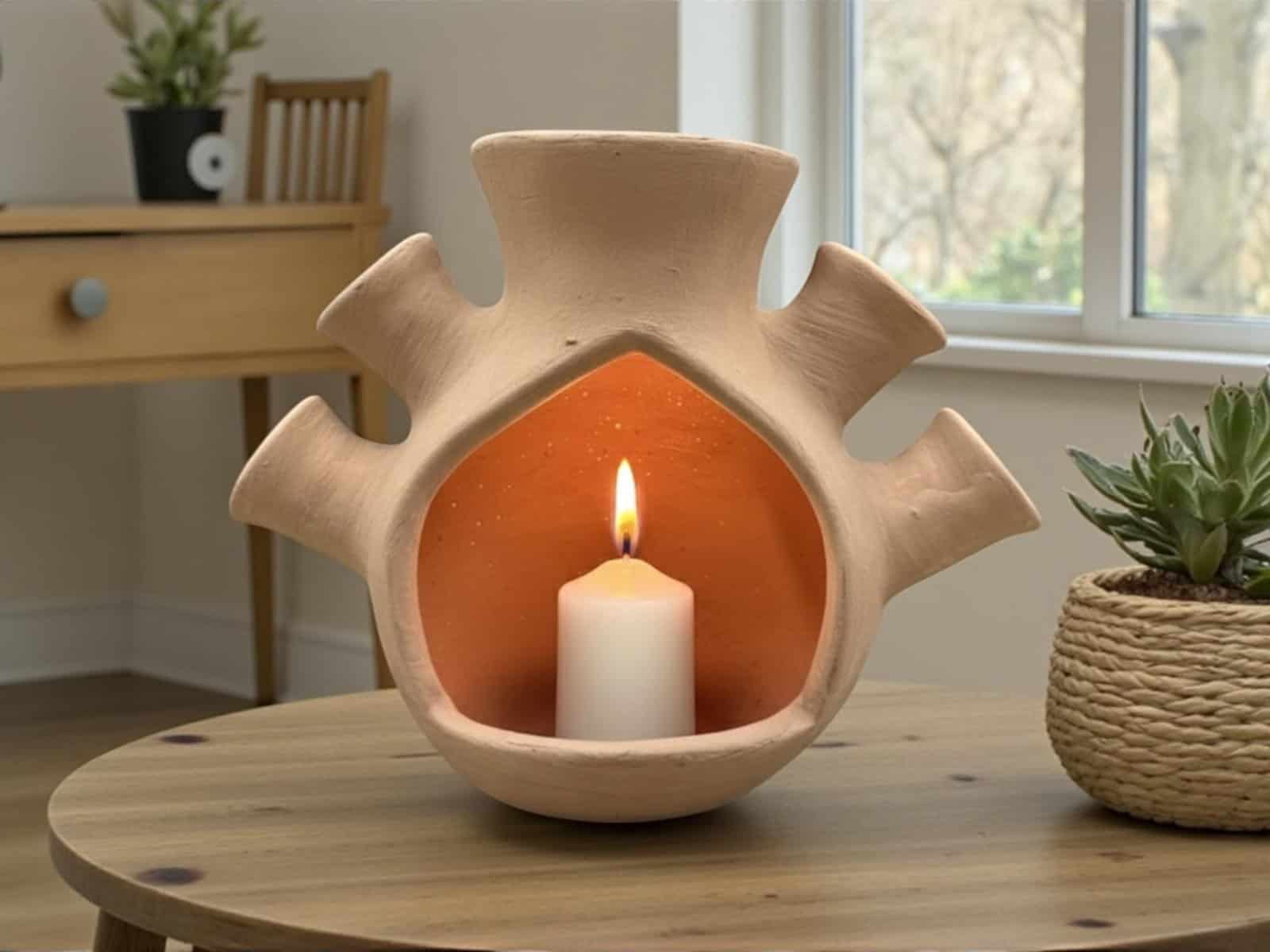 The warm terracotta tone and organic texture give it an authentic, rustic charm that adds character to any space. When a candle is lit inside, the soft glow creates a cozy and intimate atmosphere, perfect for living rooms, bedrooms, or special occasions.