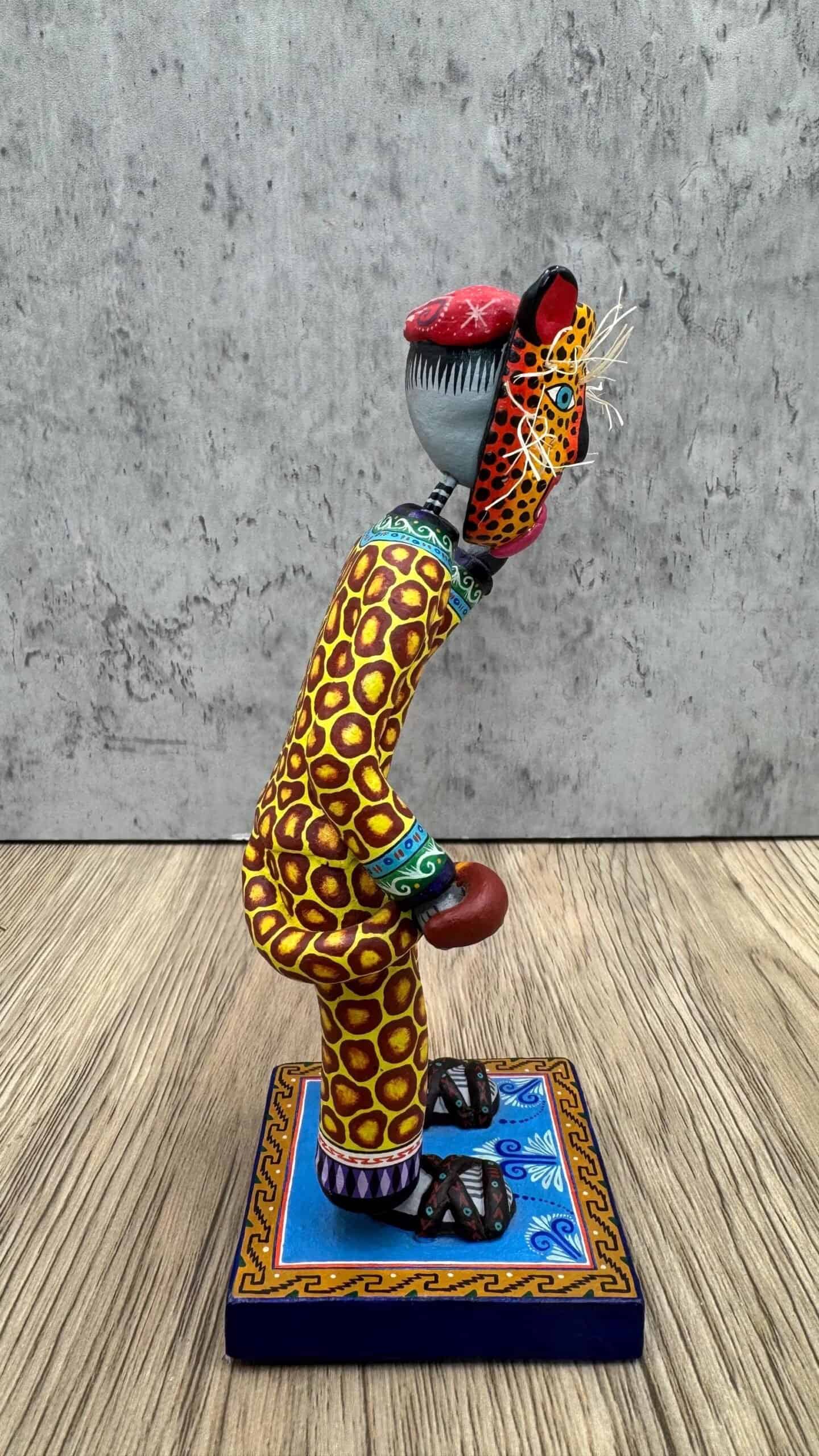 Each sculpture is carefully handcrafted and hand-painted by artisans, featuring bold patterns, vibrant colors, and detailed facial expression that bring movement and character to the figure. The dynamic pose captures the essence of ritual dance and storytelling.