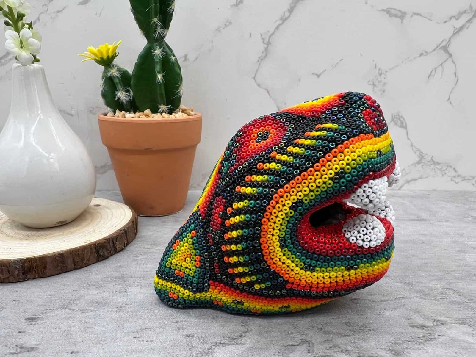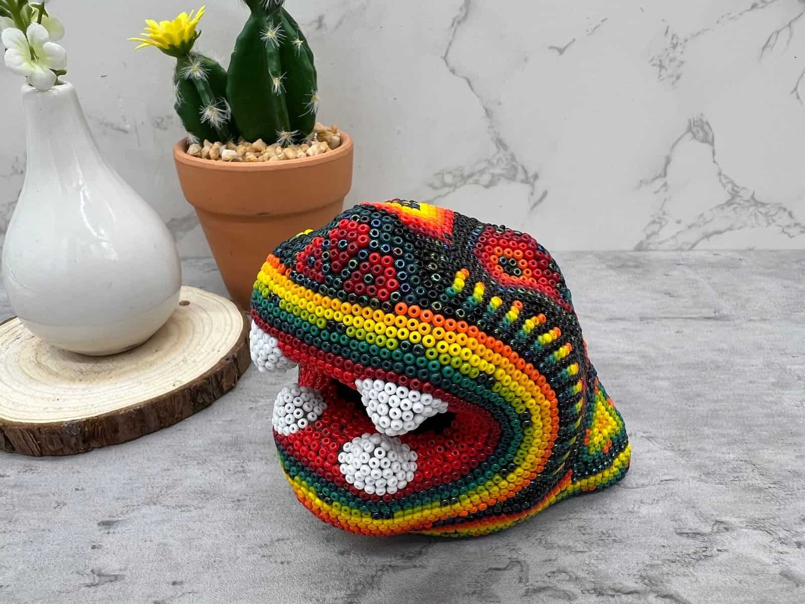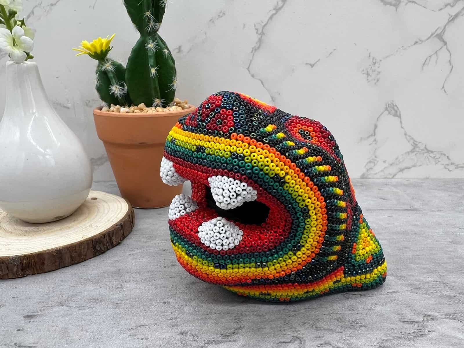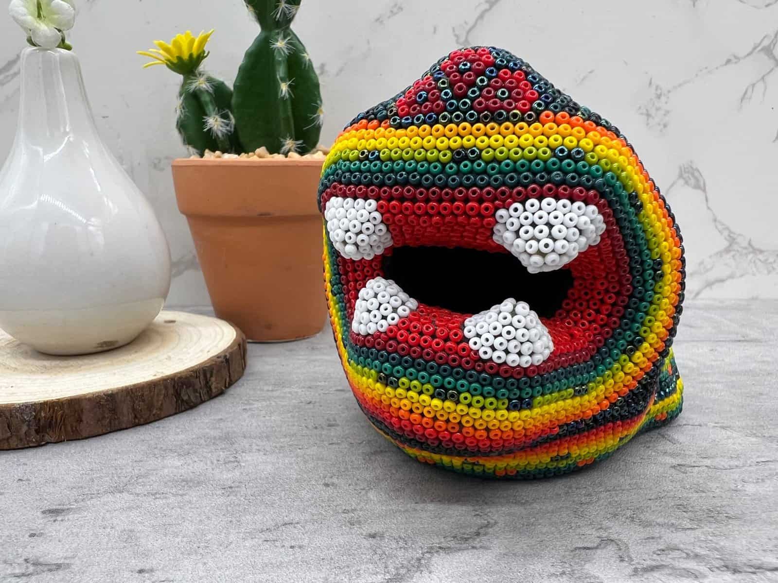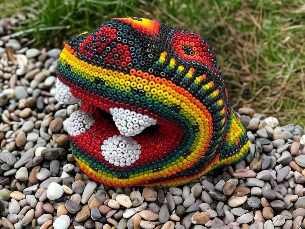 Wixárika Huichol bead art is a traditional form of art practiced by the Wixárika people of western Mexico. This intricate art form involves applying small glass or plastic beads to a surface, such as a wooden or gourd object, using beeswax or resin as an adhesive.