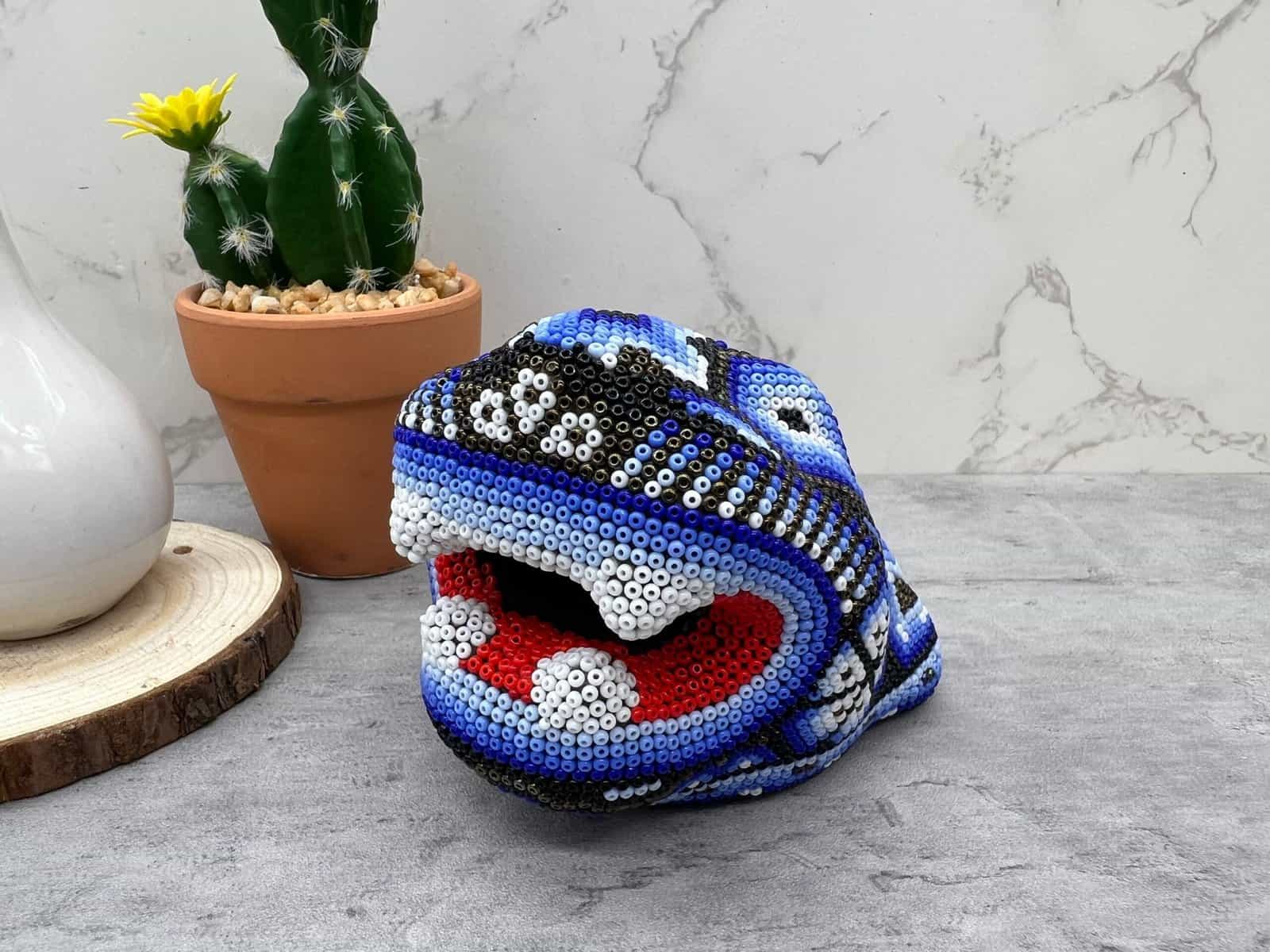 Wixárika Huichol bead art is a traditional form of art practiced by the Wixárika people of western Mexico. This intricate art form involves applying small glass or plastic beads to a surface, such as a wooden or gourd object, using beeswax or resin as an adhesive.