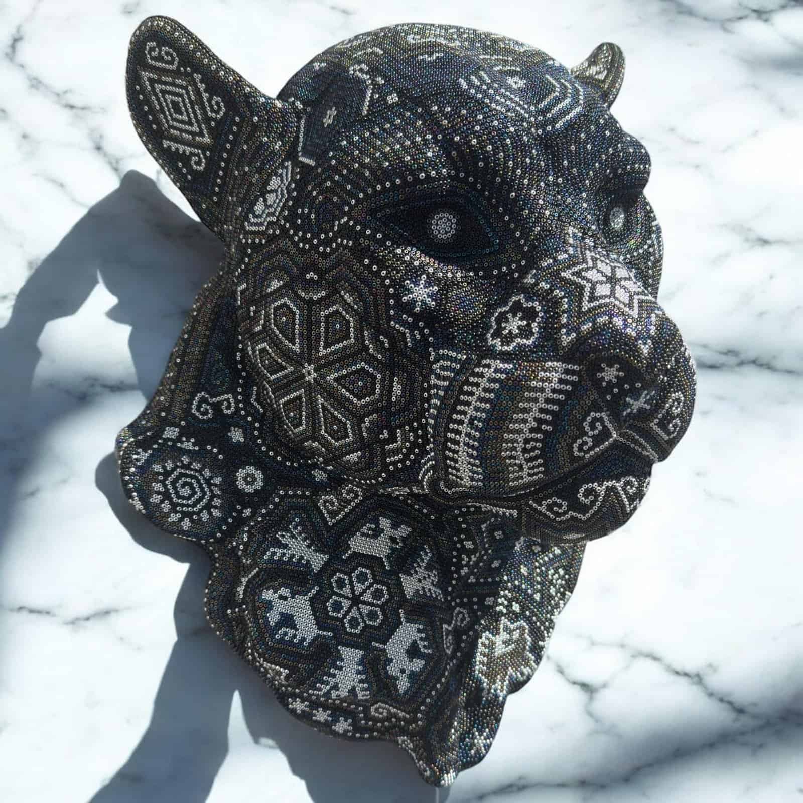 item details * Materials: Chaquiras, sculpture in resin and wax from Campeche. * Manufacturing process: The Campeche wax will be evenly dispersed on the resin sculpture, this wax will serve as a glue and allow the beads to be easily placed on the surface.