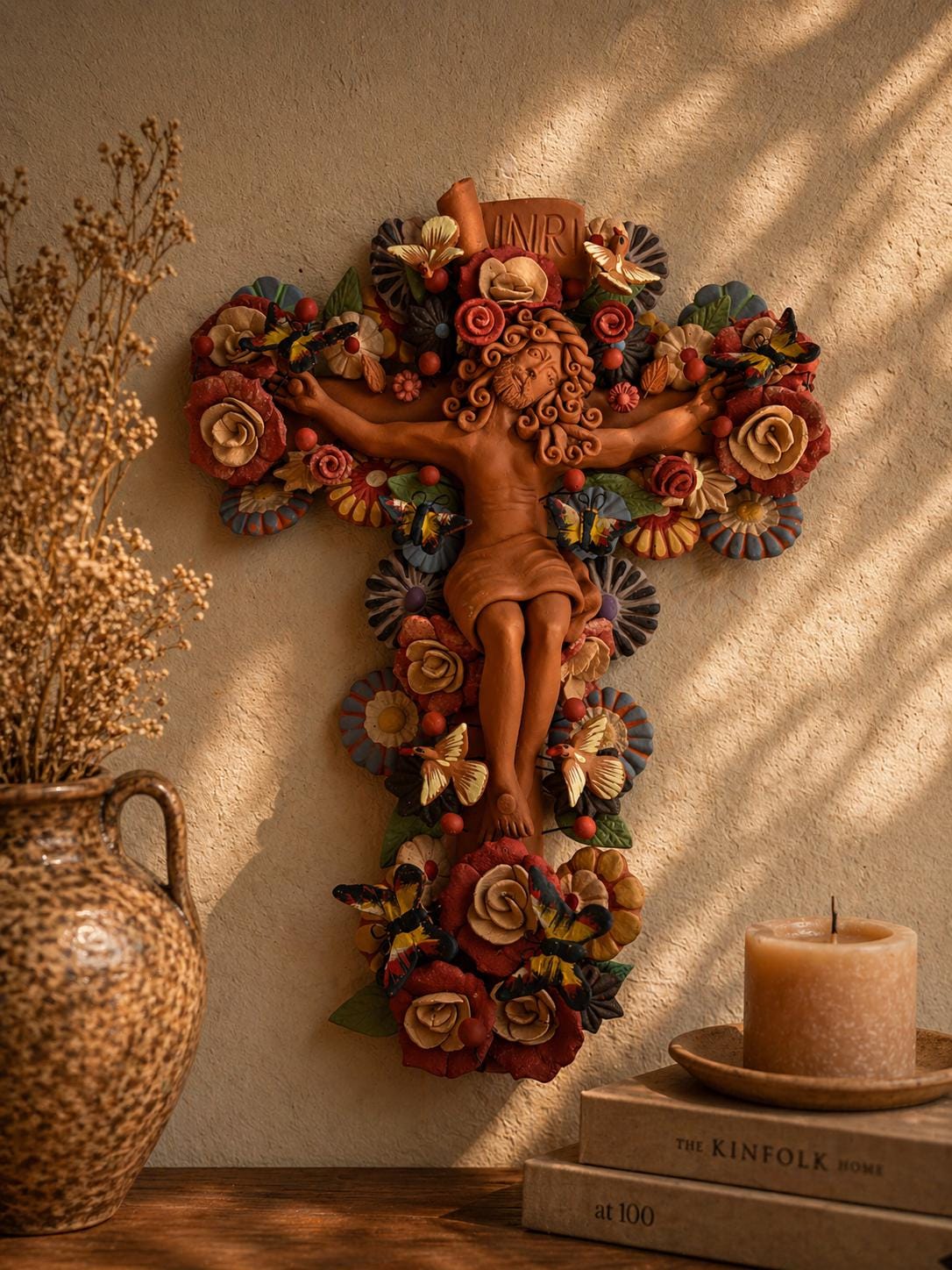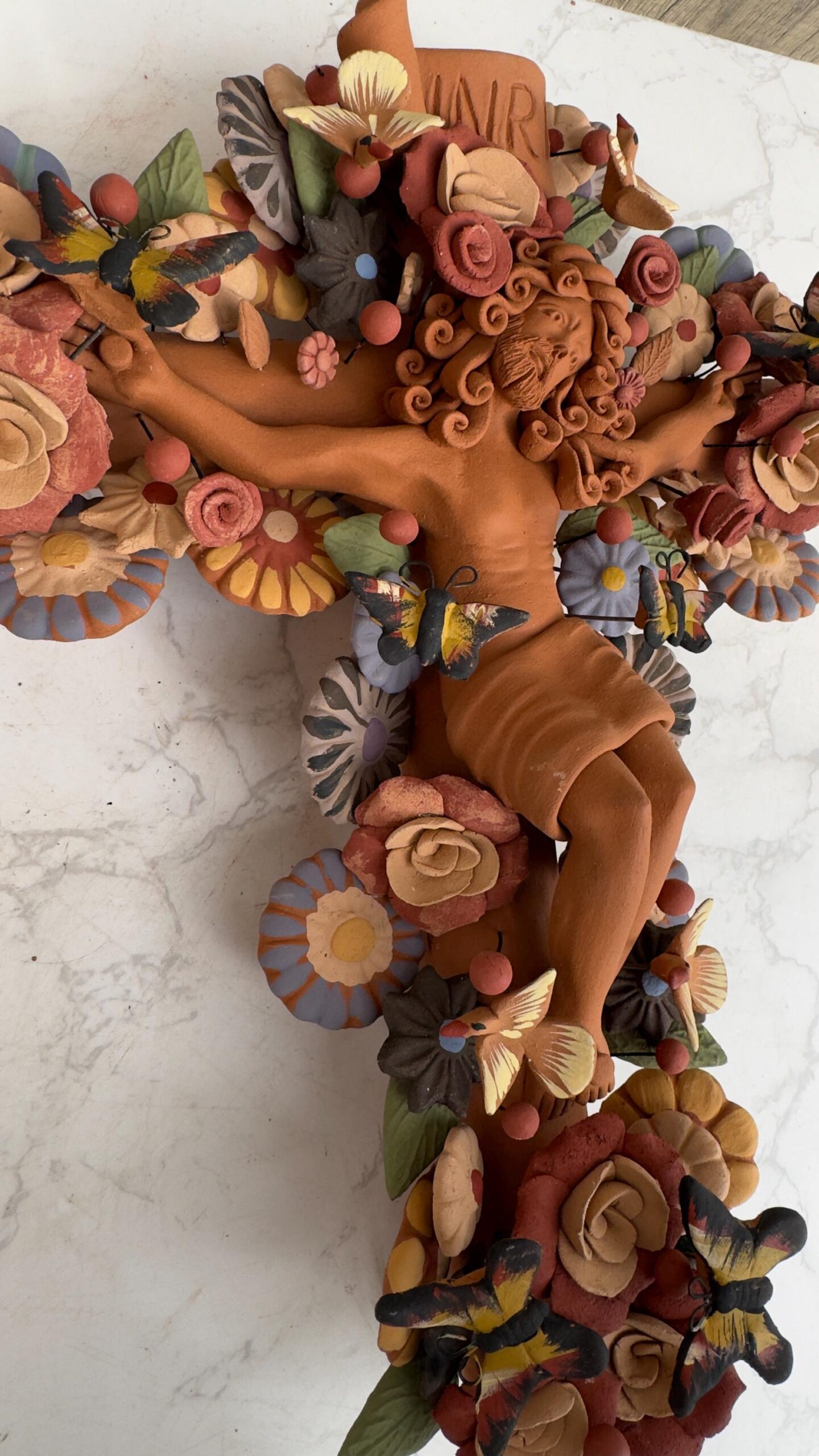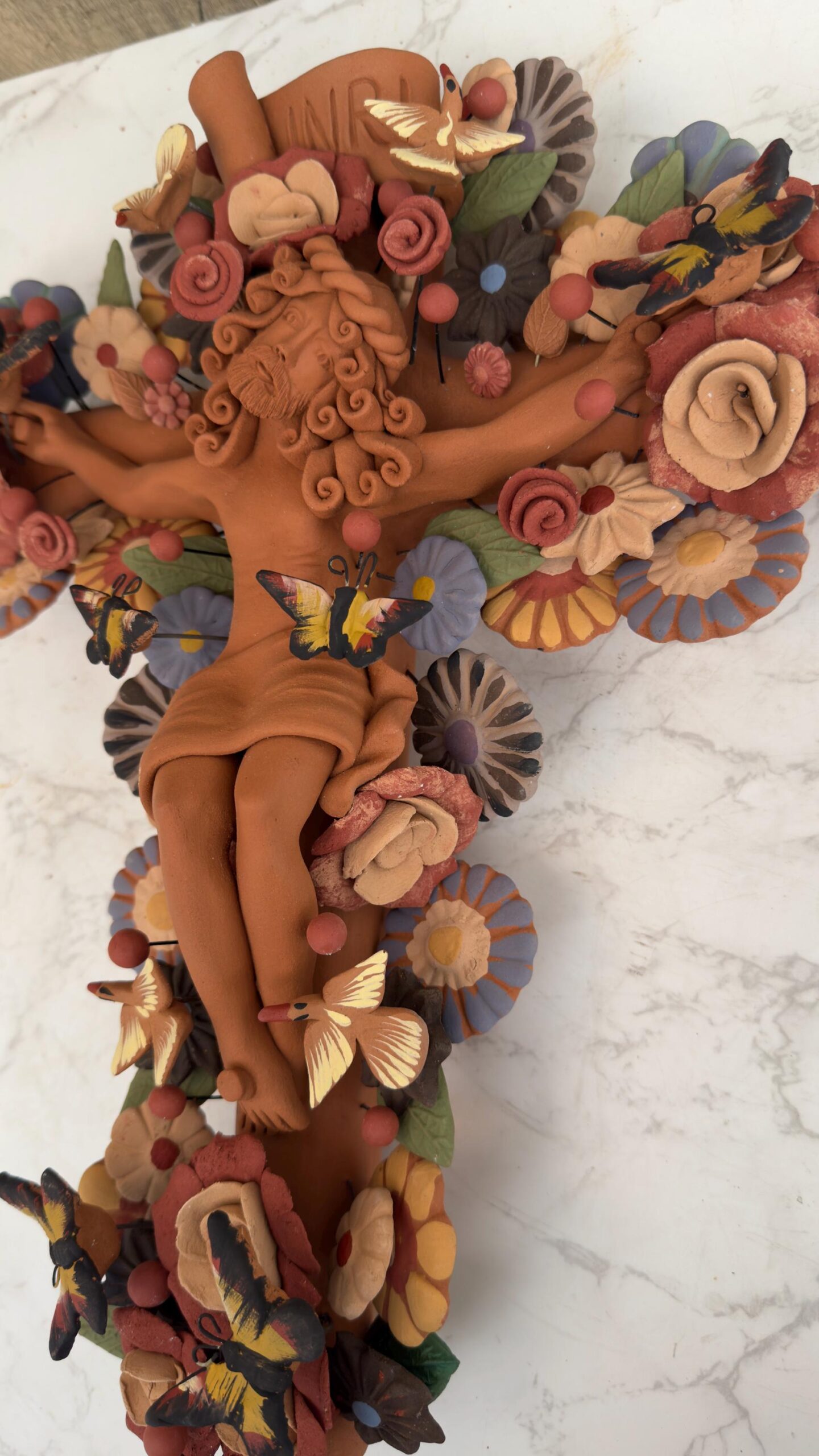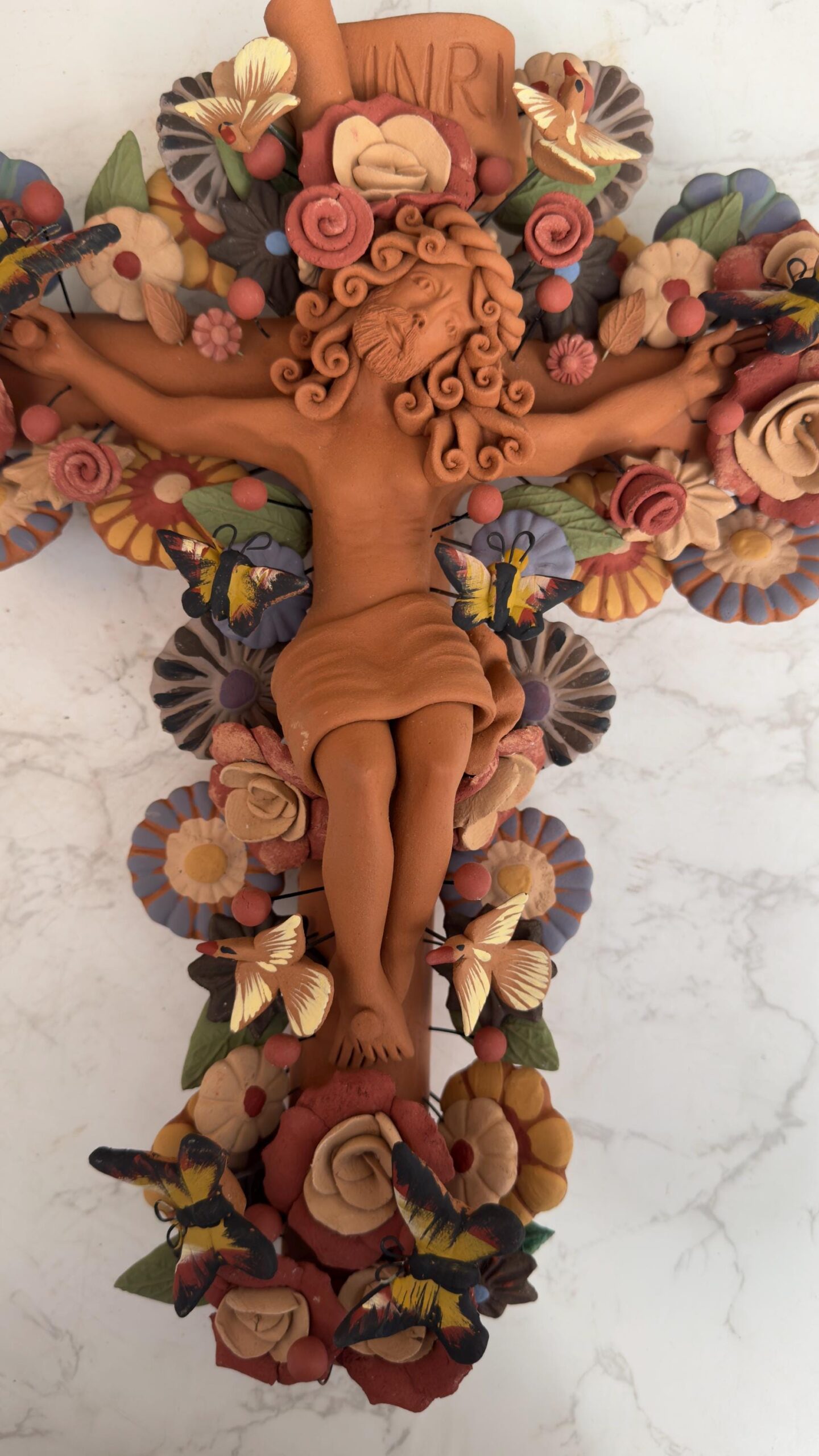 Jesus Christ Crucifix Metepec Clay Handmade Floral Wall Decor Sculpture