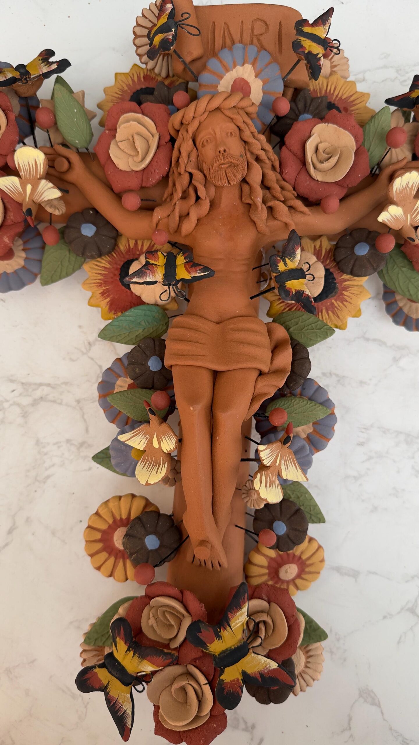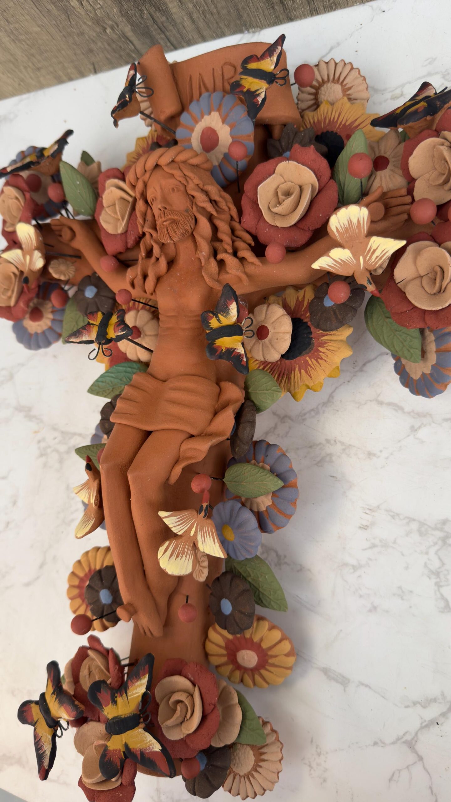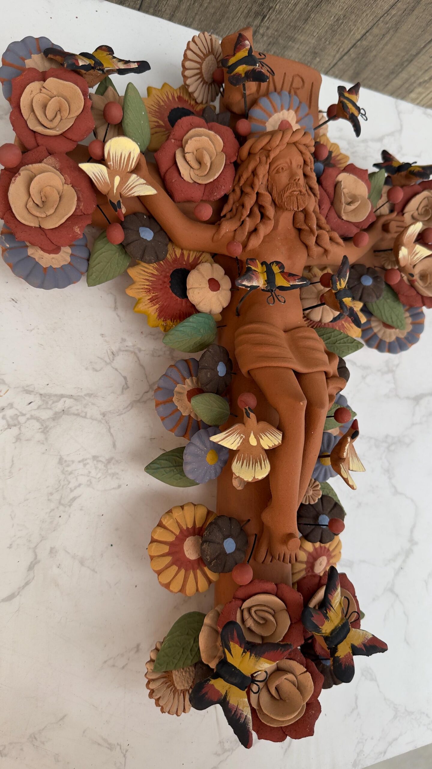 Jesus Christ with flowers decoration ideal to decorate your home or as a special gift, characteristic: – Handmade by Mexican artisans – Polychrome clay material – pigment clay natural colors – Dimentions 16” Tall, 13” Wide