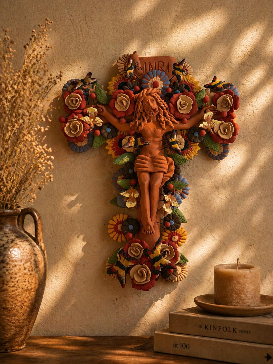 Immerse yourself in the spiritual beauty with this exquisite Metepec Clay Crucifix, a handcrafted piece of sacred art. Originating from the heart of Metepec Estado de Mexico, each crucifix is shaped from the rich, red clay unique to the region, known for its durability and earthy appeal. The figure of Jesus Christ is lovingly molded with attention to detail, bringing a sense of peace and reverence to any space. This piece is not just a religious symbol but a celebration of craftsmanship, as local artisans employ traditional techniques passed down through generations. The crucifix is kiln-fired, which ensures its strength and gives it a distinct texture that highlights the natural beauty of the clay. Perfect for a spiritual nook, it also serves as a focal point in any room, inviting contemplative moments and conversations. Each crucifix comes ready to hang, a testament to faith and tradition that enriches your home. It makes a thoughtful gift for religious milestones or as an addition to a collection of devotional items. Embrace this blend of spirituality and artistry, a unique treasure from artisans to your home.