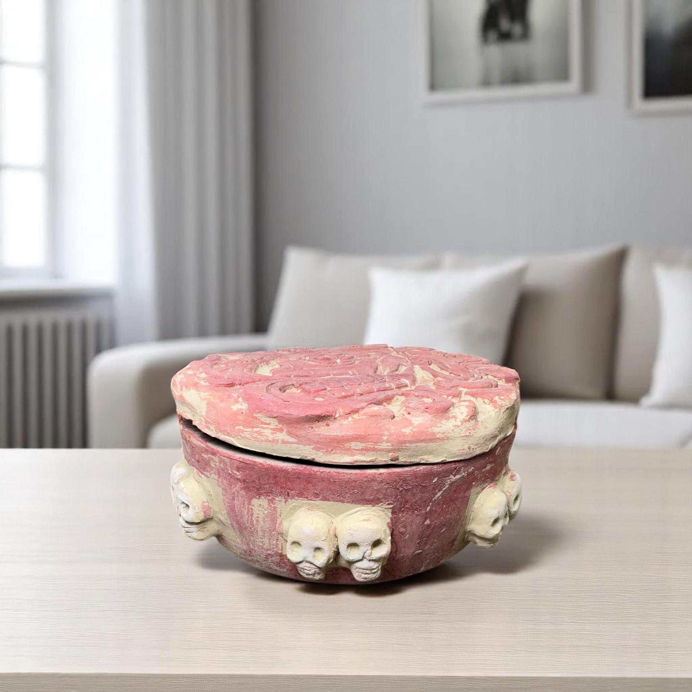 This unique jewelry box is inspired by ancient Mesoamerican art, featuring hand-carved skulls that represent the connection between life, death, and the underworld in Aztec culture. Traditionally, similar motifs were used in rituals to honor ancestors and deities associated with the afterlife, such as Mictlantecuhtli, the god of the underworld. The intricate skulls on this box symbolize the journey of the soul and the Aztec belief in the cyclical nature of life and death.