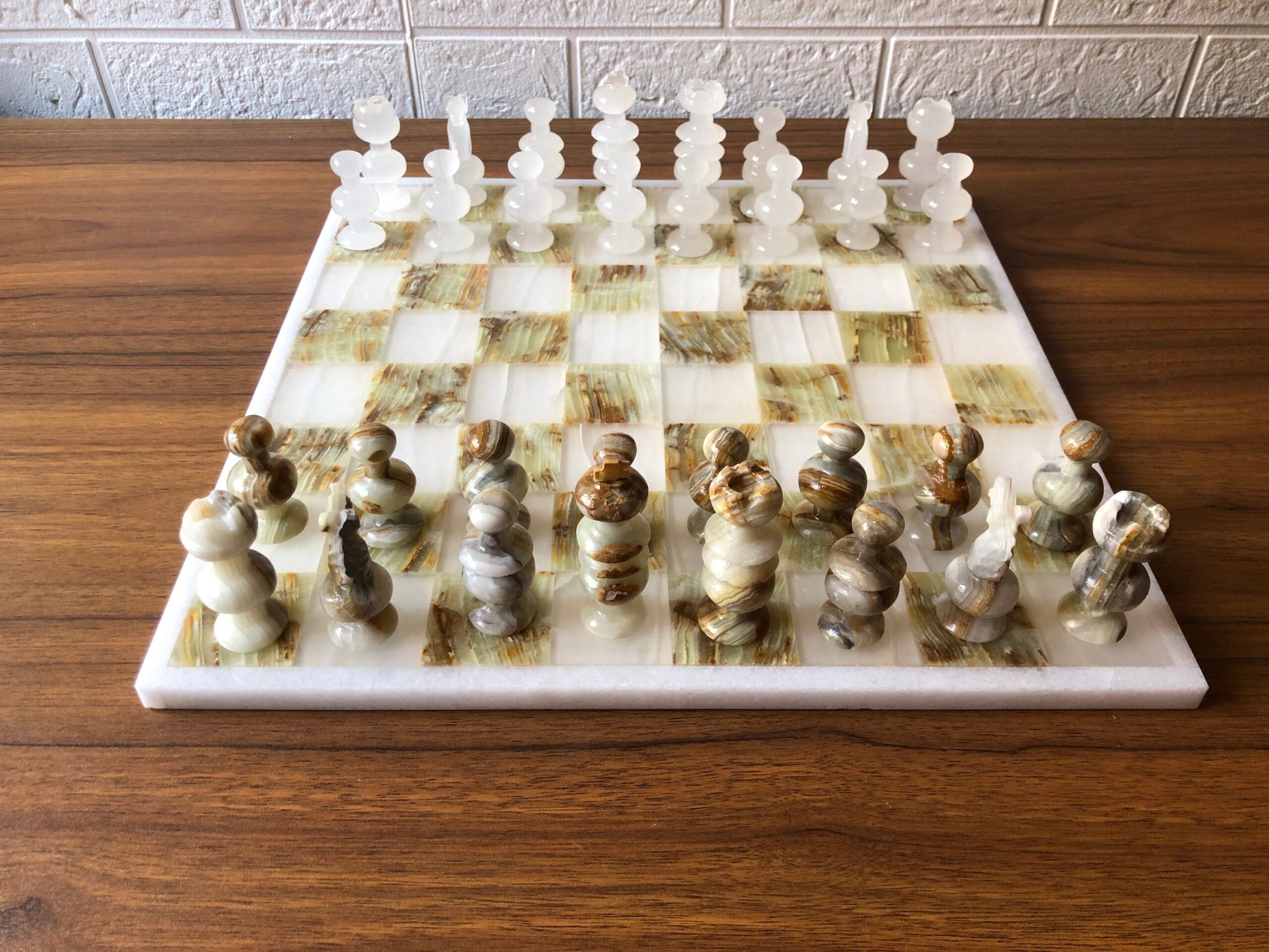 Características: – diseño inglés – Colores verdes y transparentes – Material de ónix – Dimensiones del tablero 13.77” x 13.77” – Las dimensiones de las piezas son: * Caballo, torre y alfiles 2.16” * Peones 1.77” * Reina 2.55” * Rey 3”