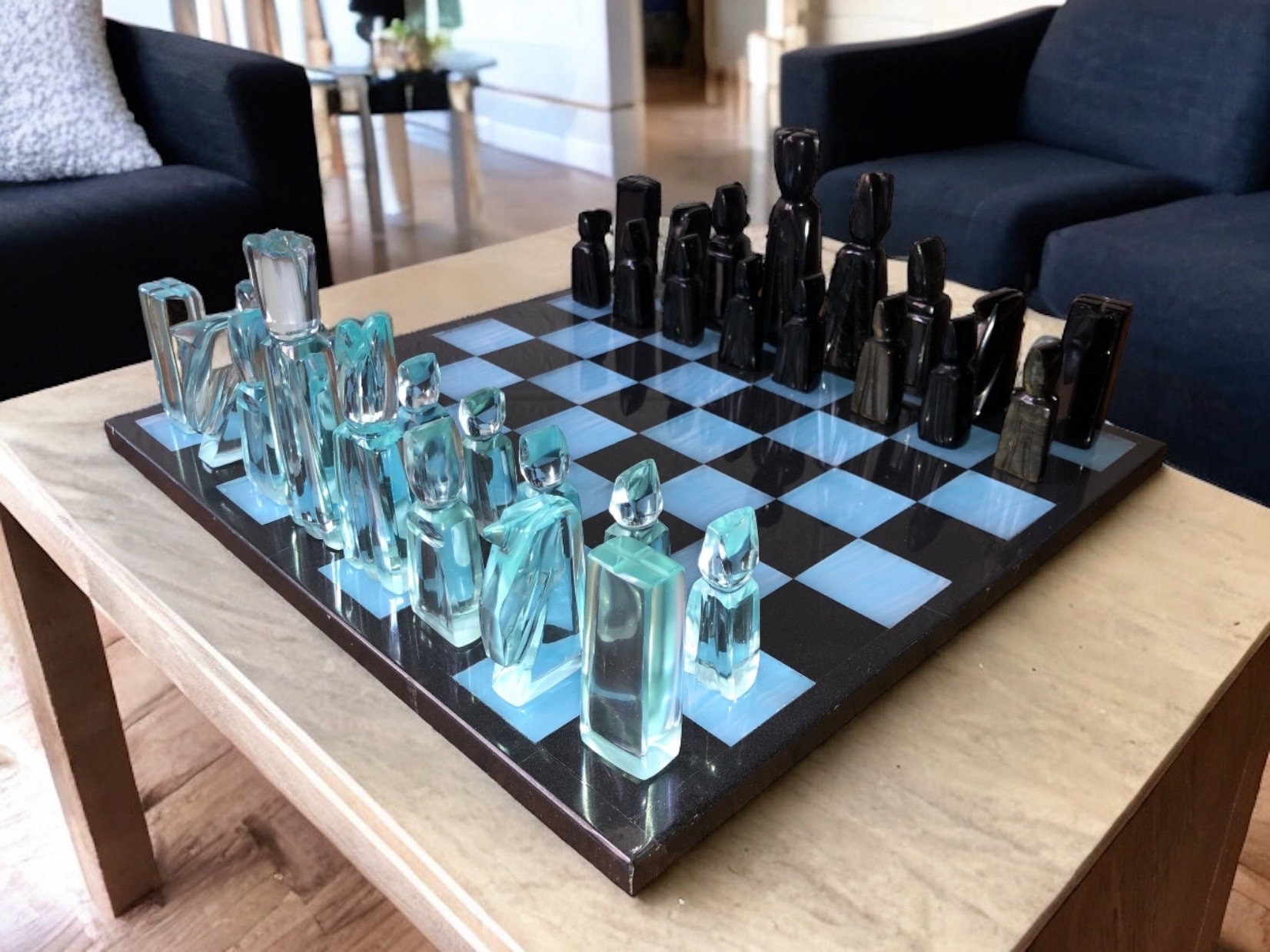Characteristics: – Black and blue marble and glass board – Black and blue obsidian and glass pieces – Board dimensions 13.77” x 13.77”