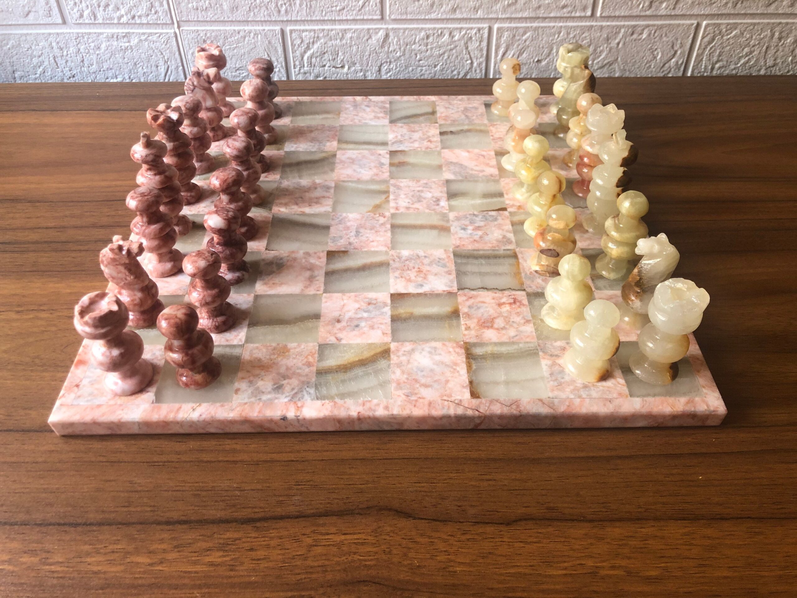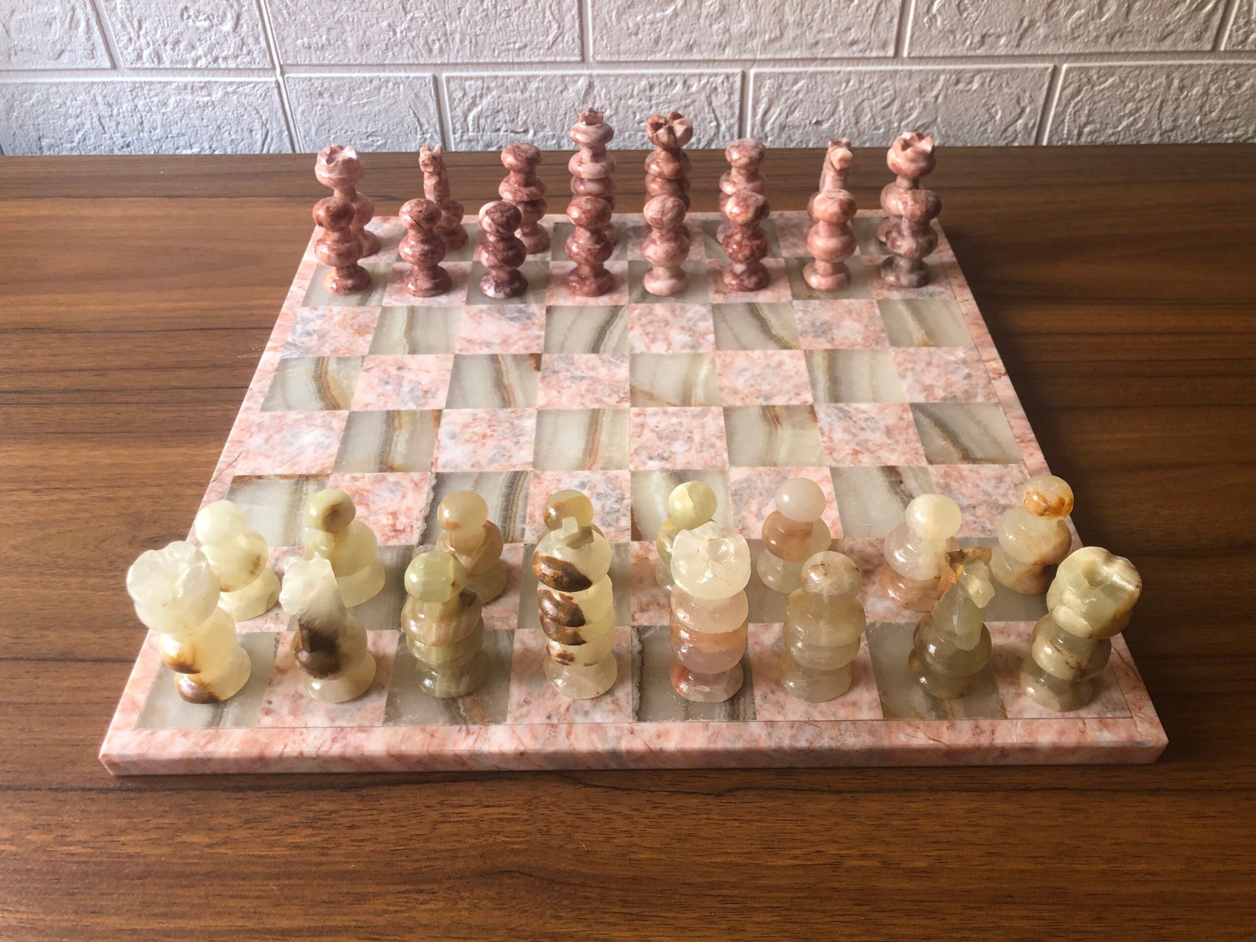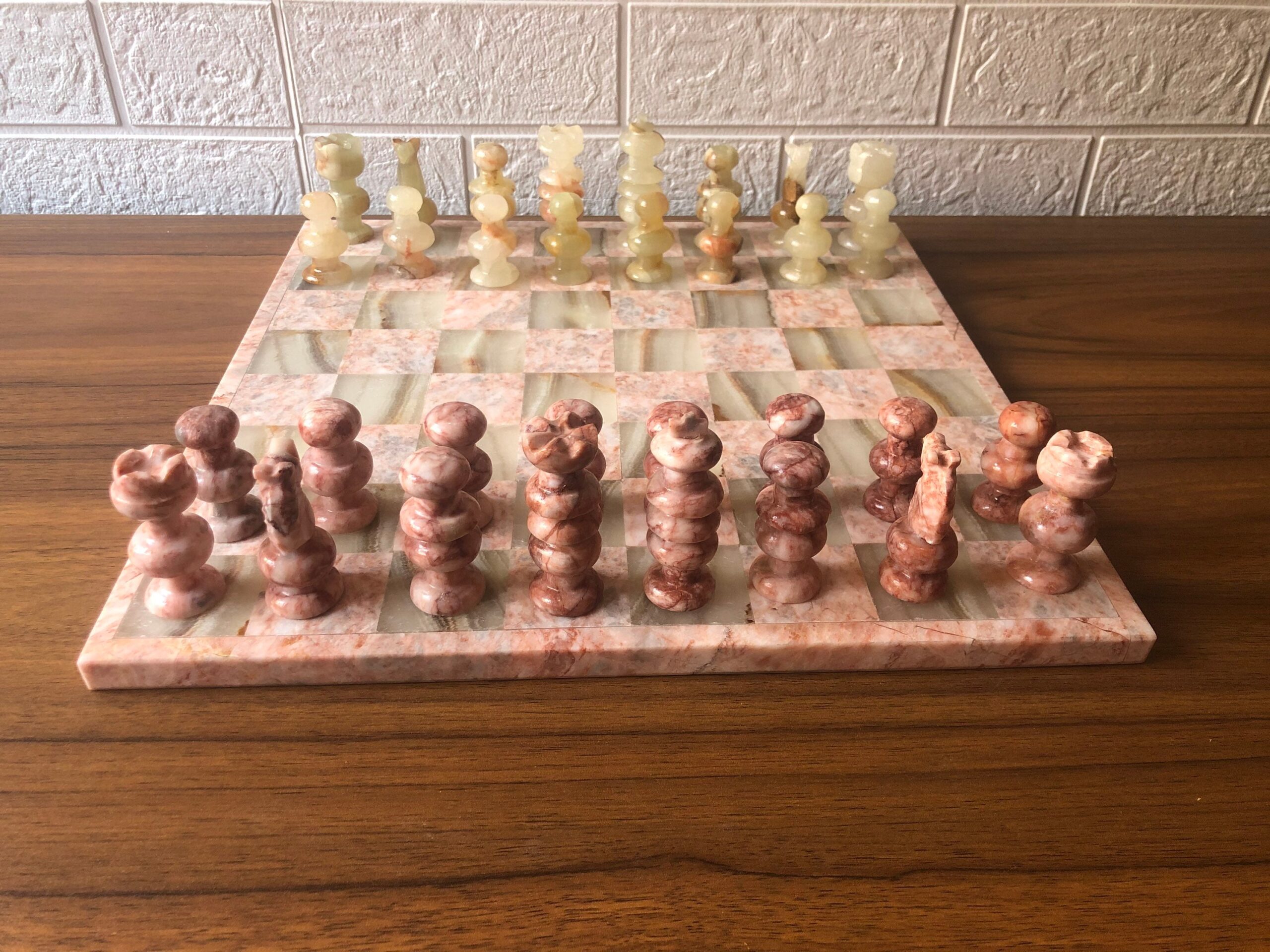 Characteristics: – English design – Pink and green colors – Marble and onyx materials. – Board dimensions 13.77” x 13.77” – The dimensions of the pieces are: * Knight, rook and bishops 2.16” * Pawns 1.77” * Queen 2.55” * King 3”