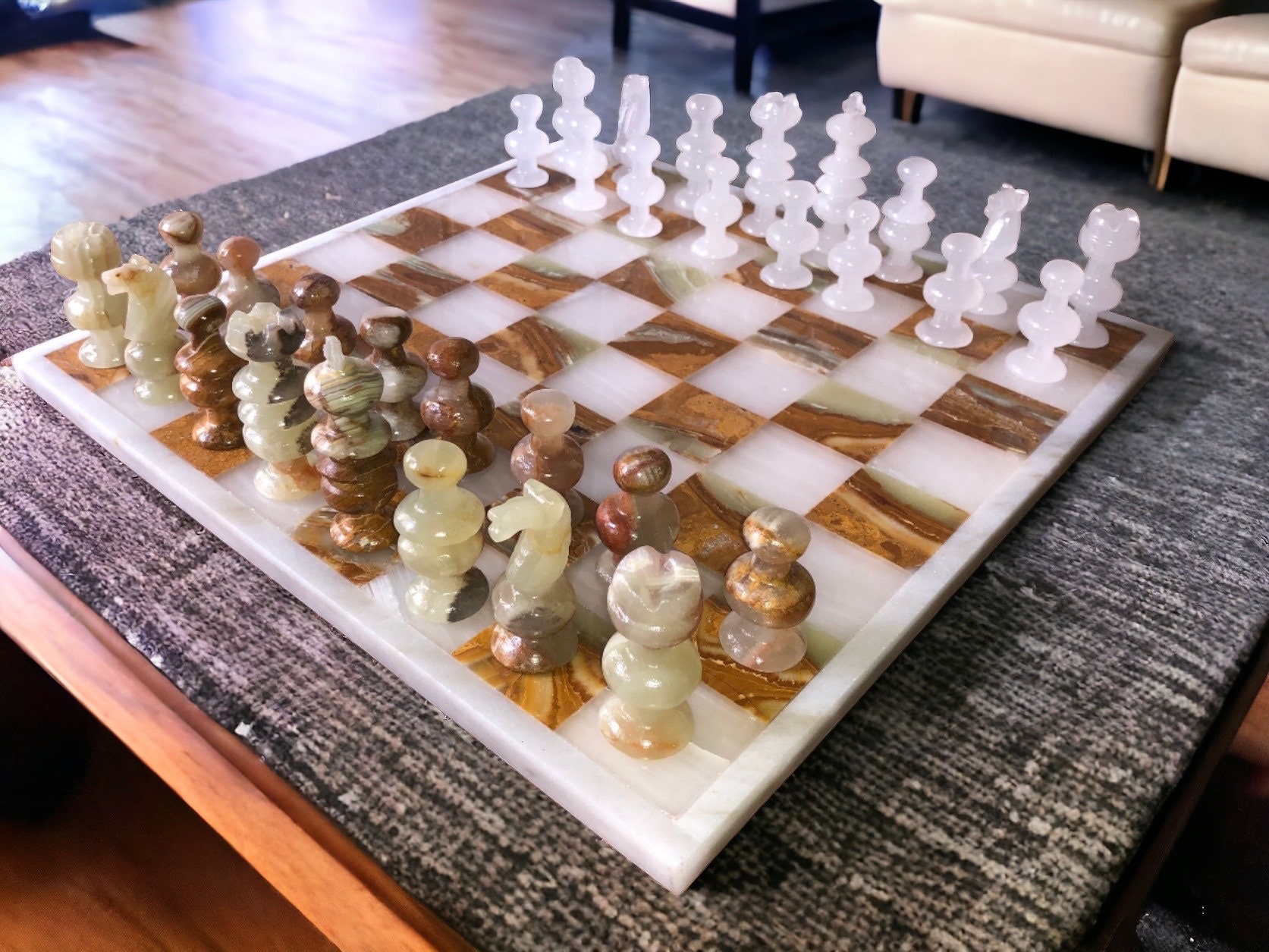 Notes: – Colors may vary slightly due to monitor settings – The board and the pieces will be sent in a very well protected box, each piece will have its own space so that they do not damage each other – Both pieces and board are hand carved, keep in mind there may be minor differences and irregularities from one piece to another – Some pieces or boards may have natural cracks that they are of the same stone, if there is any disagreement please contact me – If you want just the chess pieces or chess board, we can sell it, or if you just want some pieces, we can sell those too