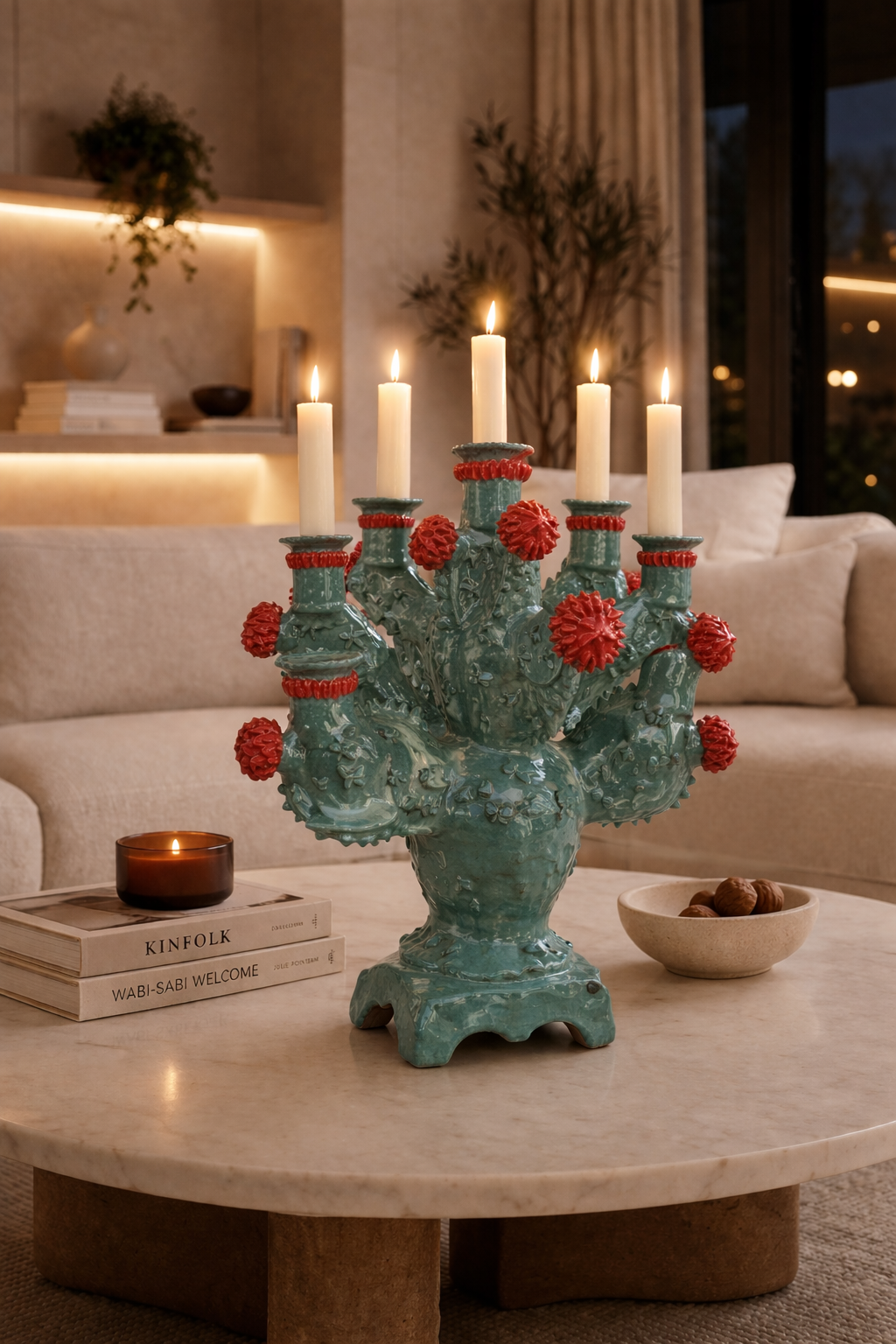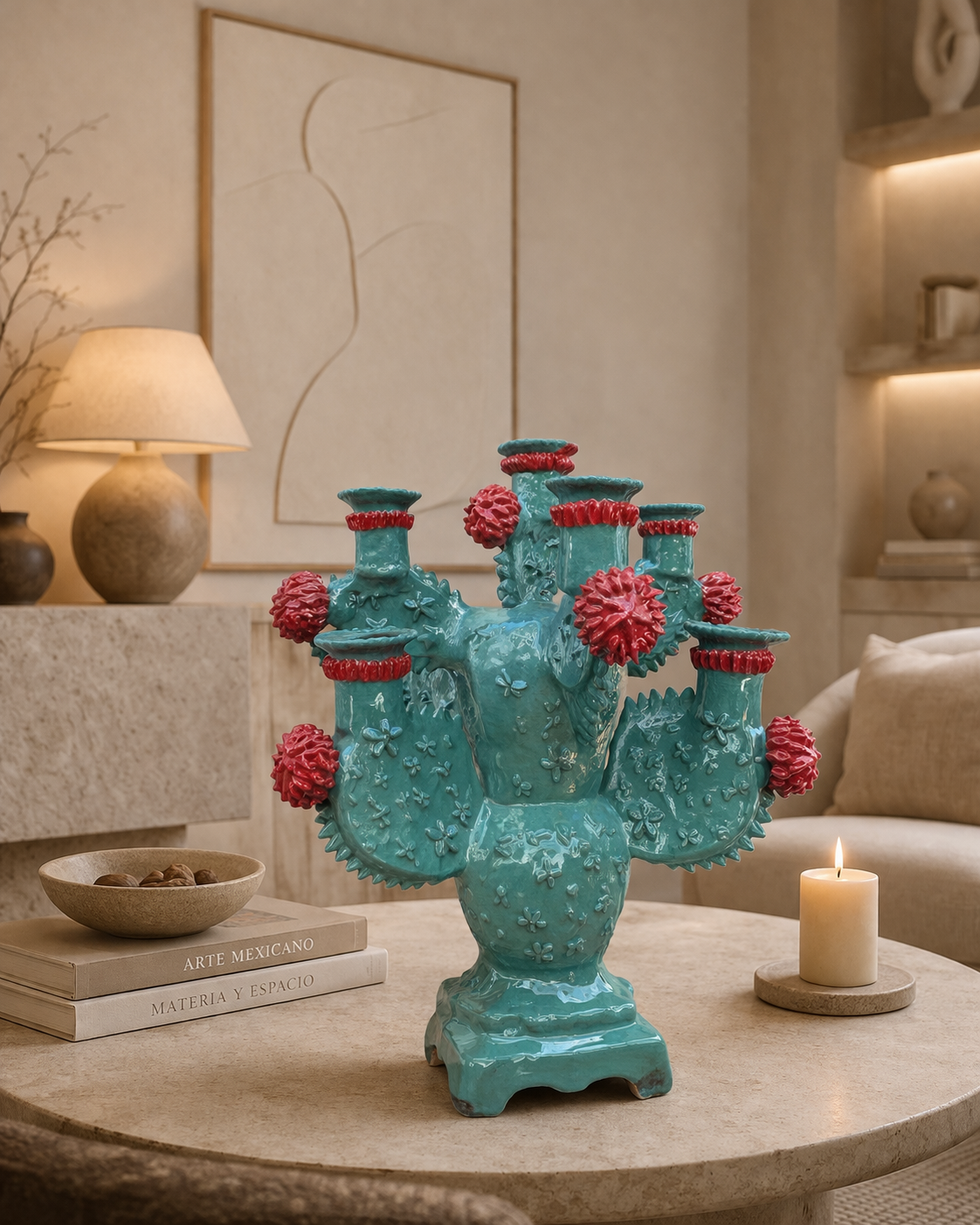 Elevate your home decor with our exquisite large candle holder, skillfully handcrafted from clay in the heart of Michoacan. This piece seamlessly blends modern aesthetics with a touch of vintage charm, making it a versatile centerpiece for any home.