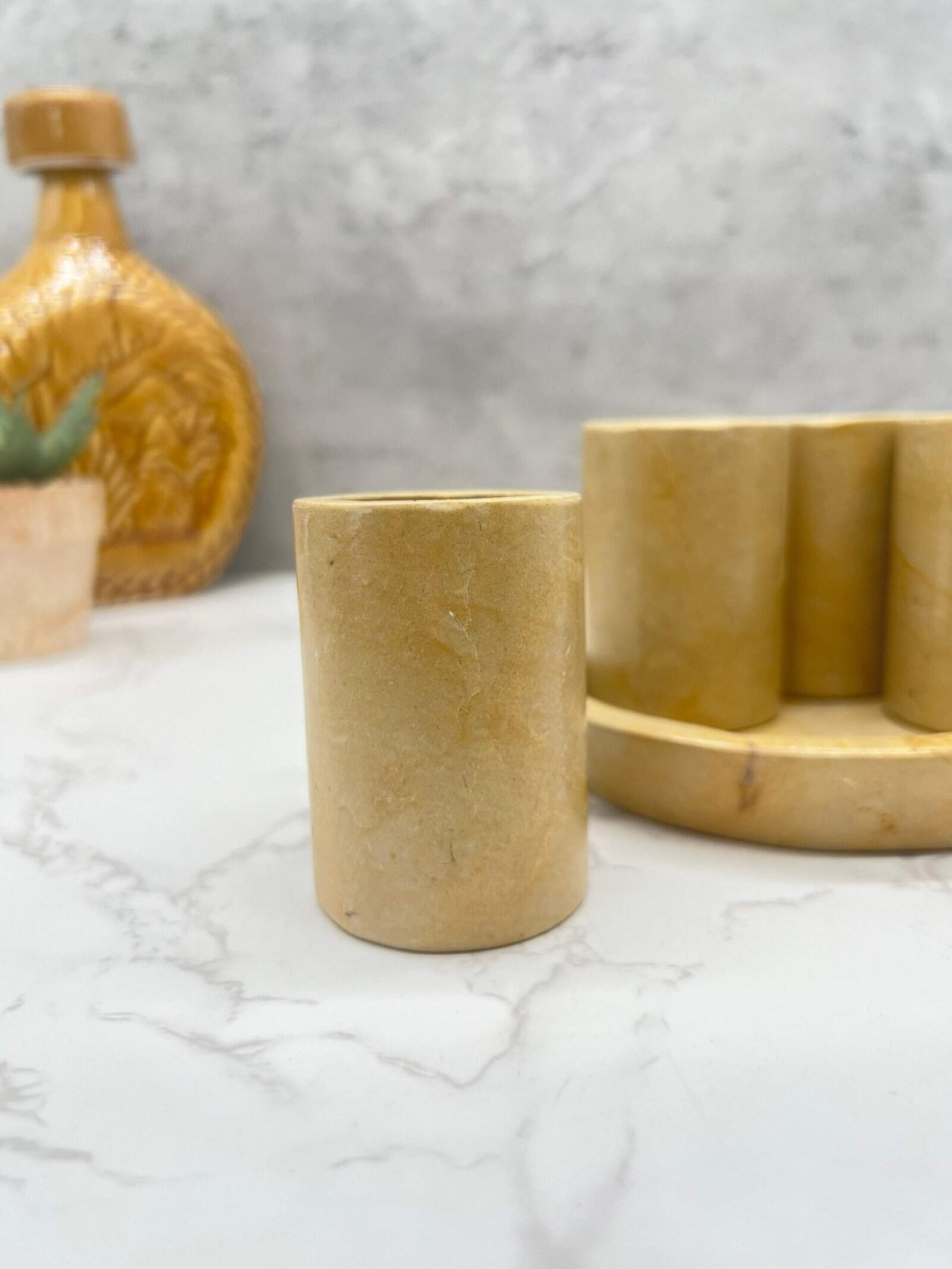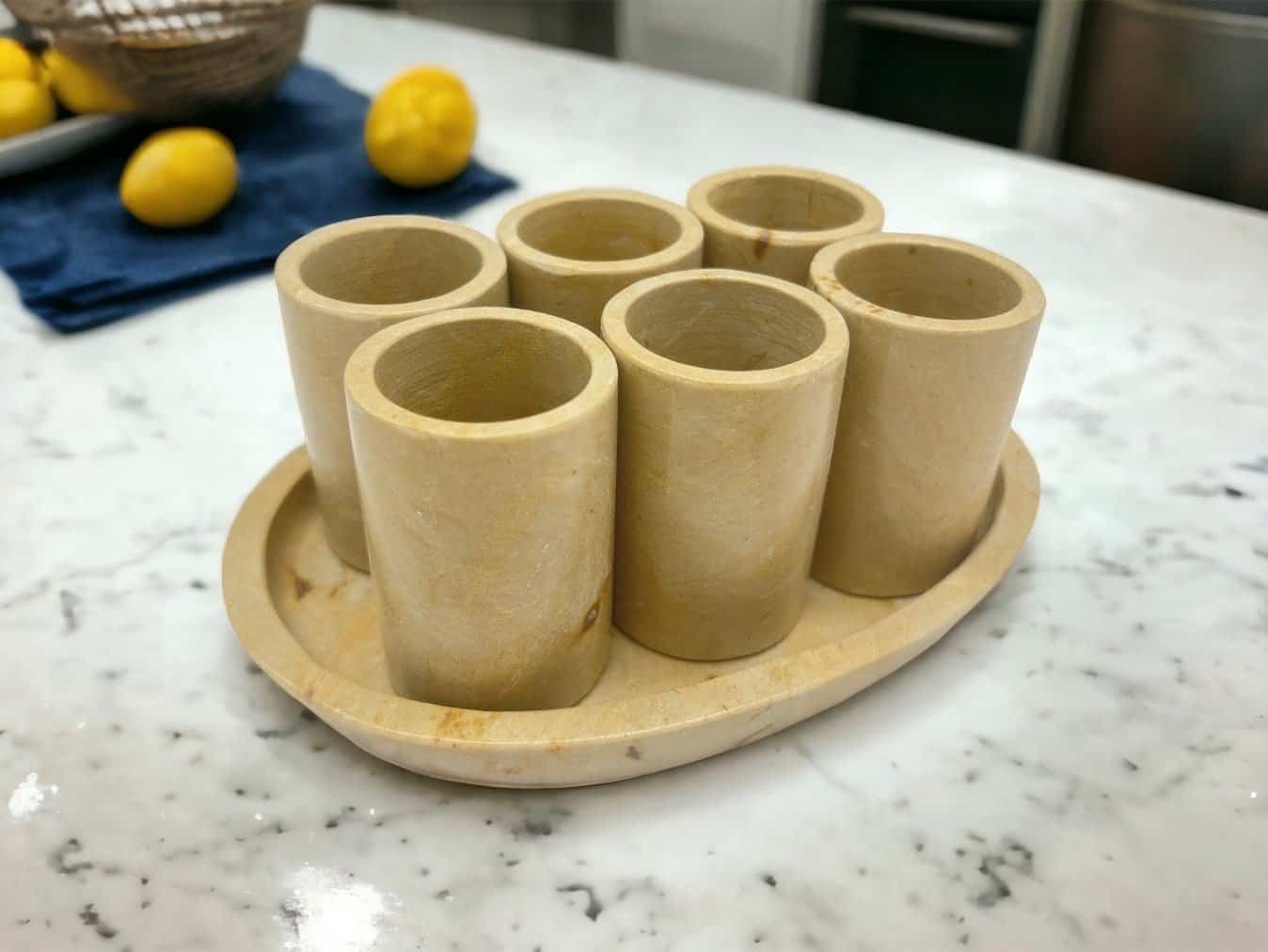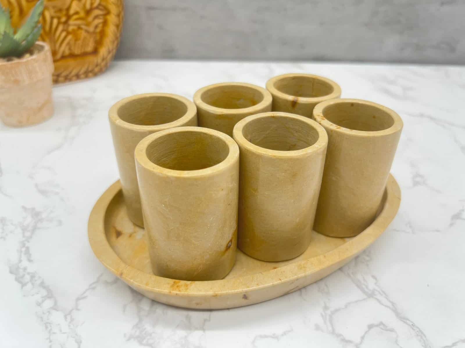 Characteristic: – Stone material in yellow – Hand carved – 1.25 oz Dimension: Shot Glass: Height 2.5” Wide 1.55” Tray: Long 7” Wide 4,8”