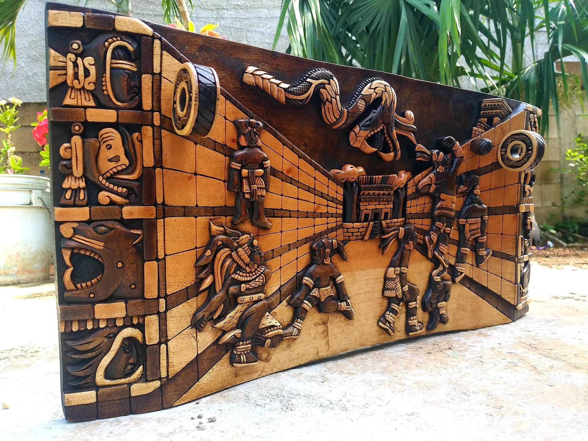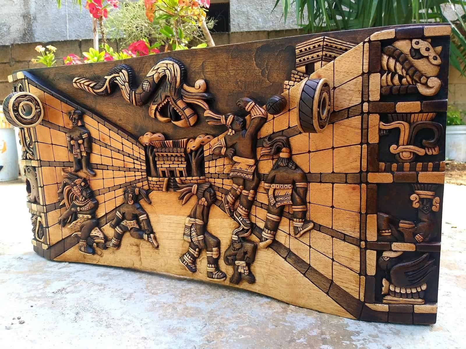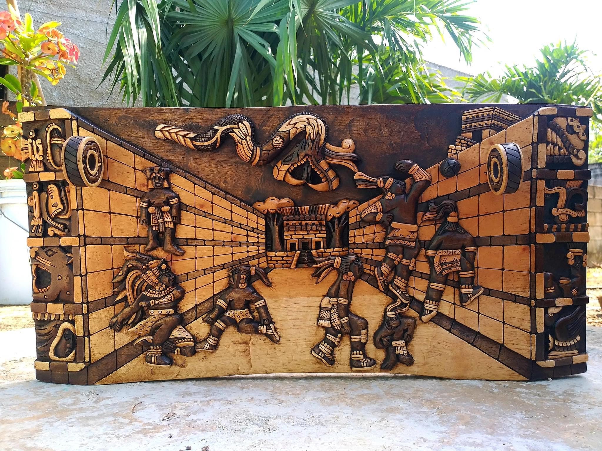 “ Mexican painting for wall or table, inspired by Mayan art – ball game – Quetzalcoatl ” Hand Carved by Mexican Artisans, 3D Wood Carving Design.